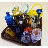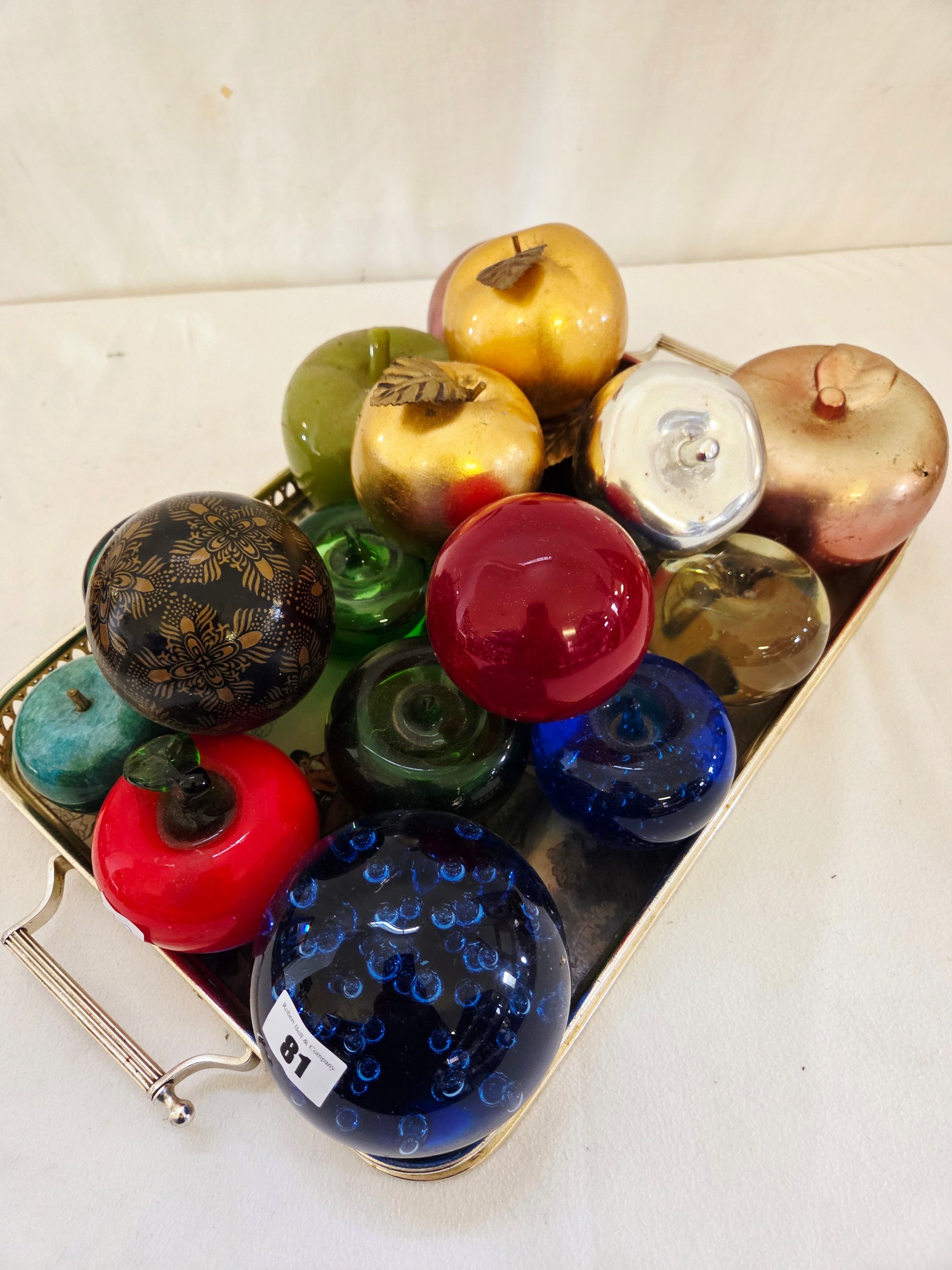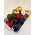 Tray of coloured glass, ceramic and other weights, dumps and apples