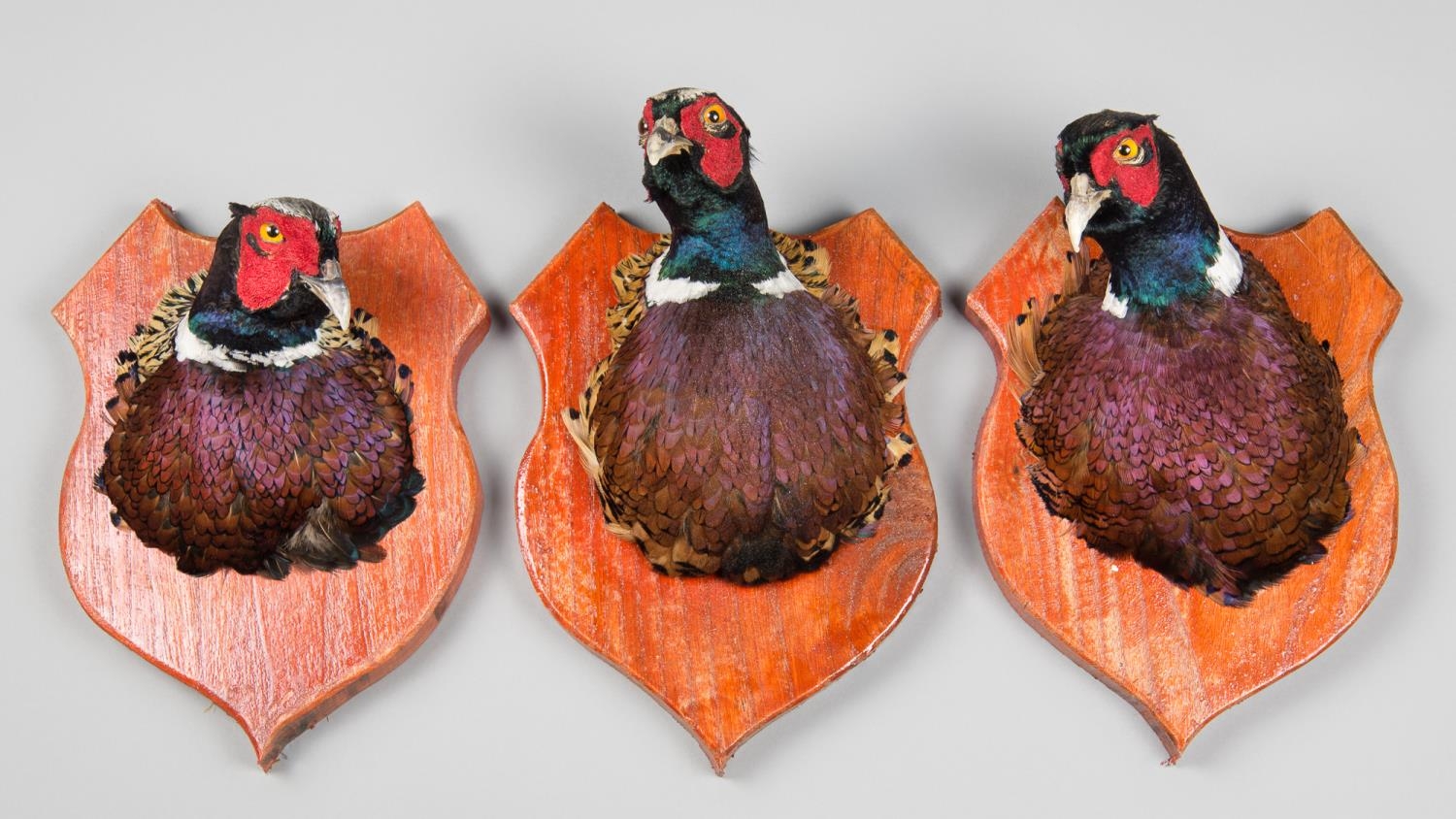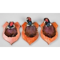 A GROUP OF THREE LATE 20TH CENTURY PHEASANT HEADS UPON WOODEN SHIELDS.
