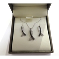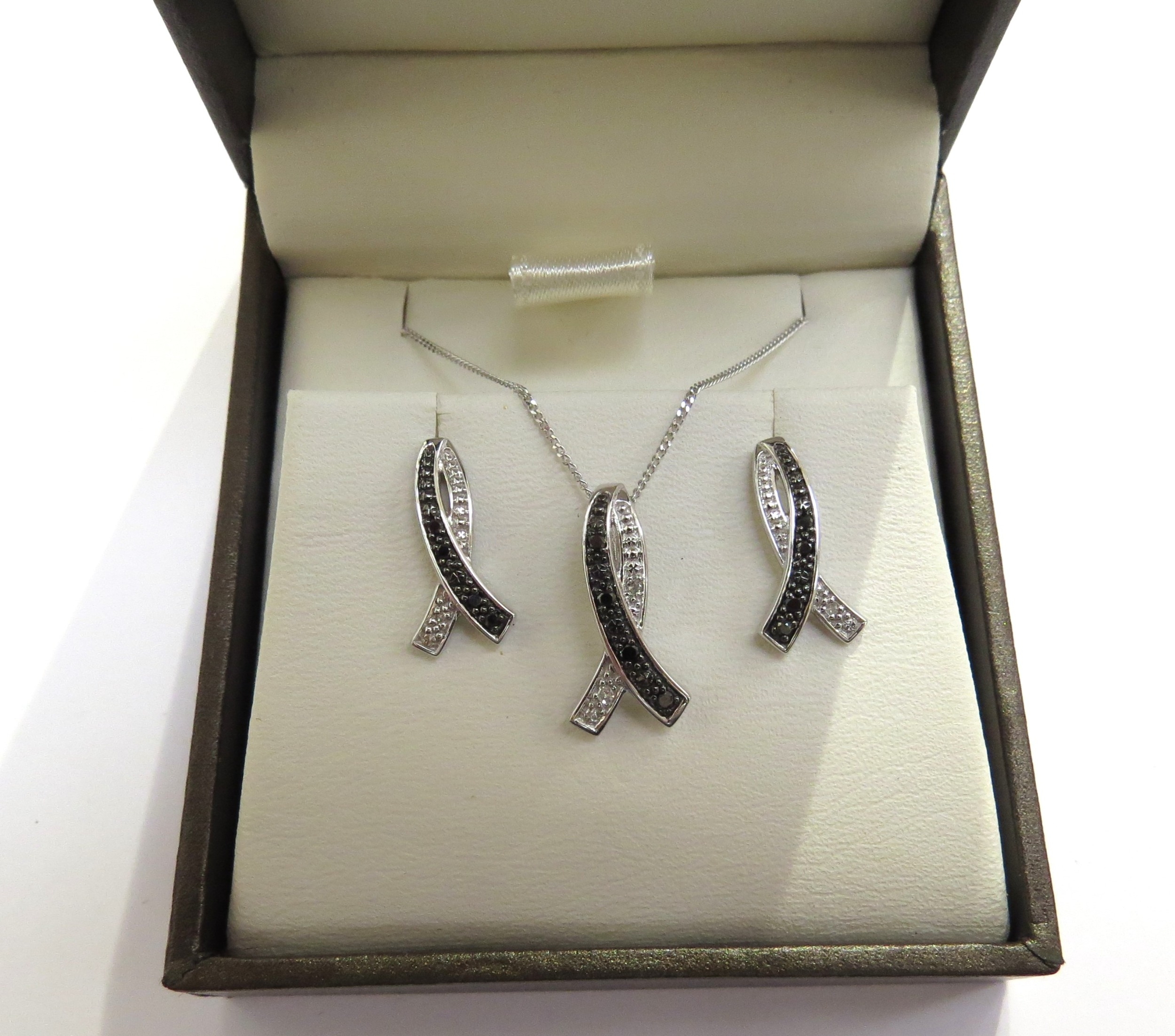 A 9ct white gold black and white diamond ribbon pendant hung on 9ct white gold chain, 46cm long with a pair of matching stud earrings, 3g, in original Goldsmiths retail box