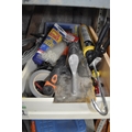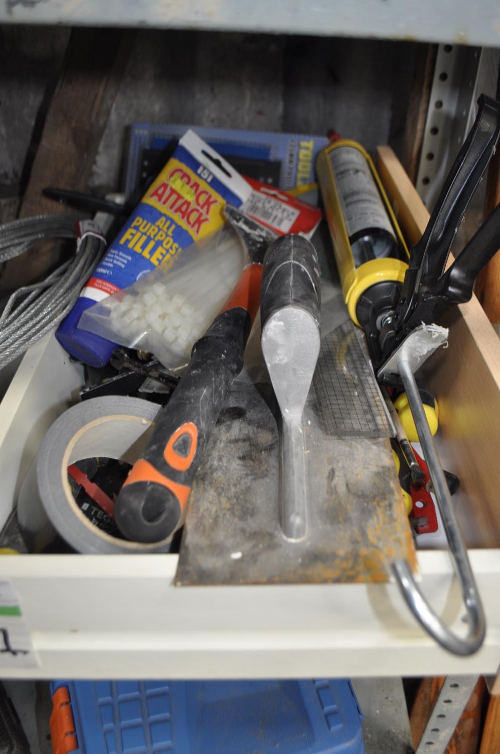 DRAWER FULL OF TOOLS INC FLOATS, SCRAPERS, TAPE, SILICON GUN ETC