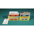 2 Matchbox Series. No.66 Greyhound Coach. In silver with amber glazing, with black plastic wheels. Pus a No.68 Mercedes Coach in orange and white, with black plastic wheels. Both boxed, minor wear. Vehicles VGC-Mint. £50-70