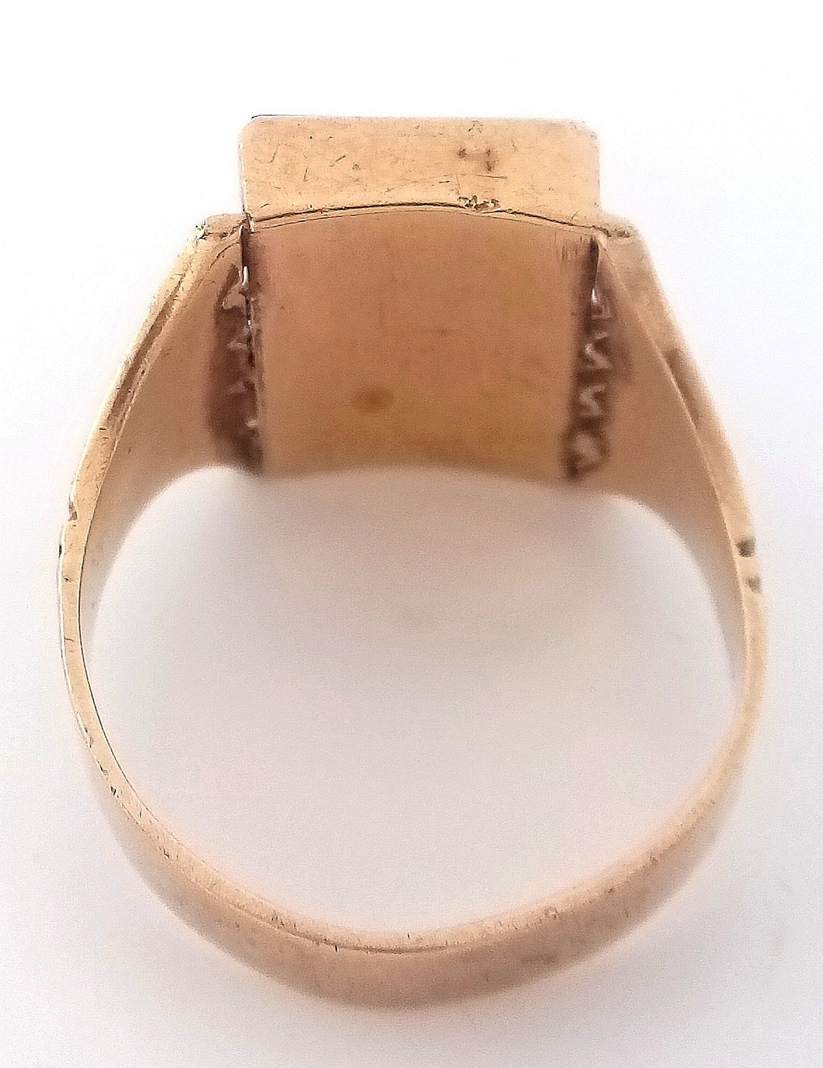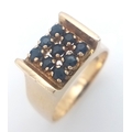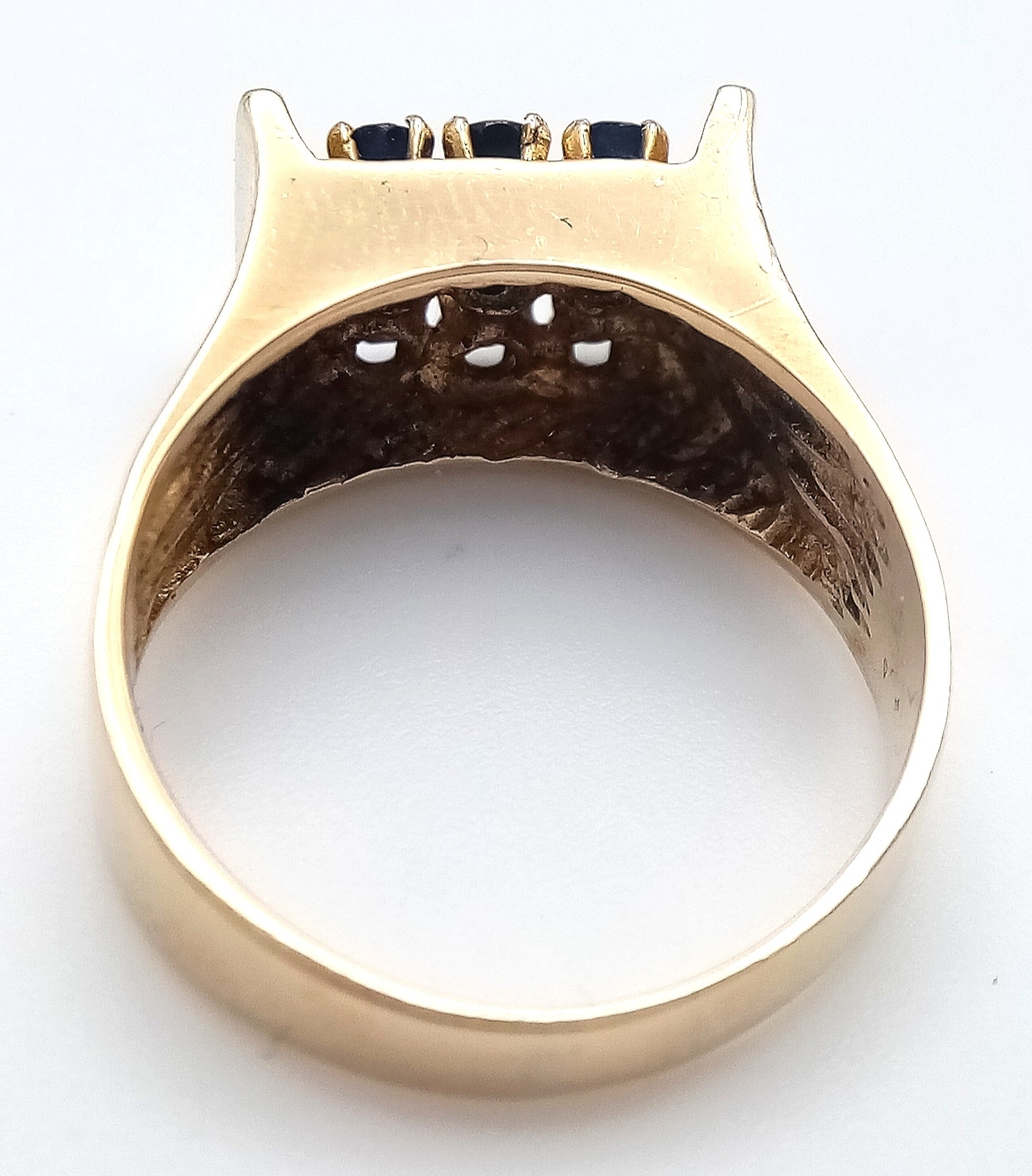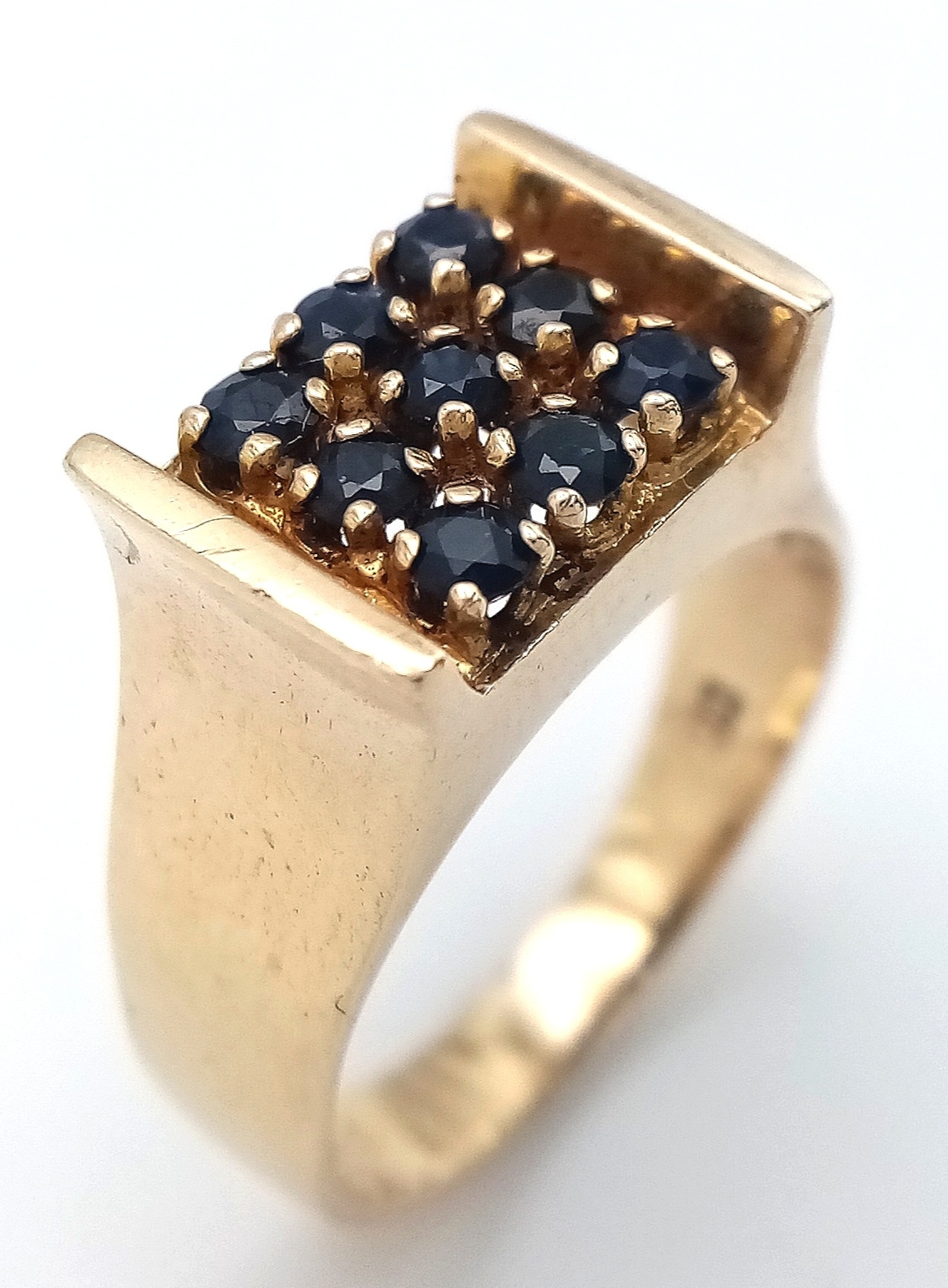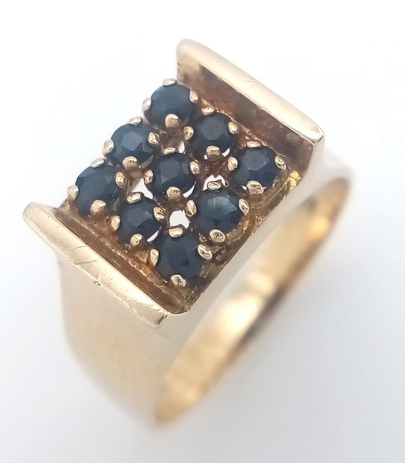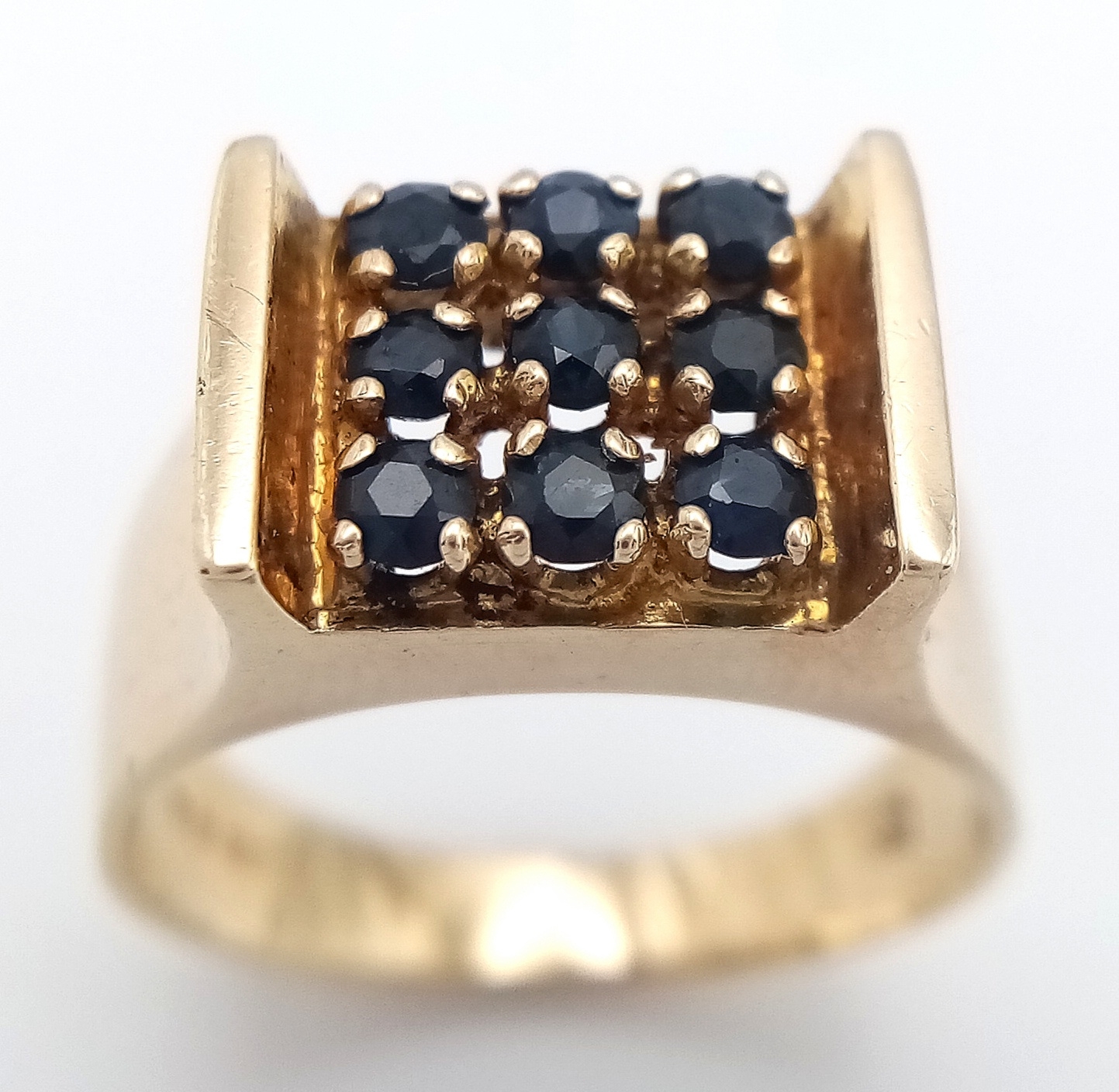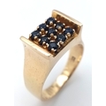 Beautiful 9 CARAT GOLD RING WITH SAPPHIRES to top IN MODERNIST SETTING. 4.35 Grams. Size M-M 1/2.