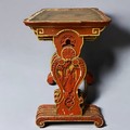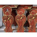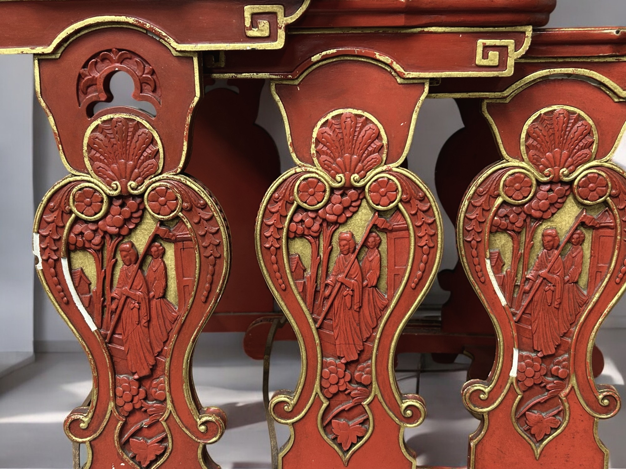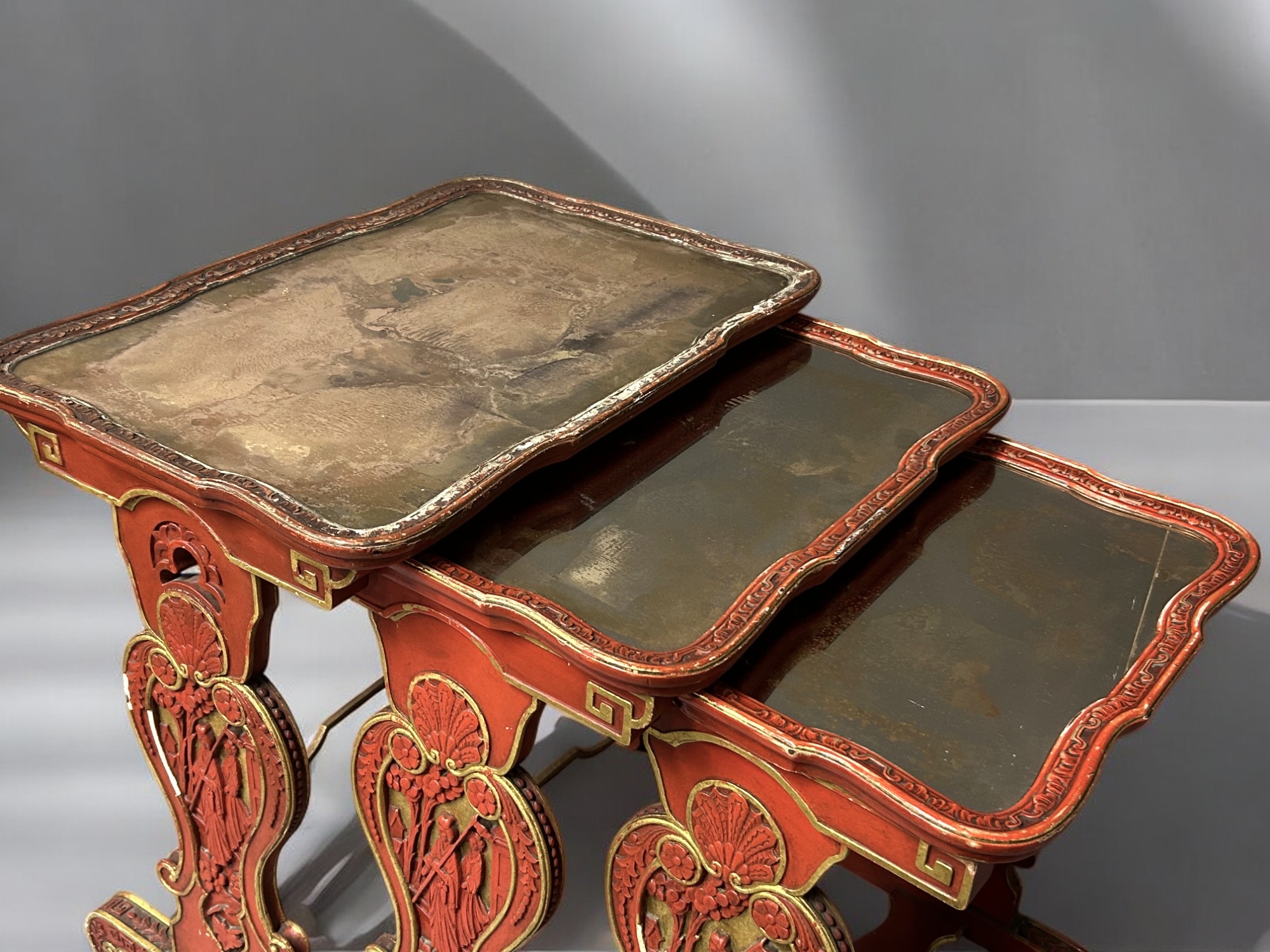 Carved scenes in cinnabar style. Distressed mirror tops.