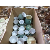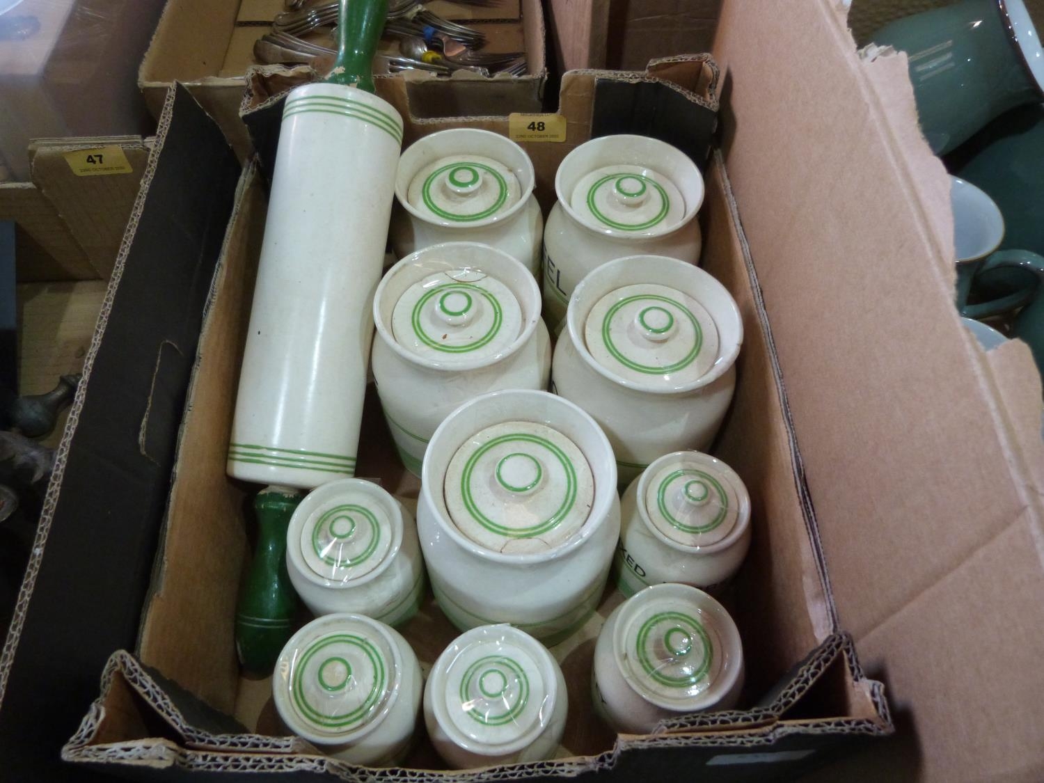 A collection of ten various 'Kleen Kitchenware' green banded storage jars with a rolling pin. c.1950s