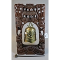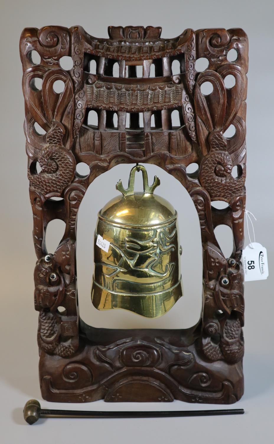 Chinese brass temple bell in carved and pierced dragon design wooden frame, with striker. 42cm high approx.