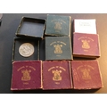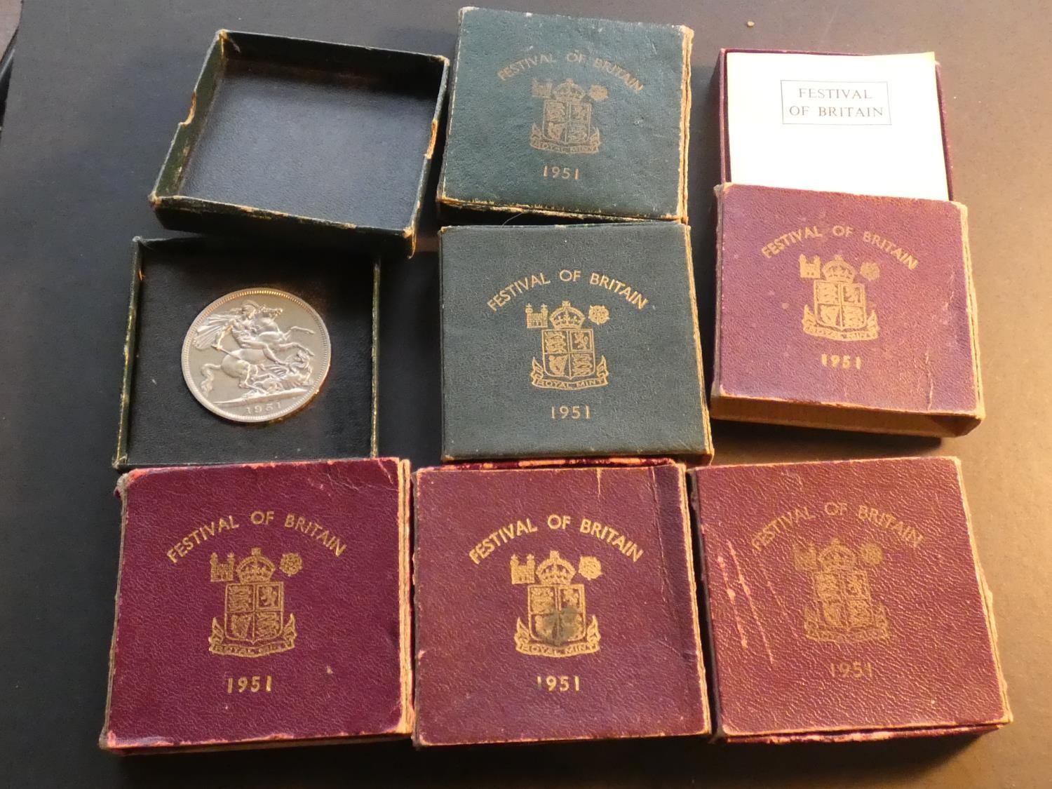 UNITED KINGDOM. Crown. 1951 Festival of Britain x7, including 3 in green boxes and 4 in maroon boxes, three lacking certificates. UNCs, occasional marks. (7)