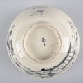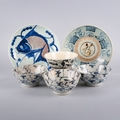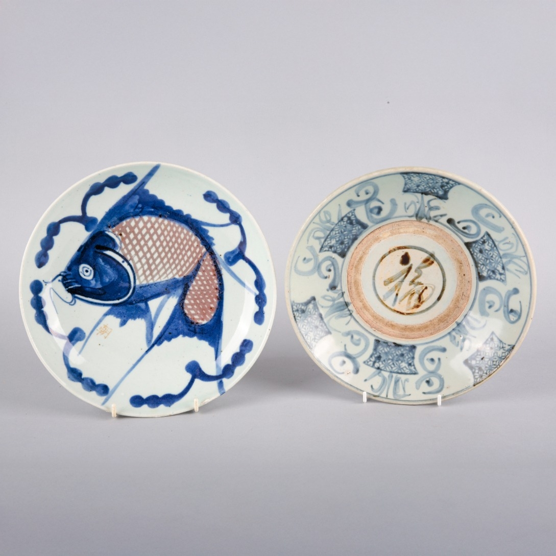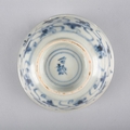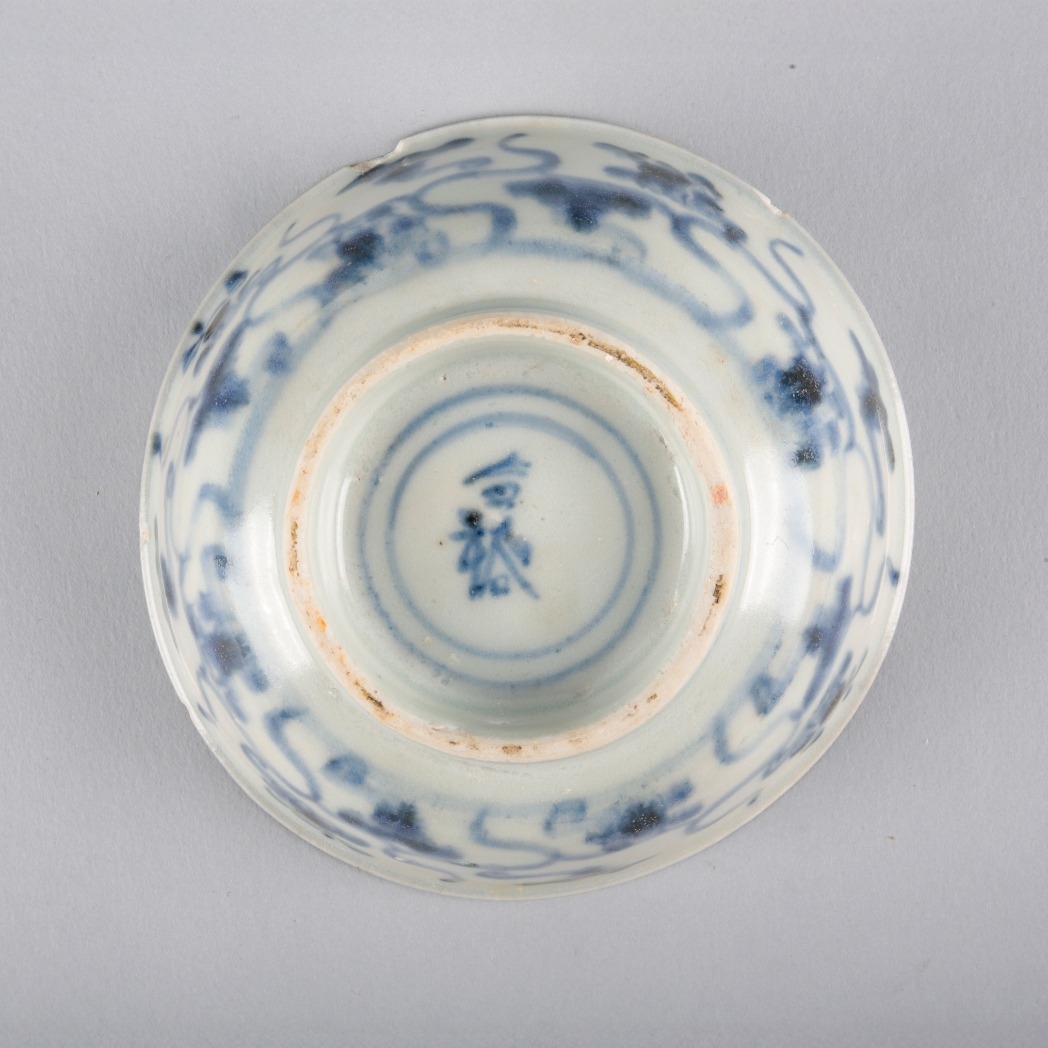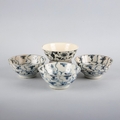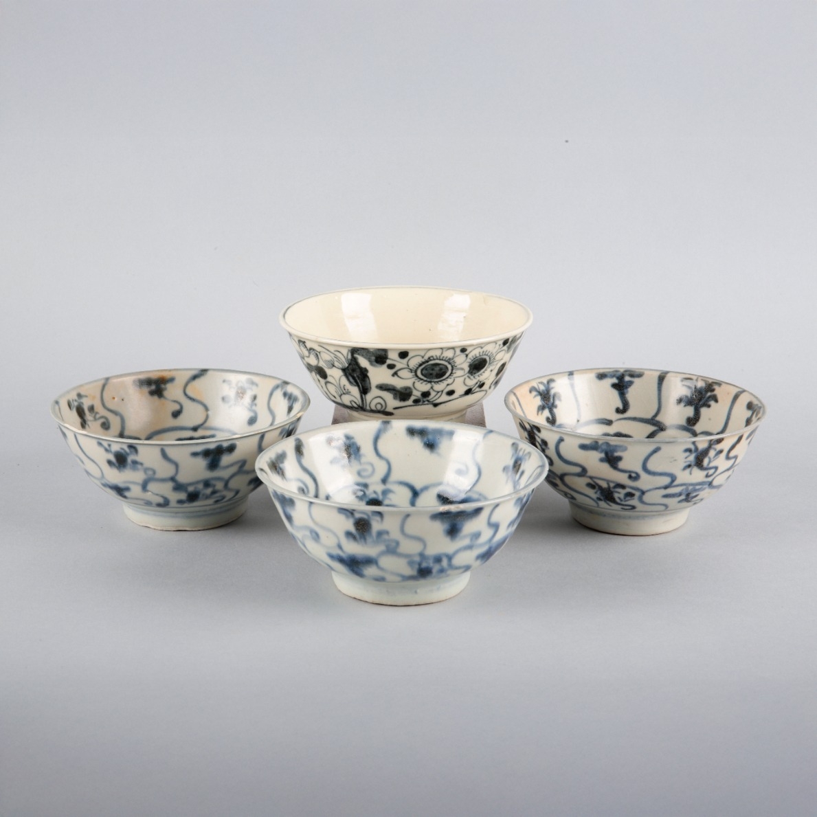 Qing dynasty, all decorated with stylised flowers and foliage, 7.5cm, 7cm and 7cm high; together with another similar blue and white bowl, 7cm high; a wide brimmed bowl, decorated with a fish, 26cm diameter; and another similar provincial bowl, 25cm diameter (6)