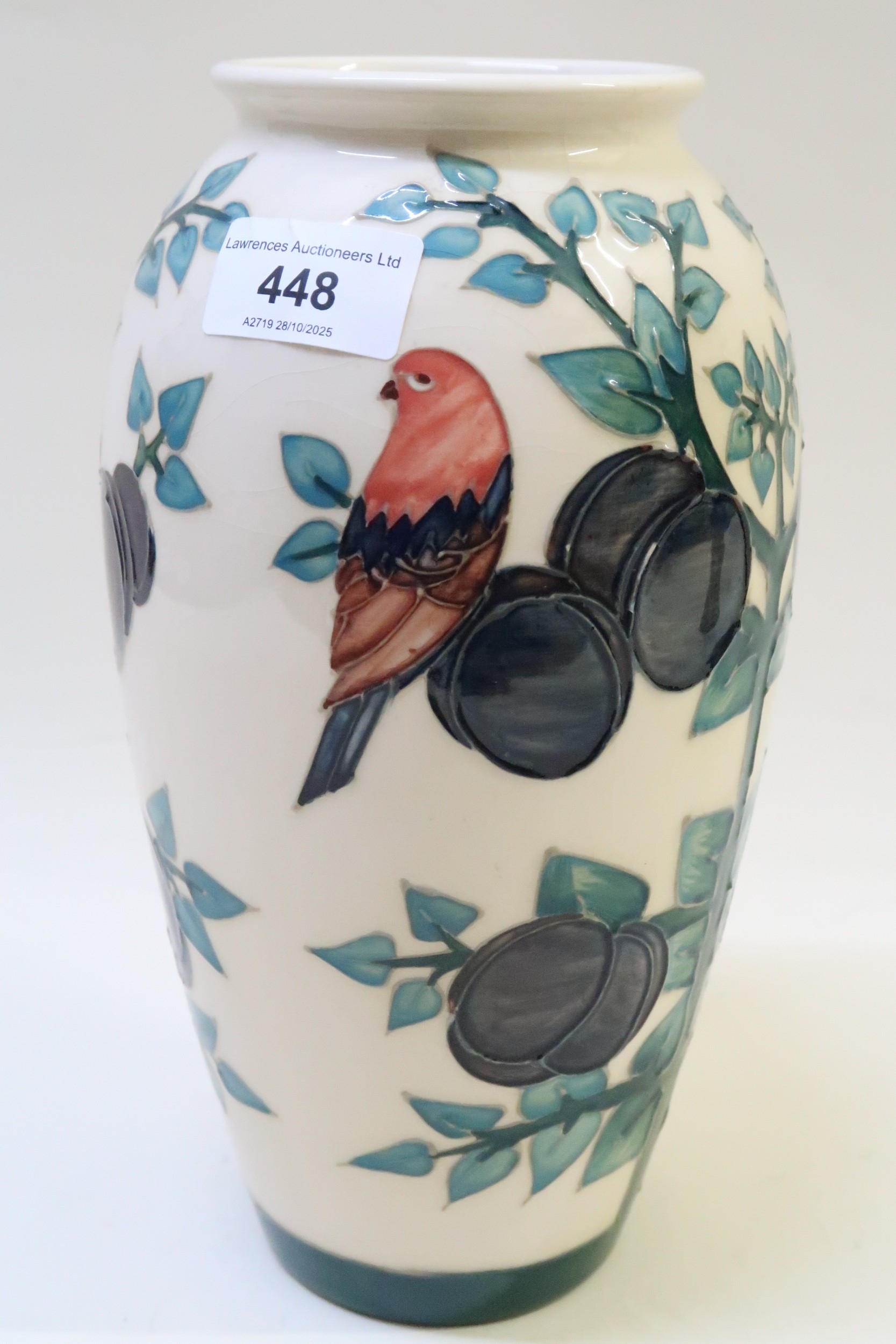 Moorcroft Plum, Tree and Bird pattern baluster form vase by Sally Tuffin, 25cm high