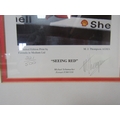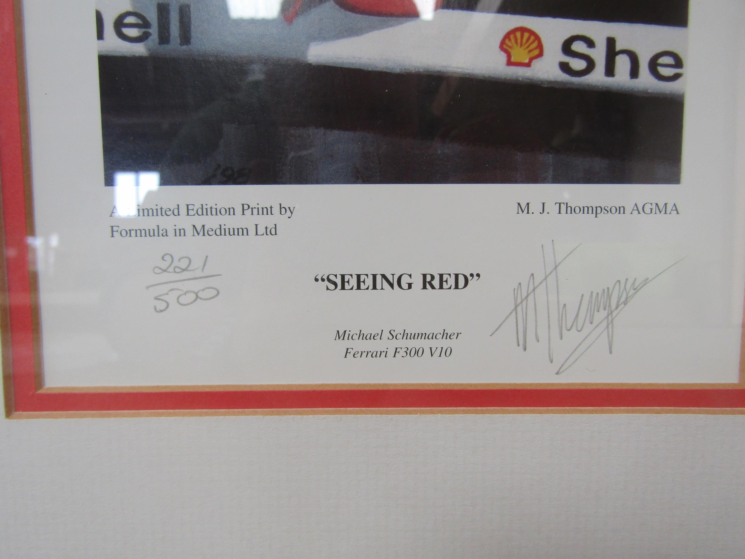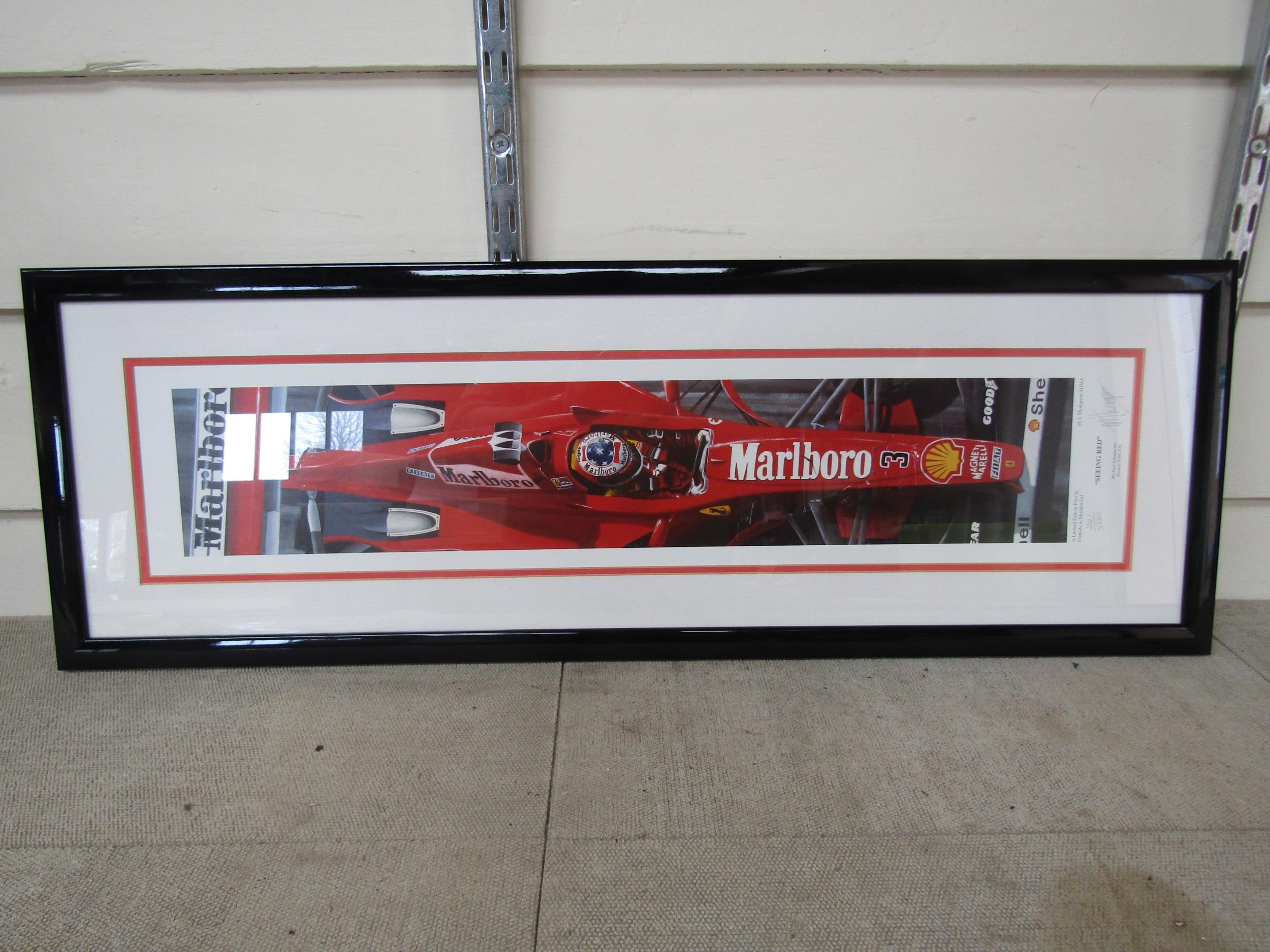 A framed and glazed limited edition print "Seeing Red" signed by artist M.J. Thompson, No. 221/500. Frame size 29cm x 85cm
