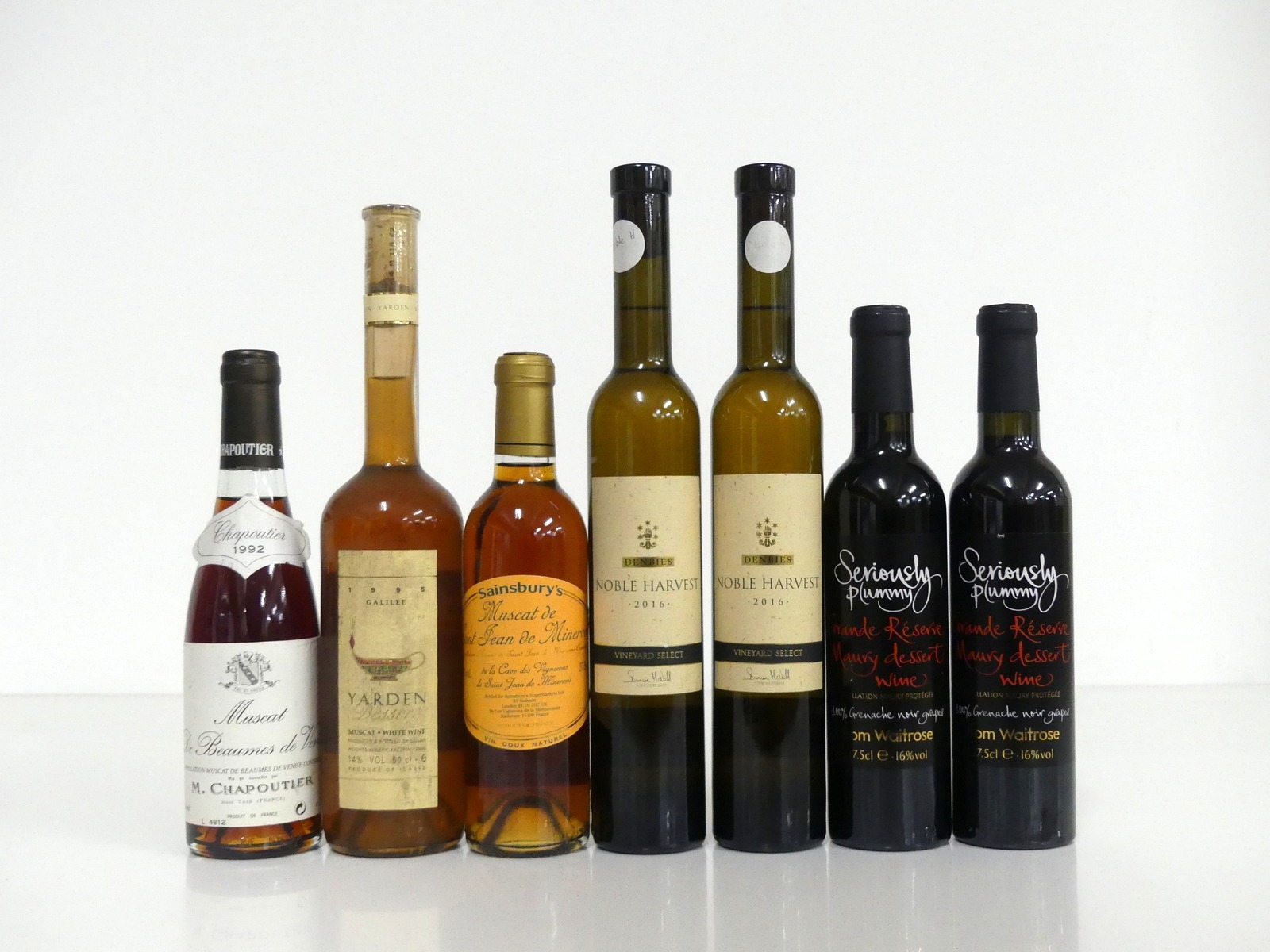 1 hf bt Muscat de Beaumes de Venise 1992 Chapoutier 1 50-cl bt Yarden Dessert Muscat Galilee 1995 bs 1 hf bt Sainsburys Muscat de Saint Jean de Minervois Vintage Unknown 2 hf bts Denbies Vineyard Select Noble Harvest 2016 2 hf bts Waitrose Seriously Plummy Grande Reserve Maury Dessert Wine Vintage Unknown Above 1 50-cl bottle and 6 hf bottles