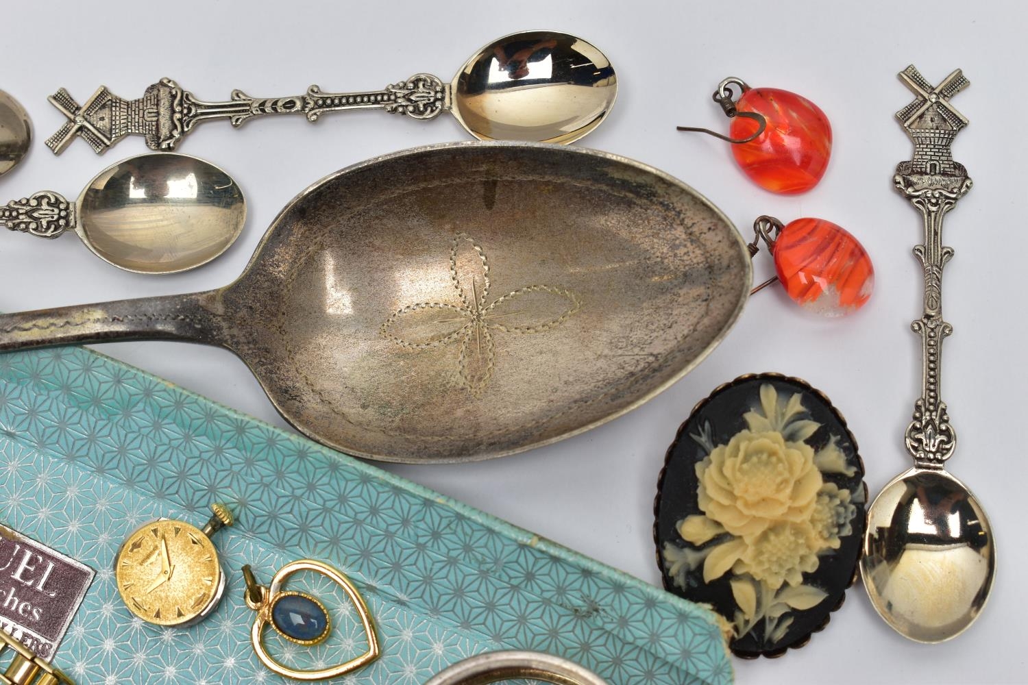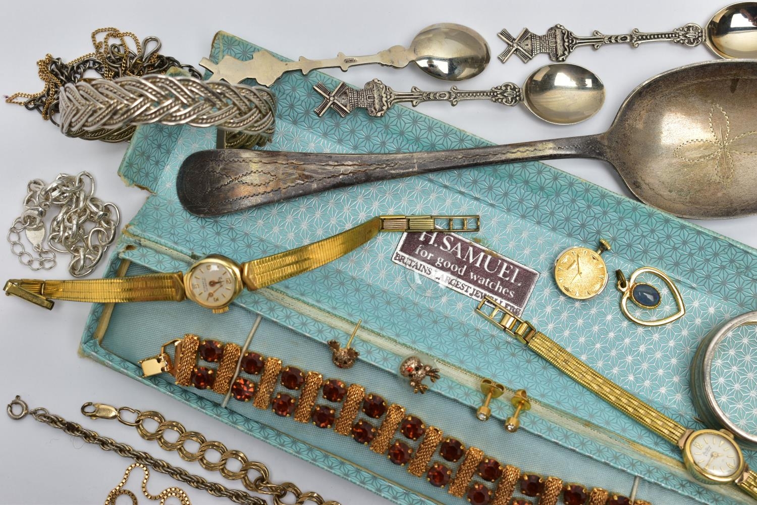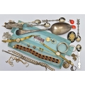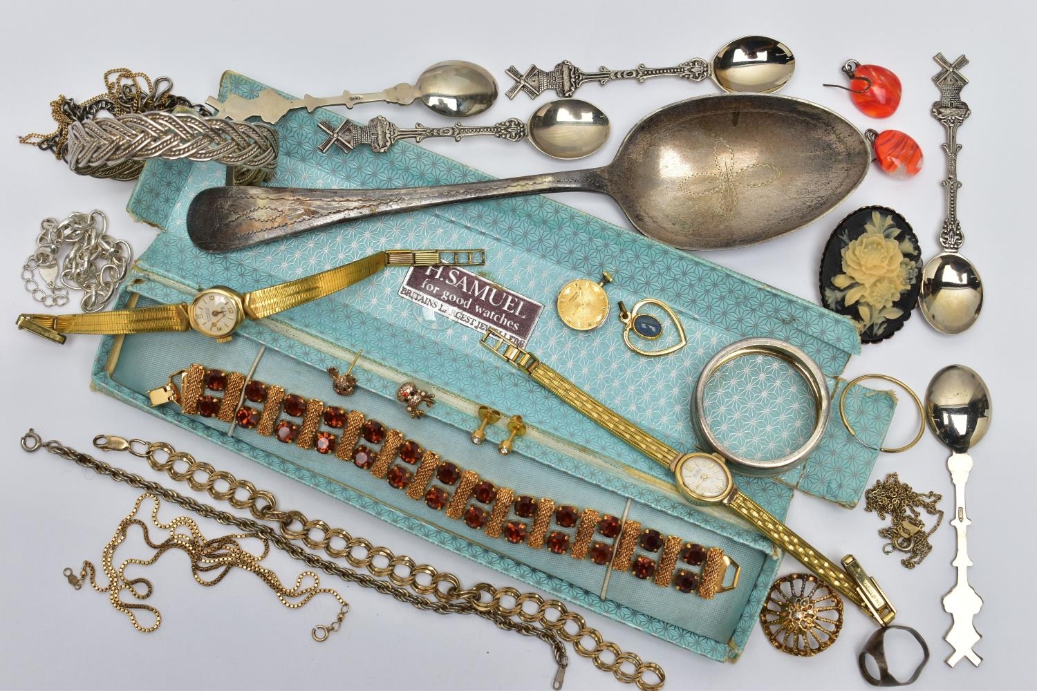 A BAG OF ASSORTED ITEMS, to include a yellow metal paste set bracelet, two ladies gold plated wristwatches, two yellow metal fine chains, collectable teaspoons, an EPNS old English pattern serving spoon, costume earrings, bracelets, a single white metal napkin ring, a 'Longines' ladies watch movement etc