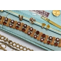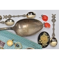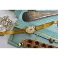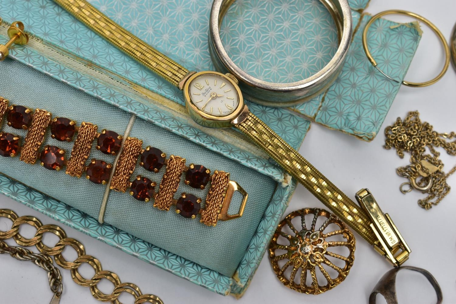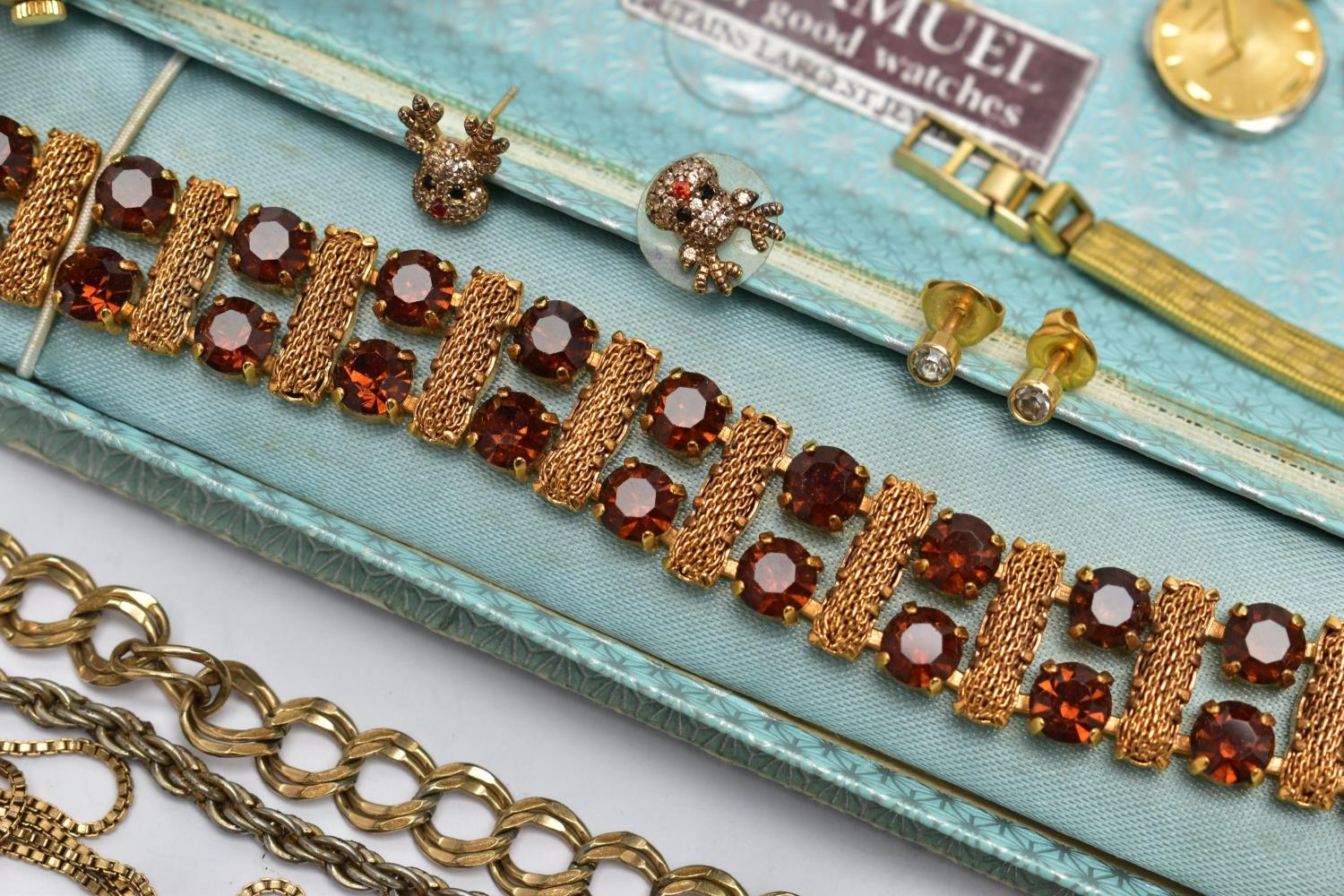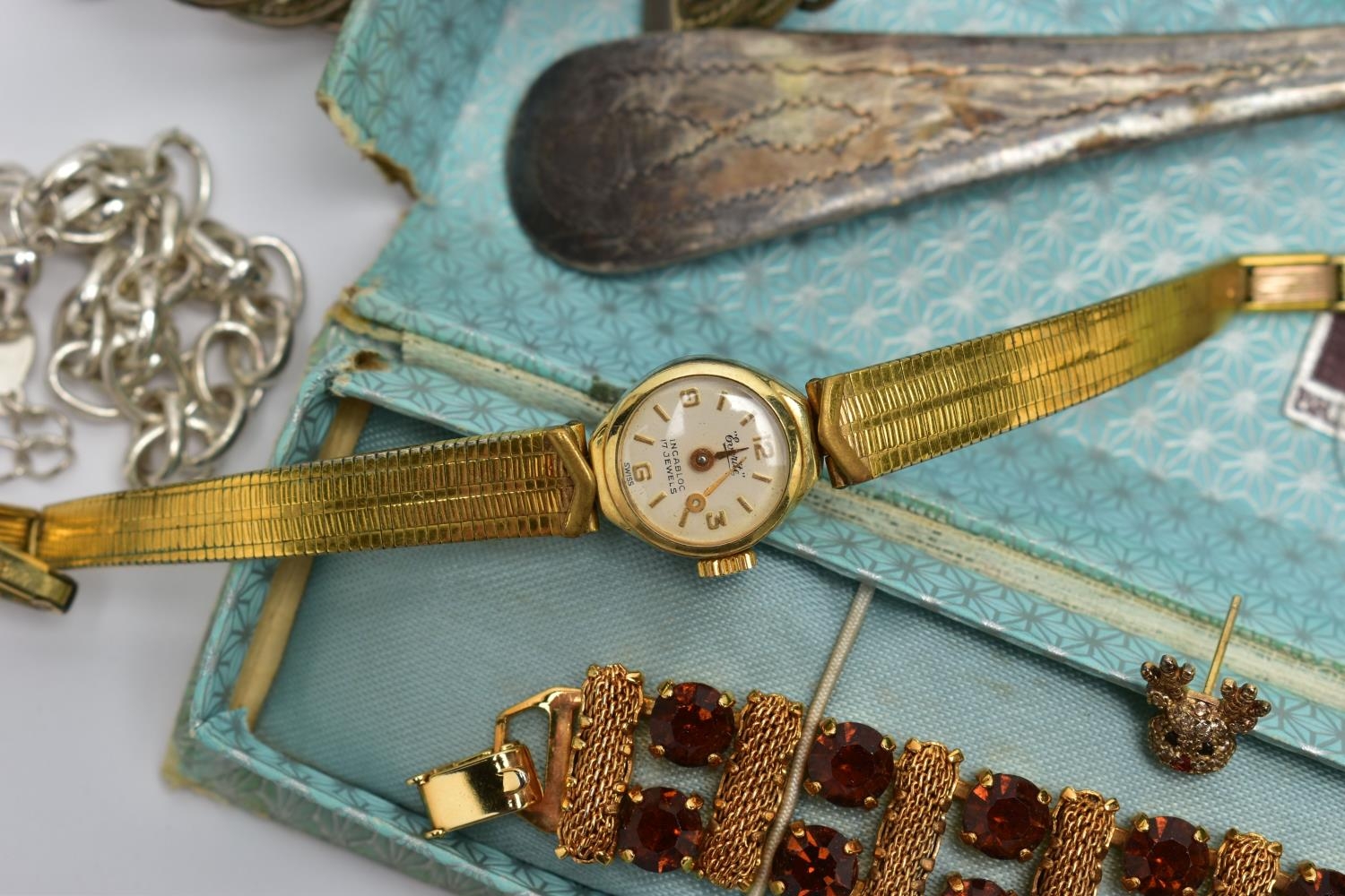 A BAG OF ASSORTED ITEMS, to include a yellow metal paste set bracelet, two ladies gold plated wristwatches, two yellow metal fine chains, collectable teaspoons, an EPNS old English pattern serving spoon, costume earrings, bracelets, a single white metal napkin ring, a 'Longines' ladies watch movement etc