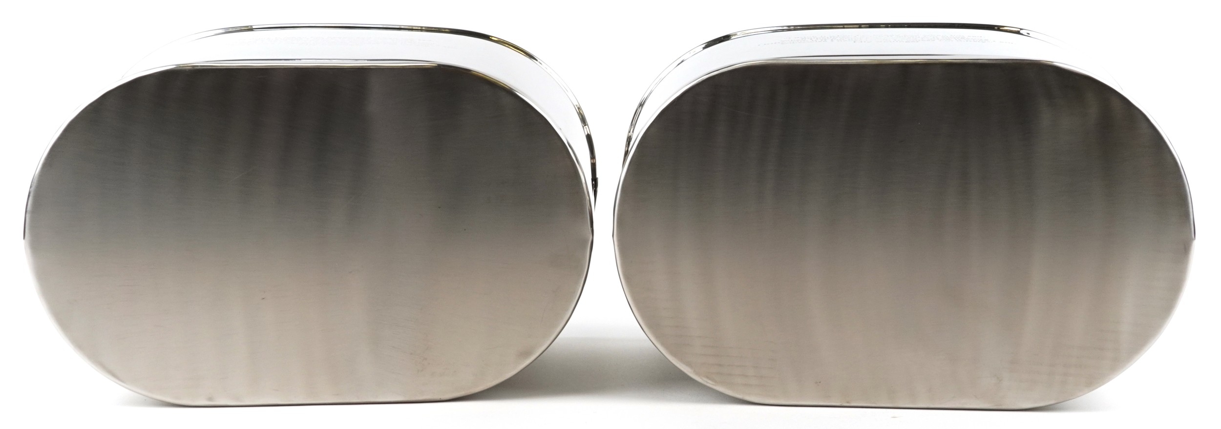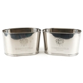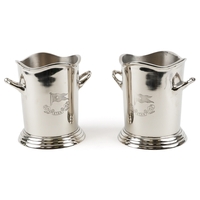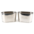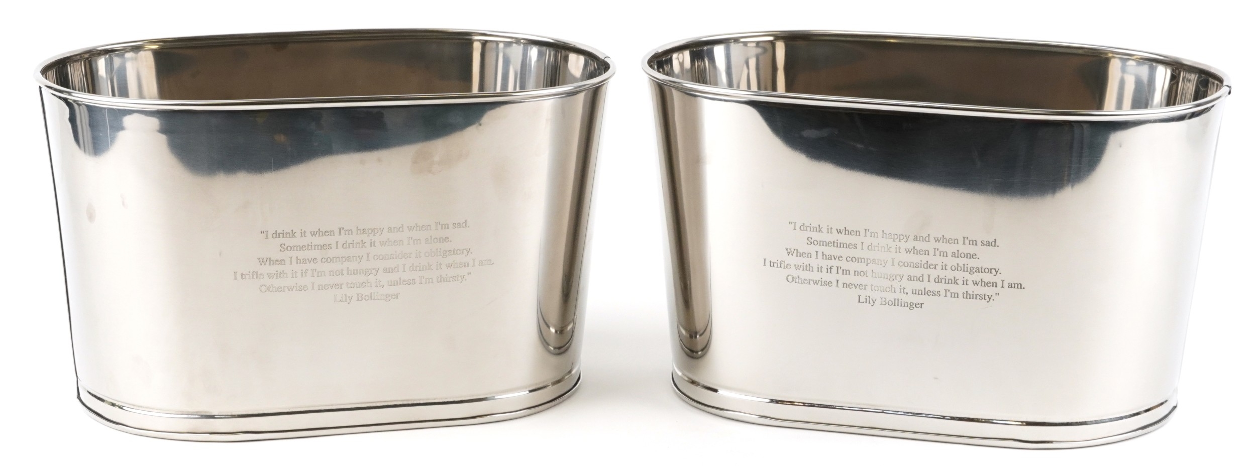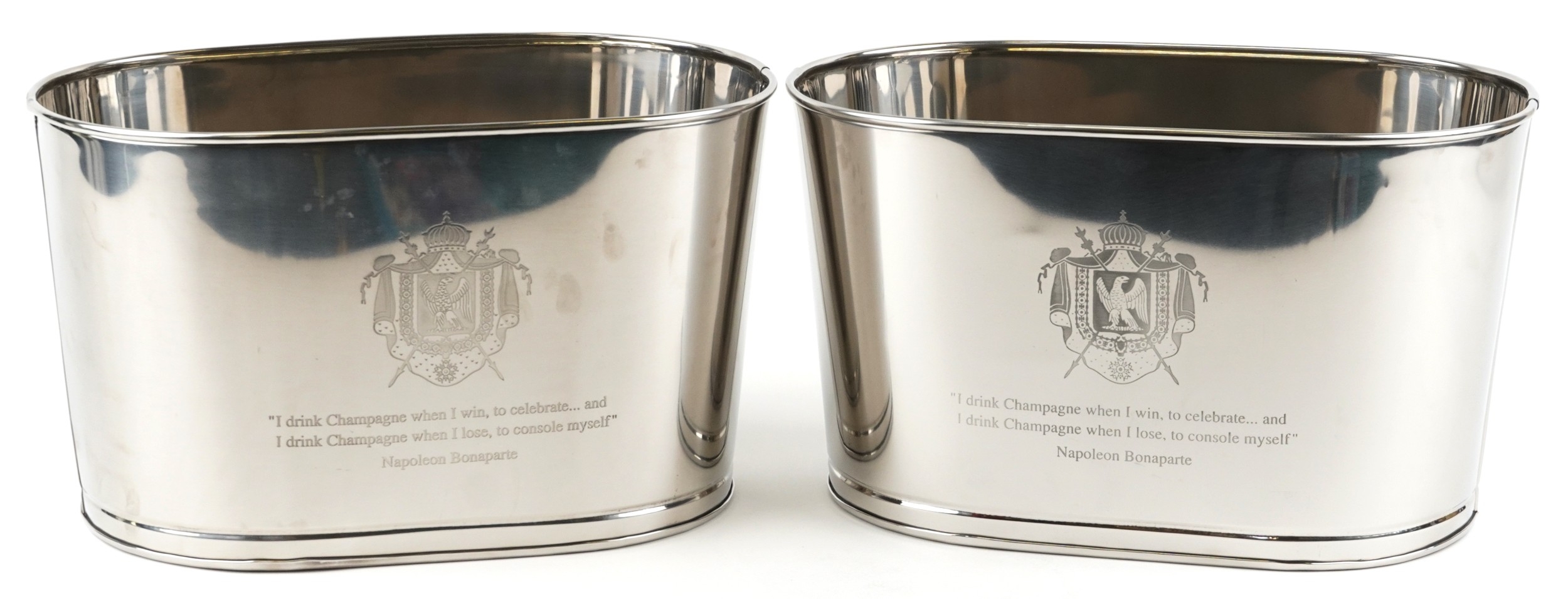 A pair of polished metal Champagne ice buckets with Napoleon Bonaparte and Lily Bollinger mottos, 26cm H x 44cm W x 28cm D.