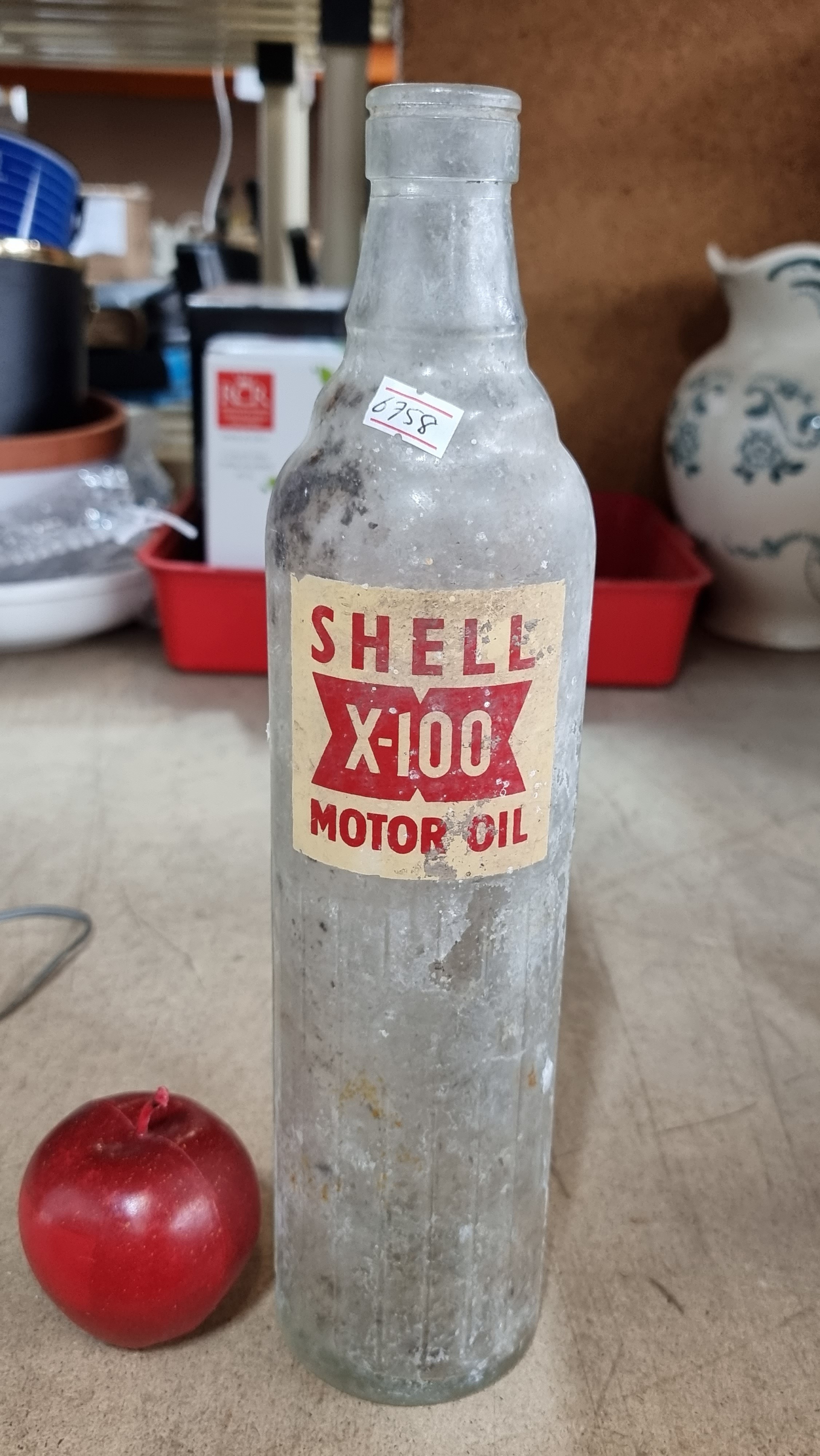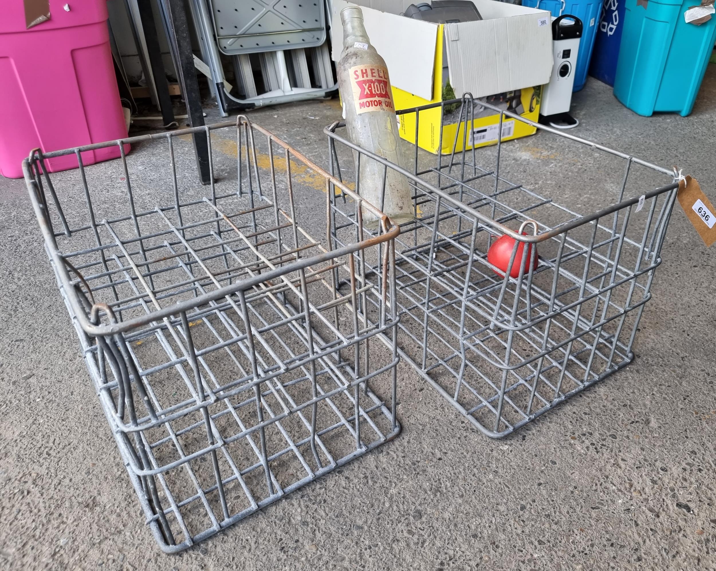 Two fabulous 1950's galvanised motor oil bottle crates. Including one large Shell oil bottle.