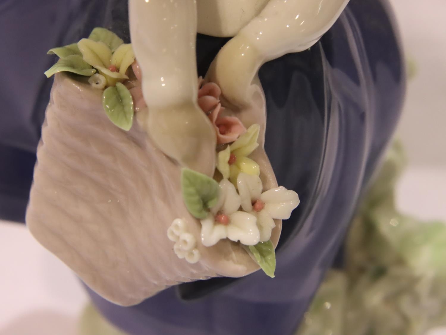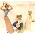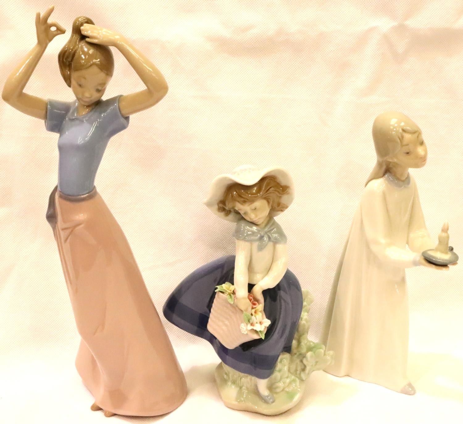 Lladro figurine girl with posy, a further Lladro girl with a chamberstick and a Nao girl, H: 26 cm. P&P Group 3 (£25+VAT for the first lot and £5+VAT for subsequent lots)