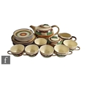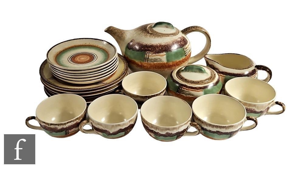 Siegfried Moller - A 1930s German tea set, decorated in the Spritz Decor, pattern no. 5935B with alternating bands of brown, green and tan over a cream ground, comprising tea pot, milk jug, lidded sugar bowl, six cups, six saucers and six side plates, pattern number 5869, painted marks to bases, tallest height 14.5cm. (21)