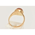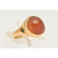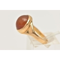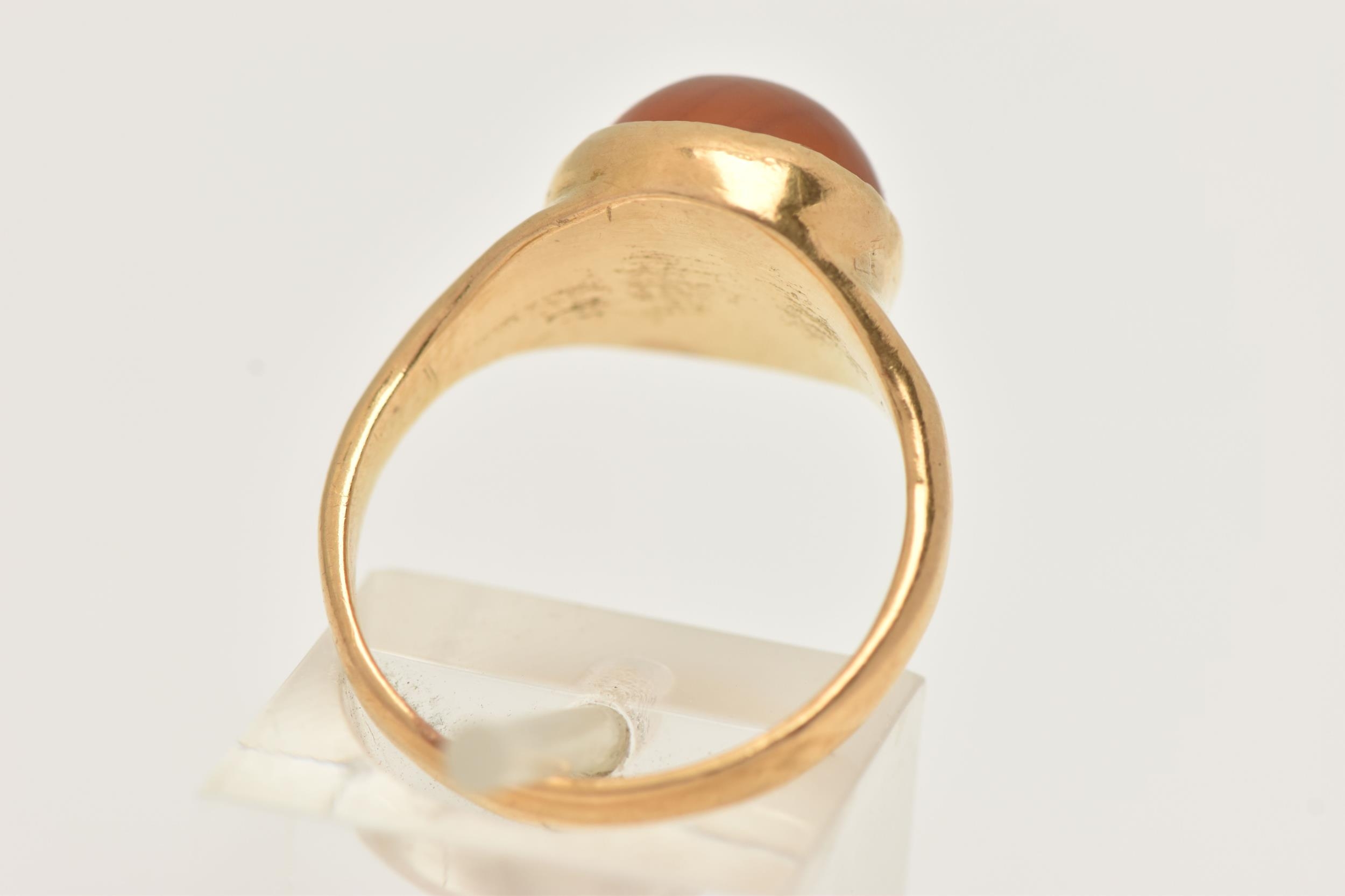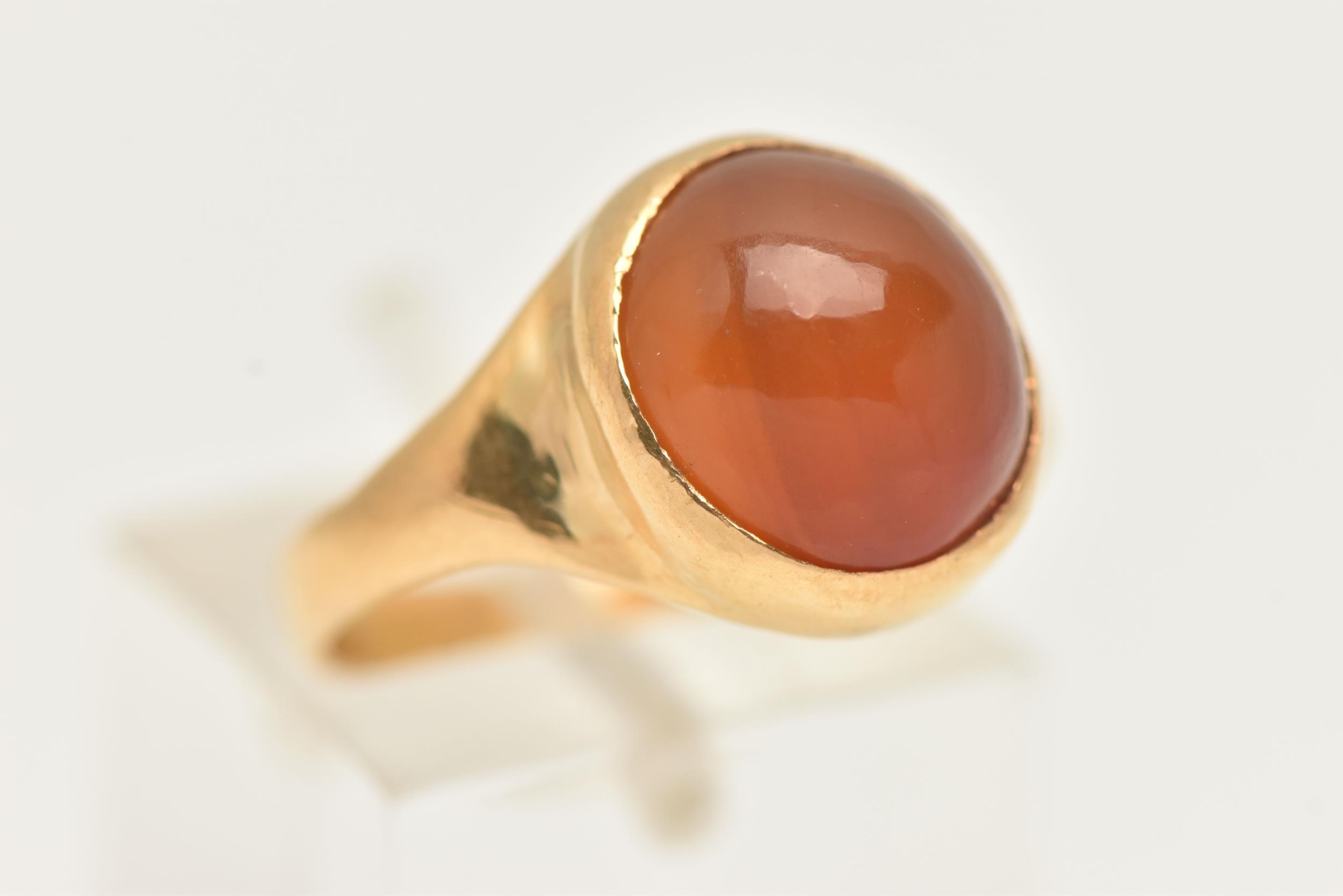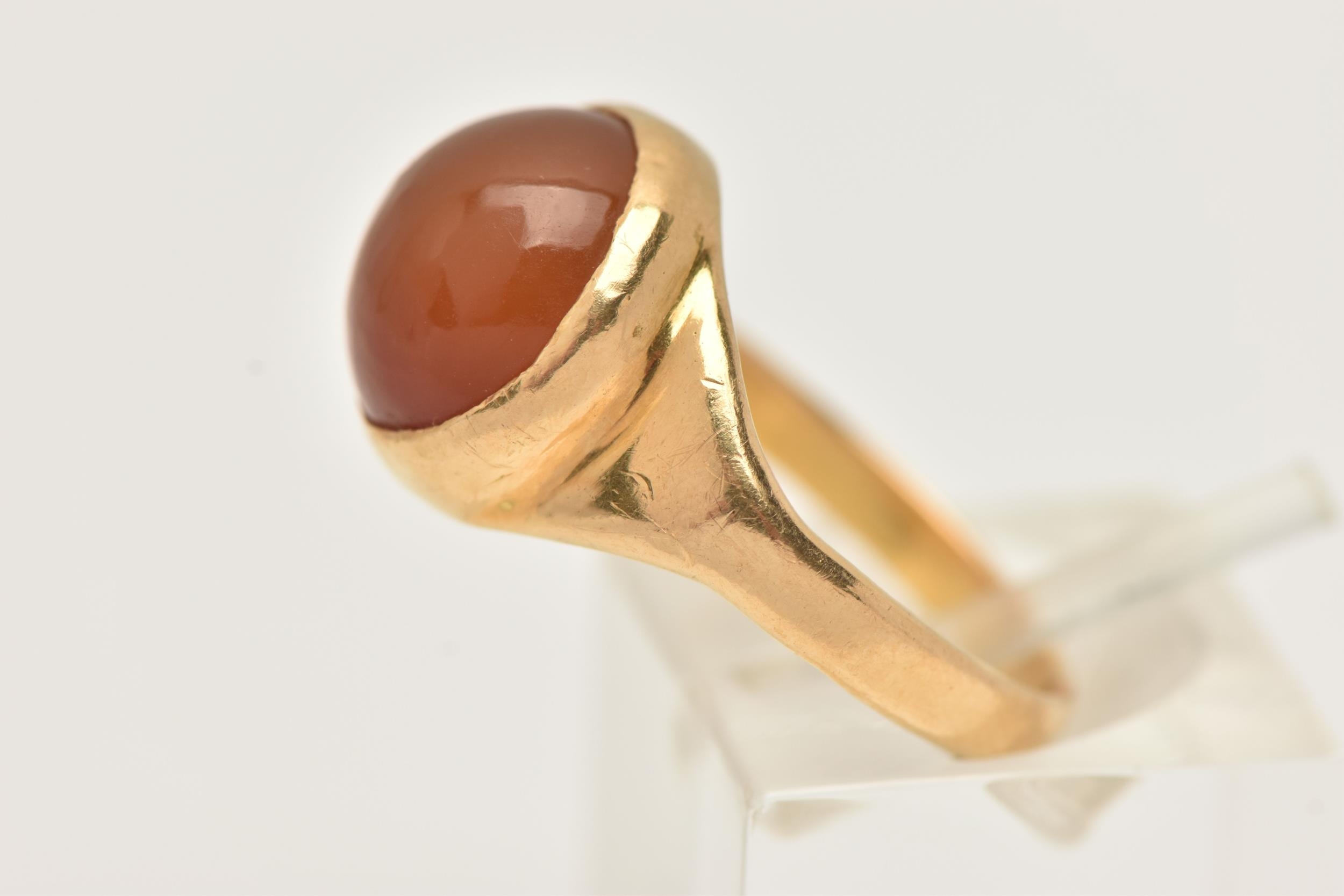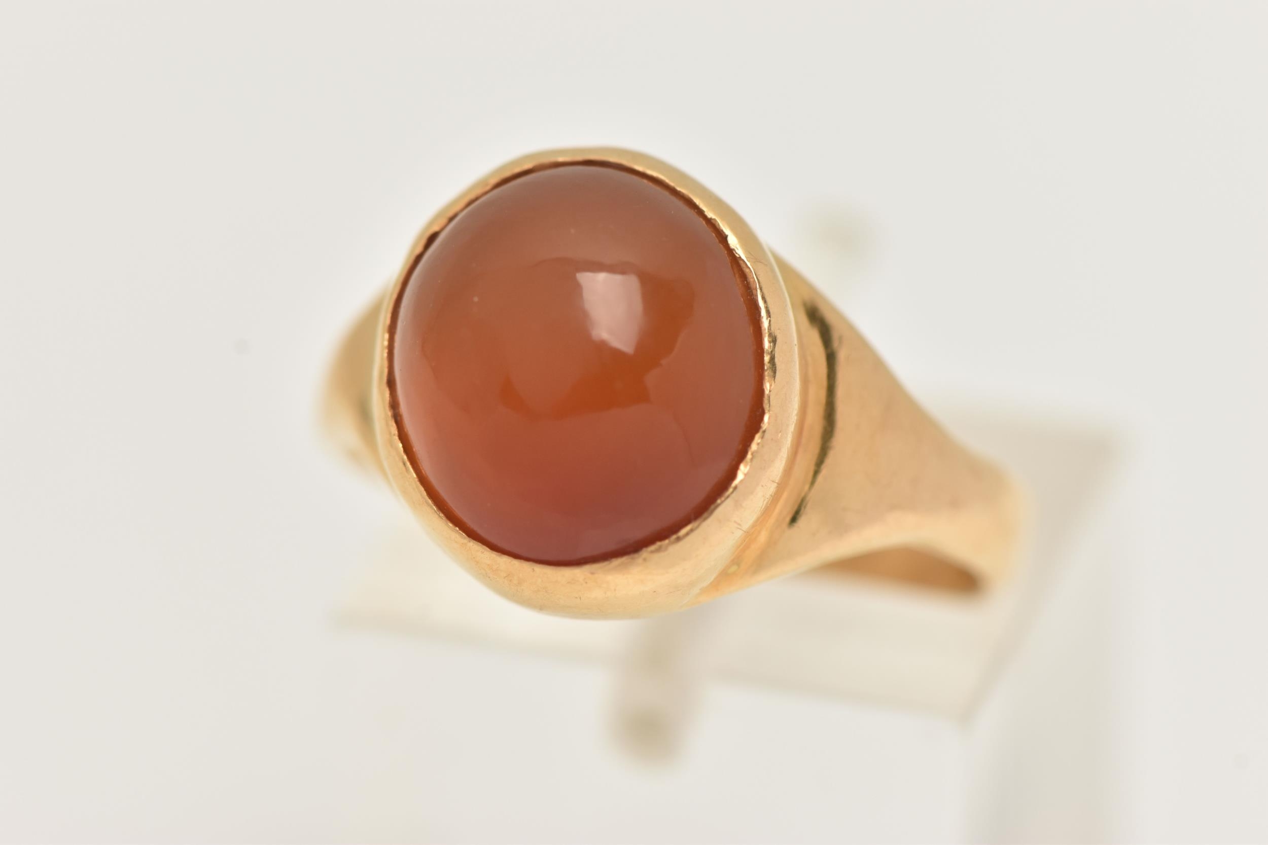 A YELLOW METAL CARNELIAN CABOCHON RING, set with an oval cut carnelian cabochon, collet set to the polished band, unmarked metal, ring size N, approximate gross weight 6.4 grams (condition report: general light wear, stone set slightly off centre, metal acid tests as gold we cannot guarantee the fineness, viewing is advised)