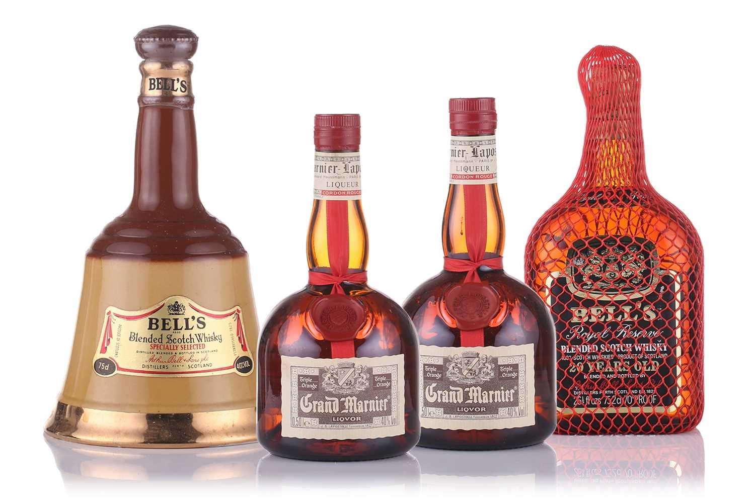 A 1980s Bell's Royal Reserve Blended Scotch Whisky, (20 Years Old), together with a Bell's Whisky bell decanter (with contents), and two bottles of Grand Marnier, all boxed.