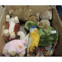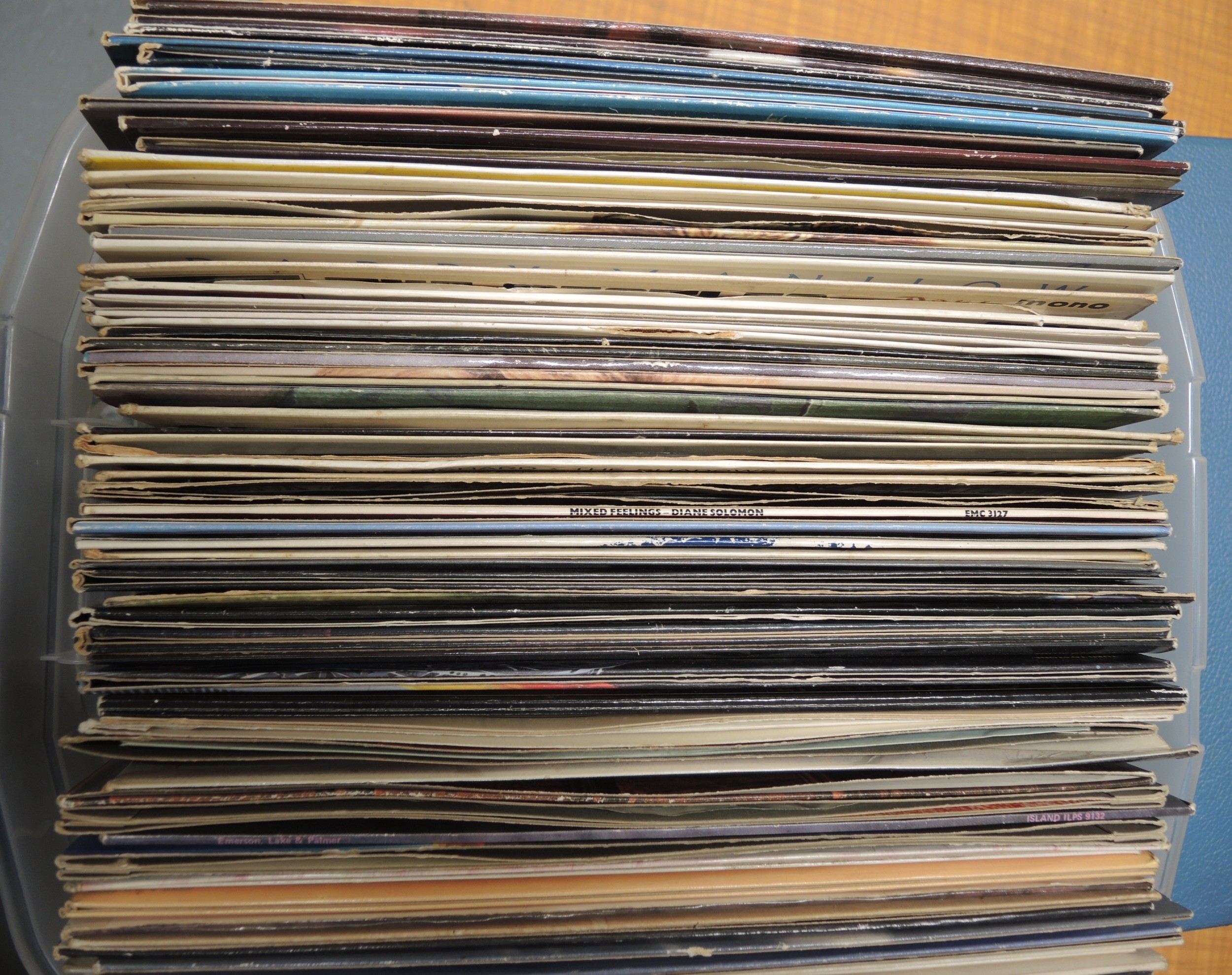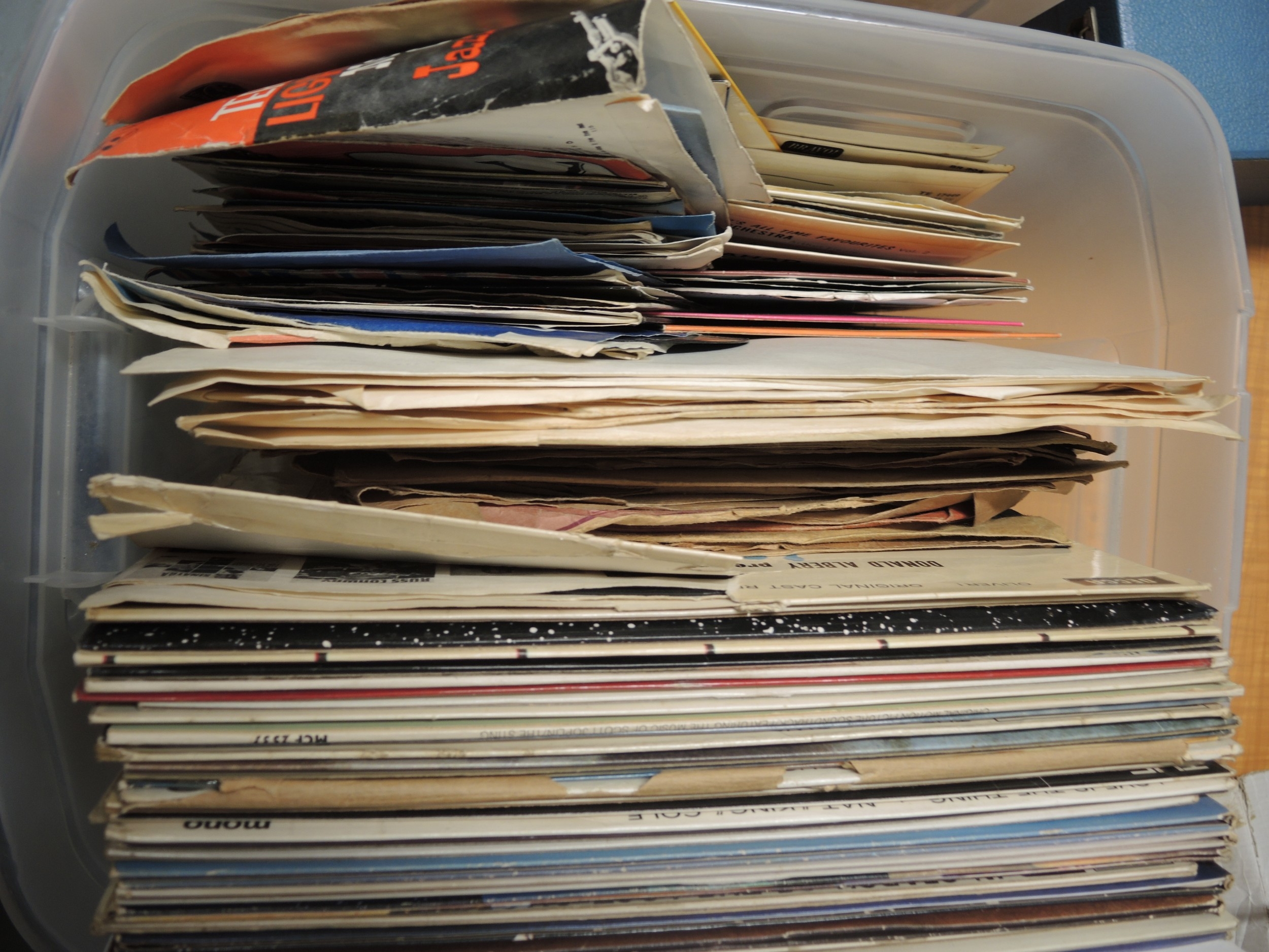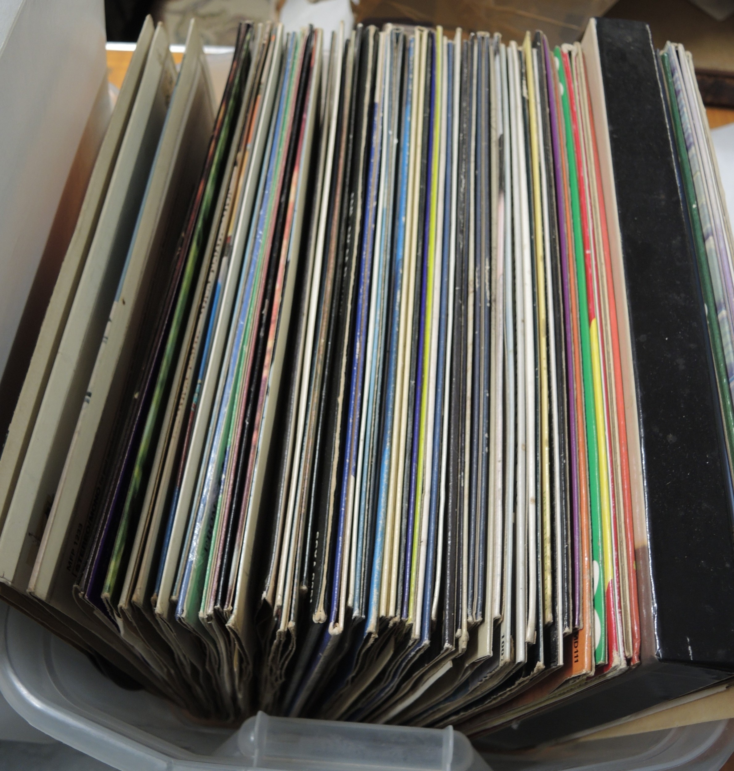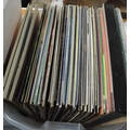 Three boxes containing various LPs and singles including Beatles, ELO, Elvis etc.