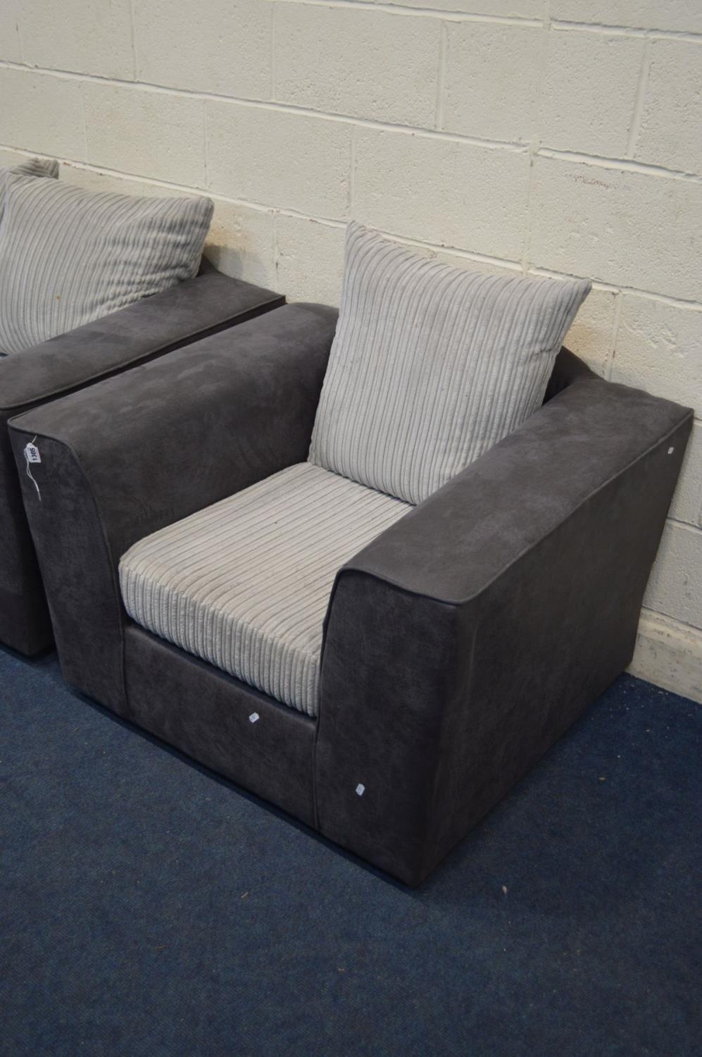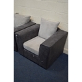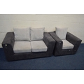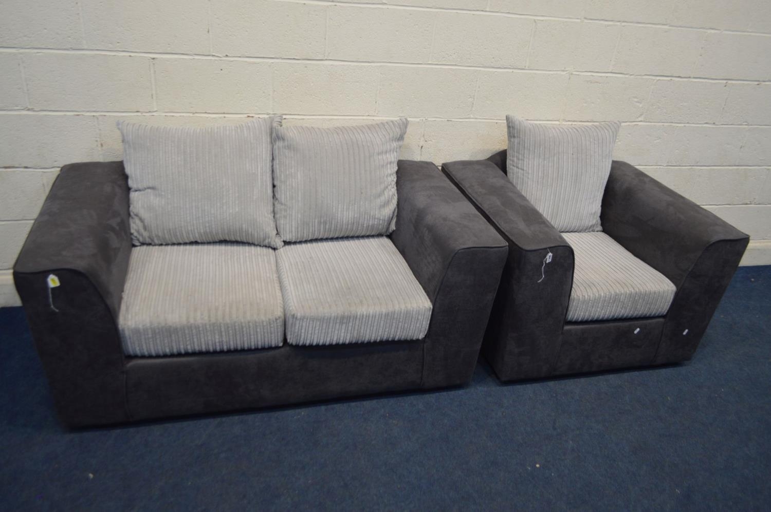 A CHARCOAL FAUX SUEDE AND LIGHT GREY TWO PIECE LOUNGE SUITE, comprising a two seater settee and armchair (2)
