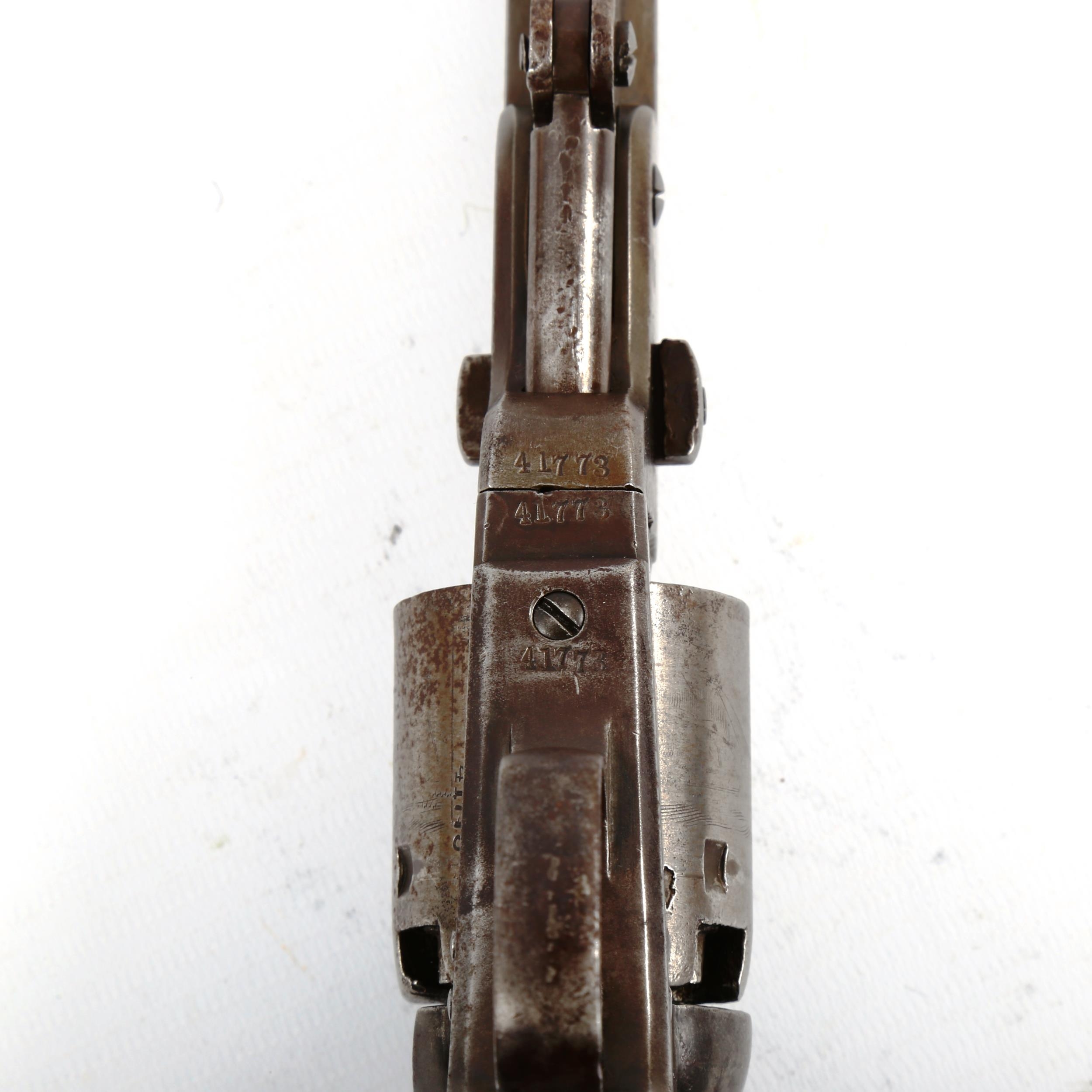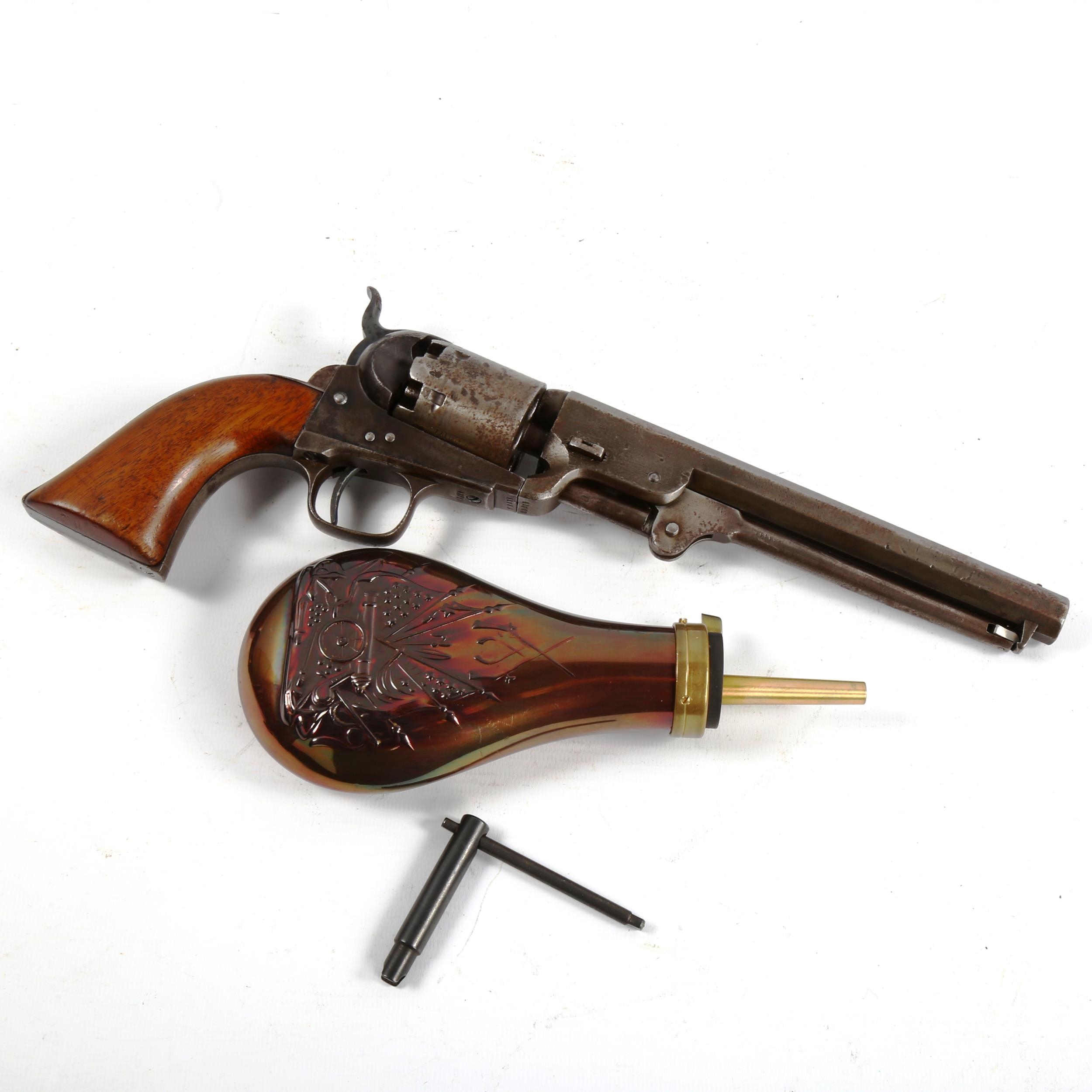 A London Colt 1851 Navy .36 Cal. percussion 6 shot revolver, 7 1/2 inch barrel, serial number 41773 indicating manufacture during 1856, top of barrel marked "ADDRESS COL COLT LONDON", London proof marks, with modern Colt pattern powder flask and nipple wrench, barrel length 19cm, overall length 32cm