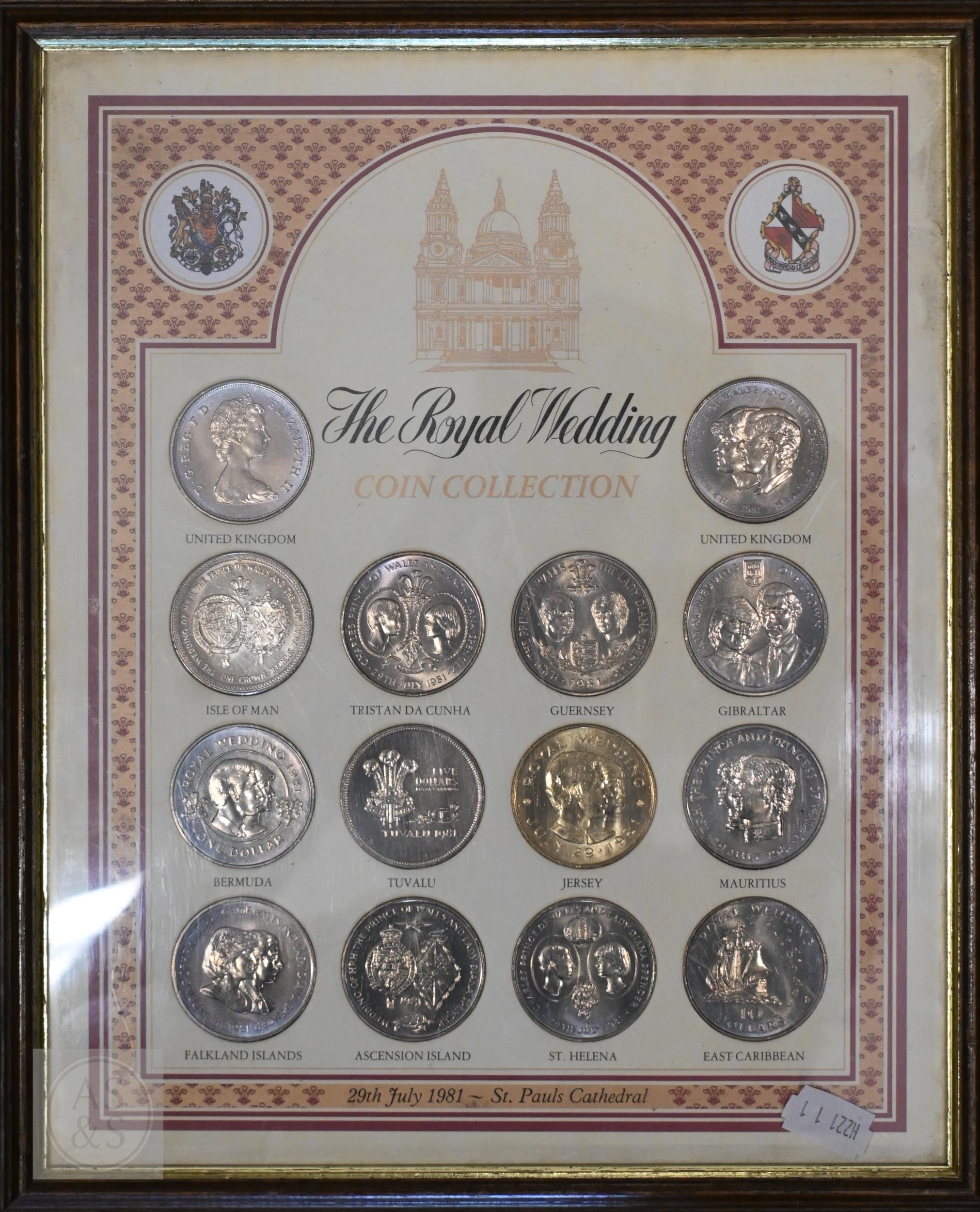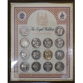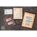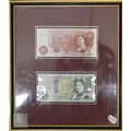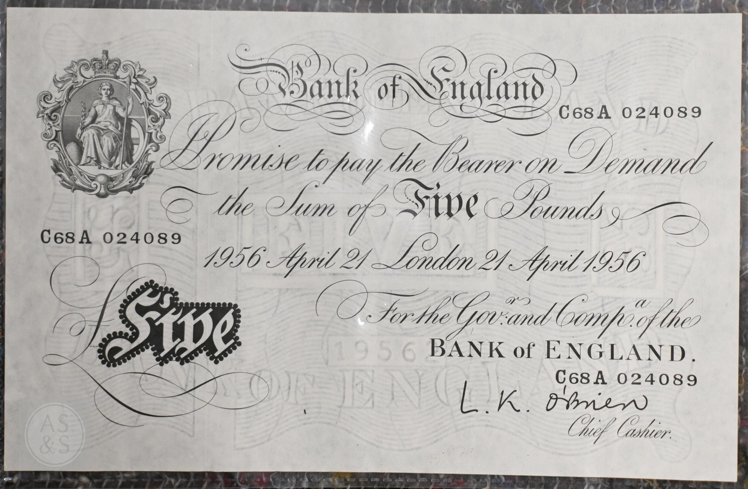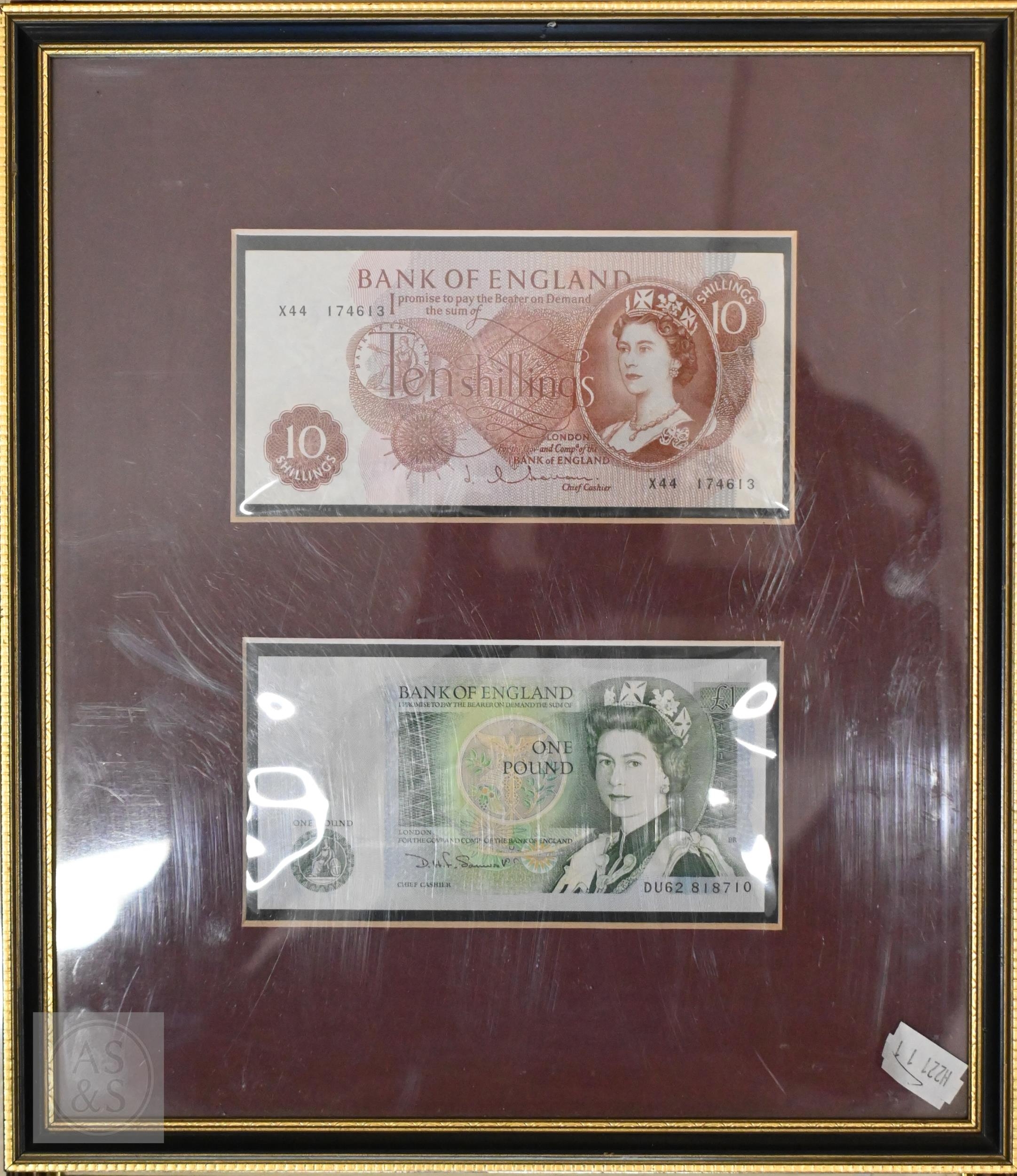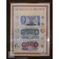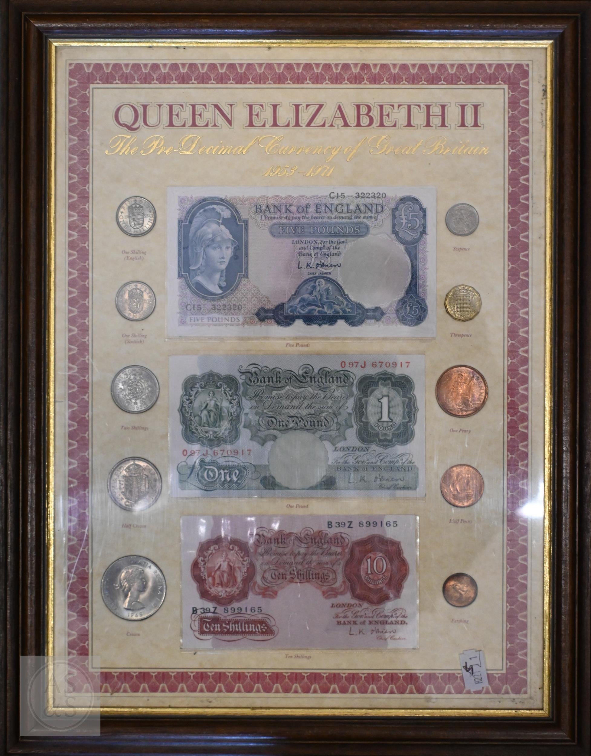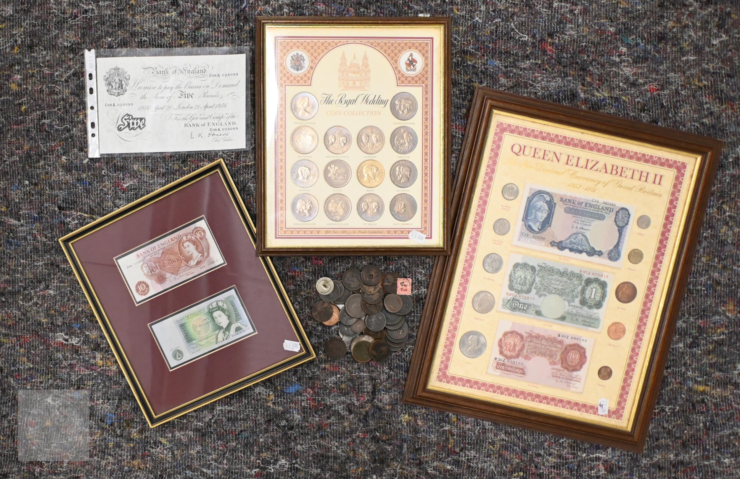 An uncirculated 1956 white Five Pounds banknote, L.K. O'Brien, C68A 024089, to/w O'Brien Five Pounds, One Pound and Ten Shillings notes presented in a frame with coinage, various Georgian and later coinage