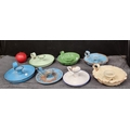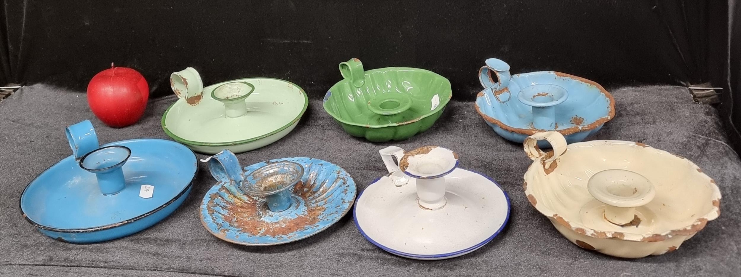 7 beautiful vintage chamber candle holders - enamelled in shades of blue, green and white.