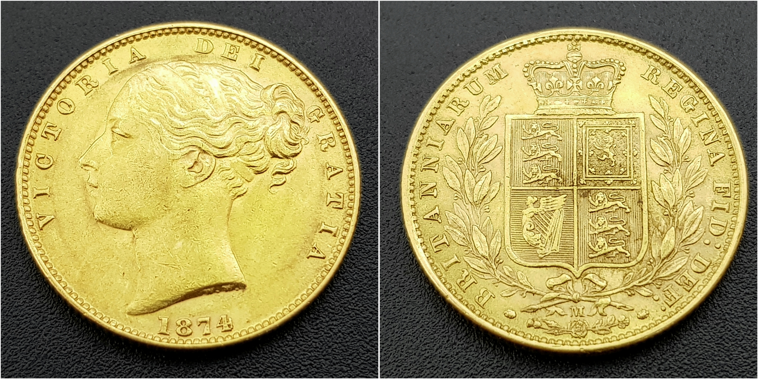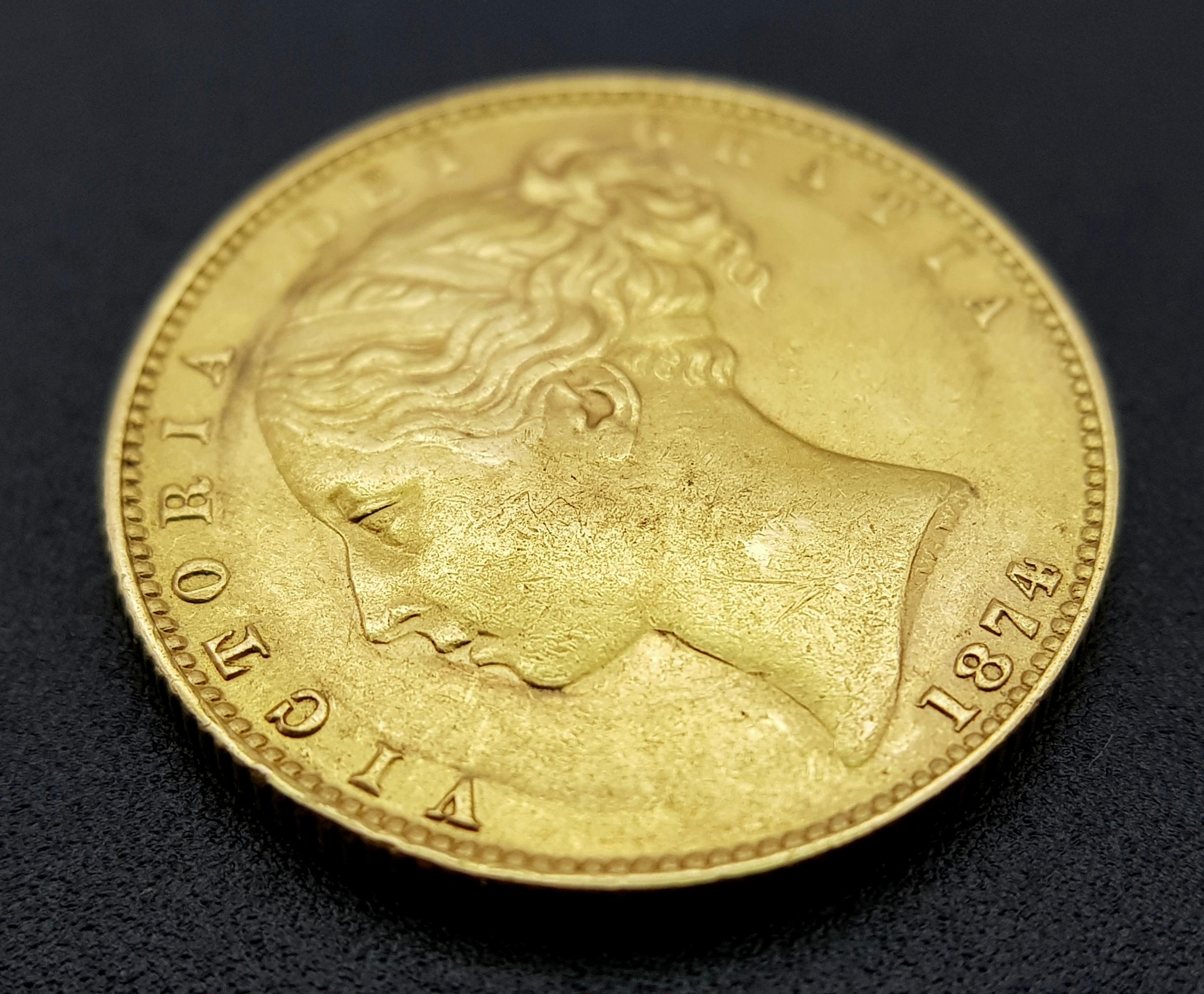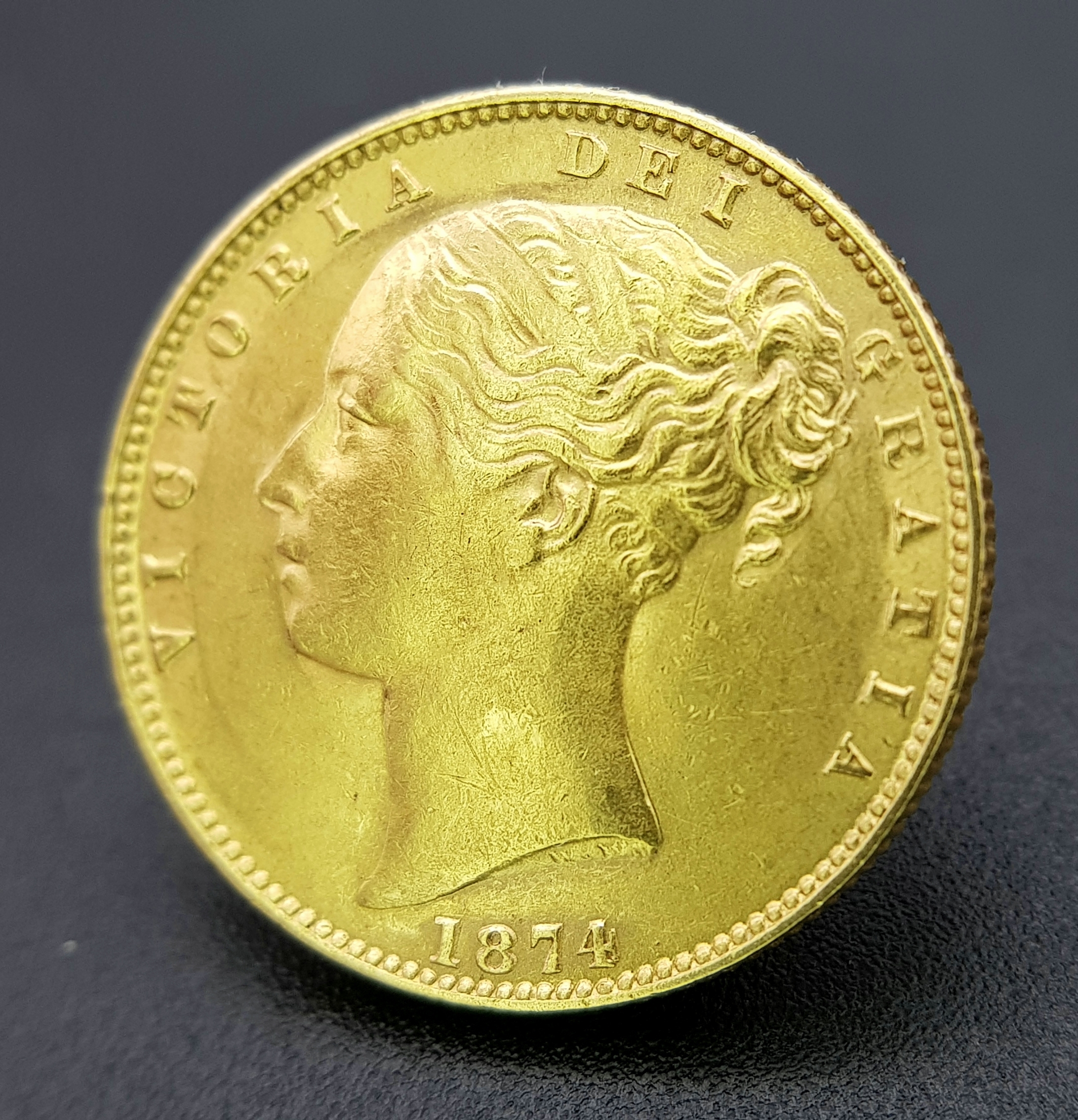 A 1874, QUEEN VICTORIA, MELBOURNE MINT, YOUNG HEAD, SHIELD BACK, FULL SOVEREIGN COIN. 9725 - 5. Ref: 9725 - 5