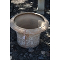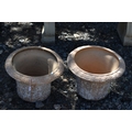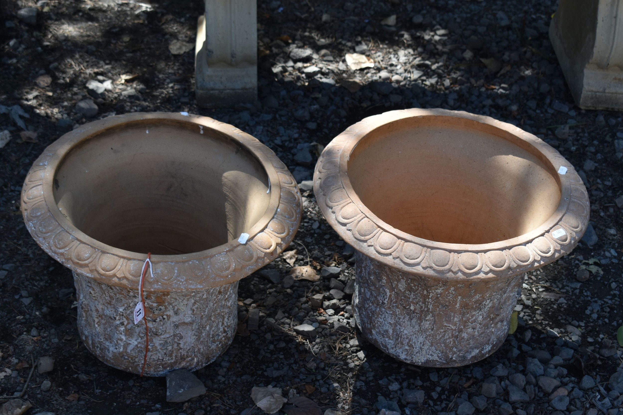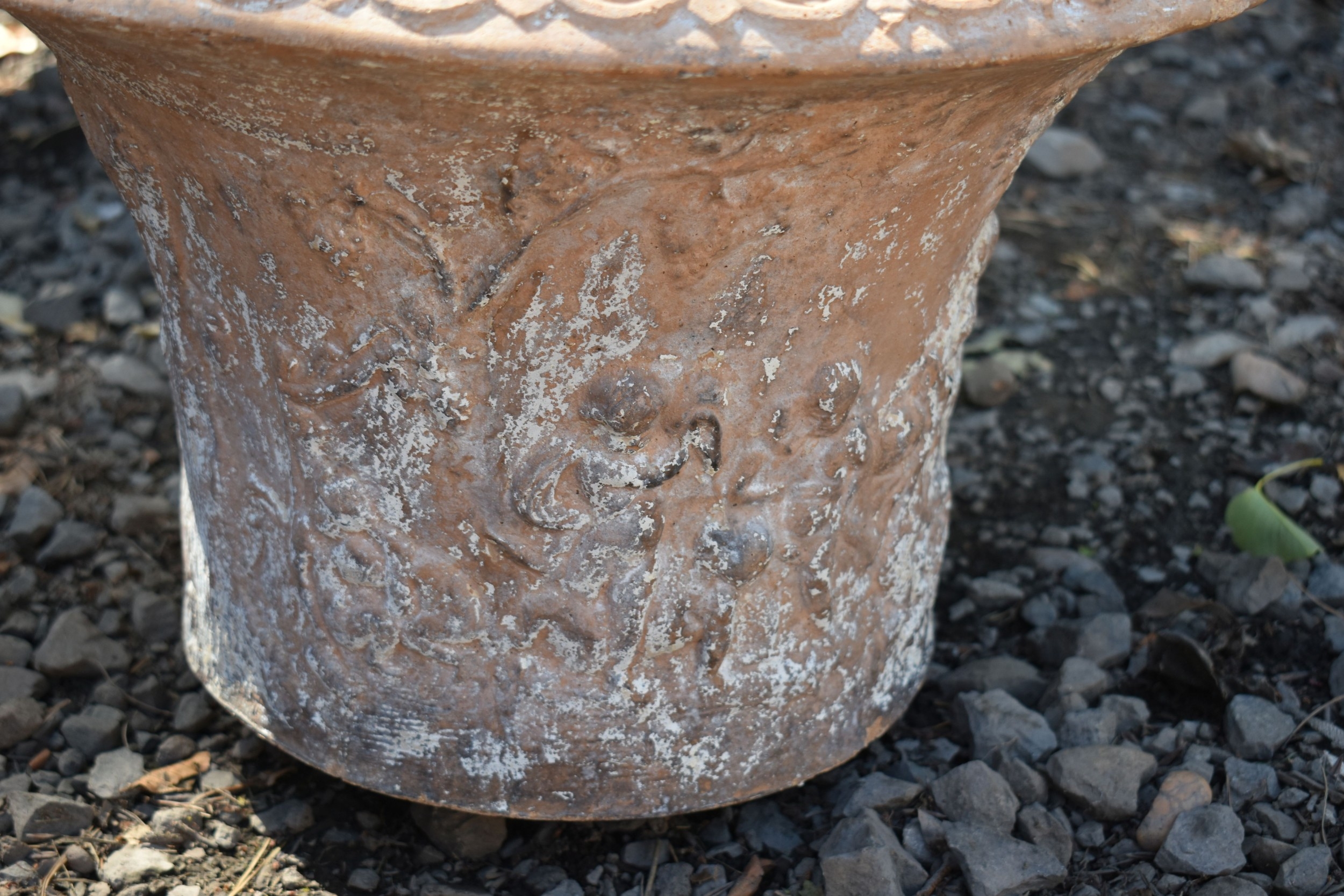 A PAIR OF TERRACOTTA PLANT POTS, with a moulded design to the side, 45cm x height 33cm, condition report: some chips, both planters with paint remains so you can't see pattern (2)