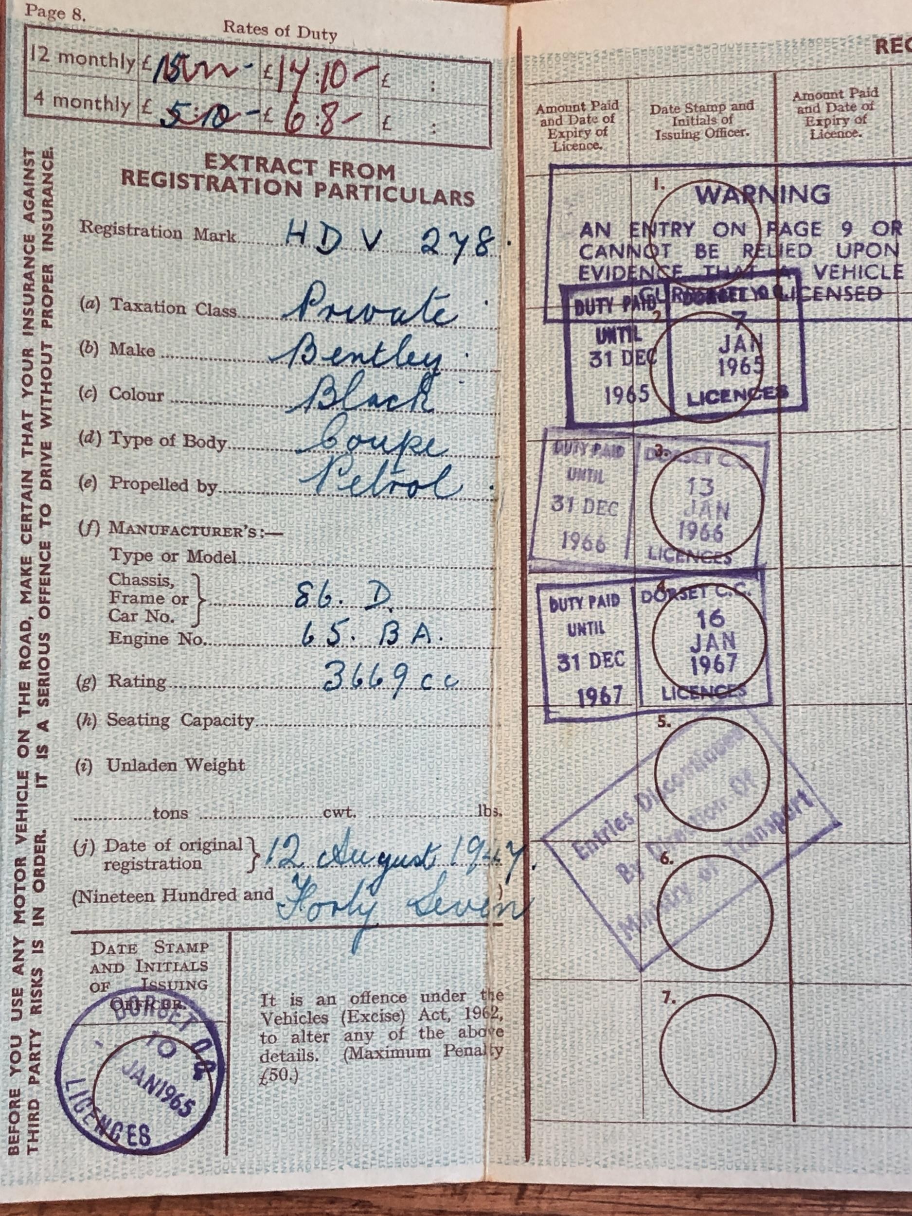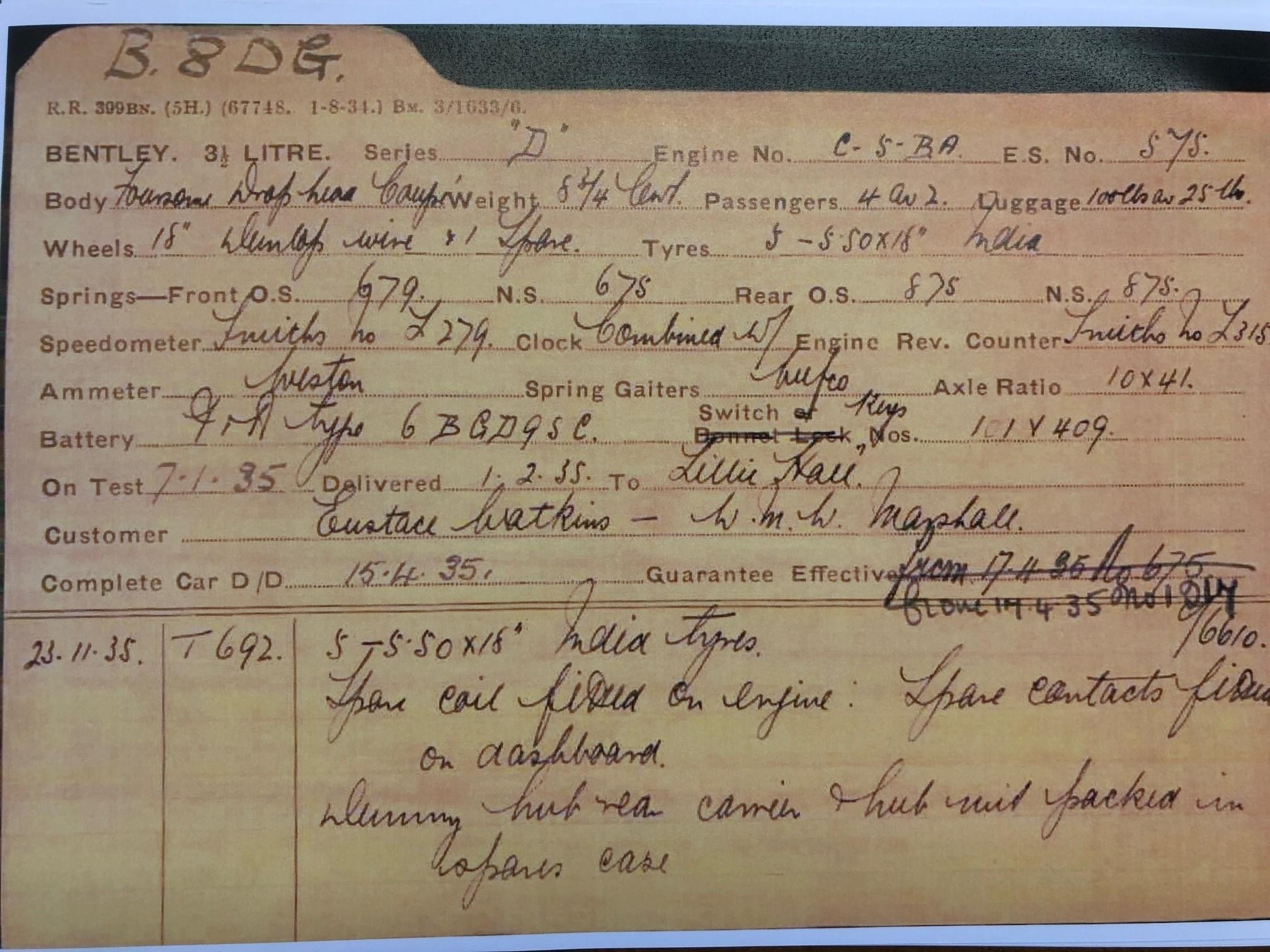 He must have been sufficiently impressed with B8DG, your car, that he replaced it 2 years later with another "Derby" Bentley (B56JD), that with the larger 4 1/4 engine. That car bore the registration DYM 571. Perhaps the 2nd "Derby" was a present to himself upon his elevation to knighthood.