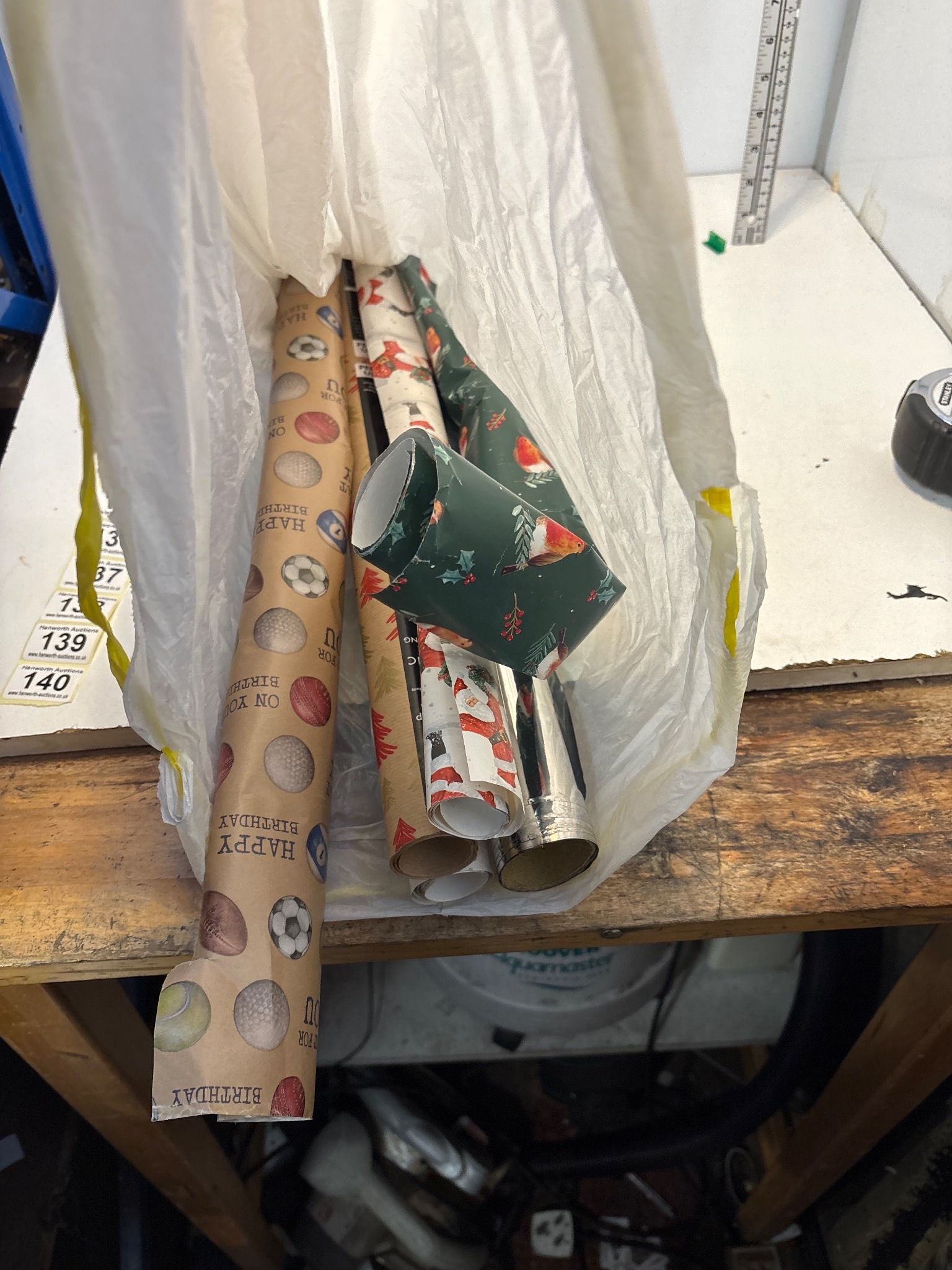 Gift wrapping paper rolls in different patterns, including festive and themed designs all part used stored in a plastic bag