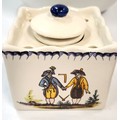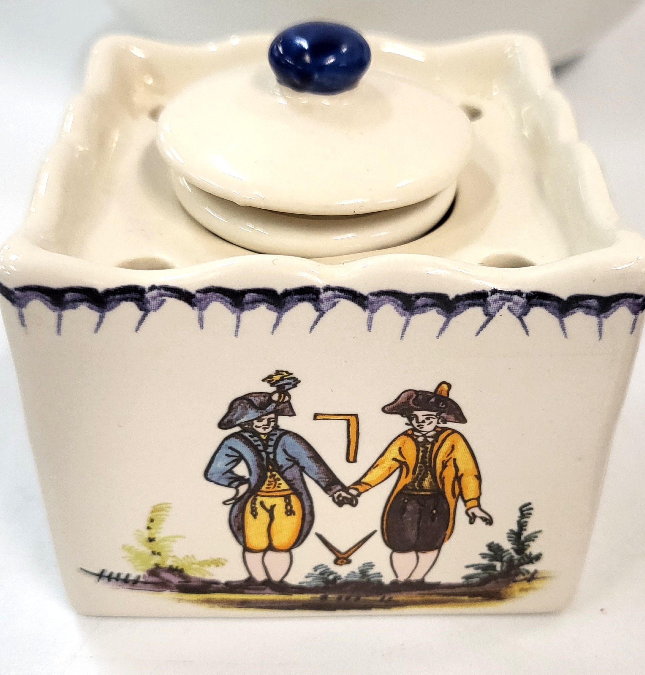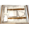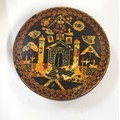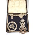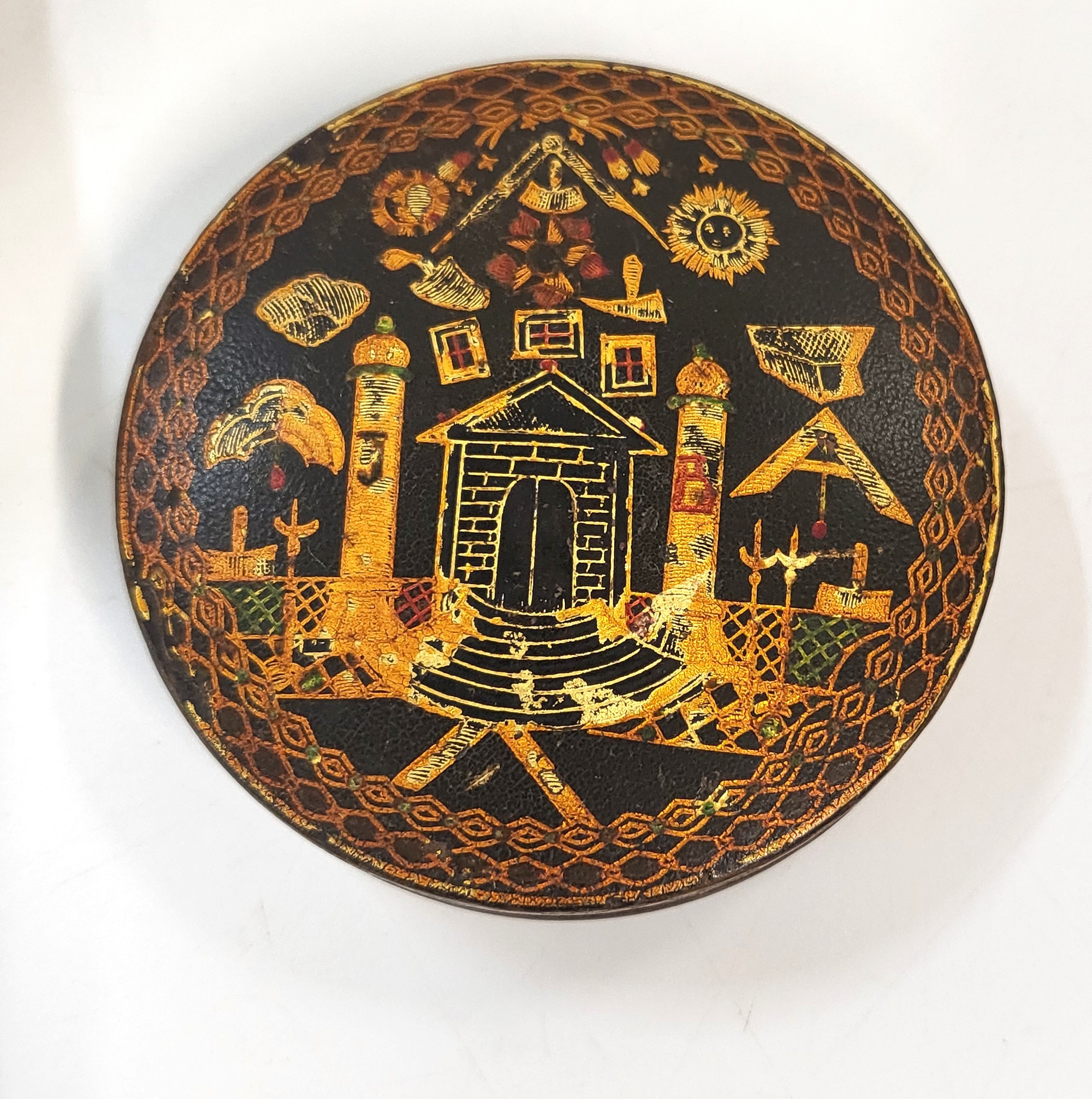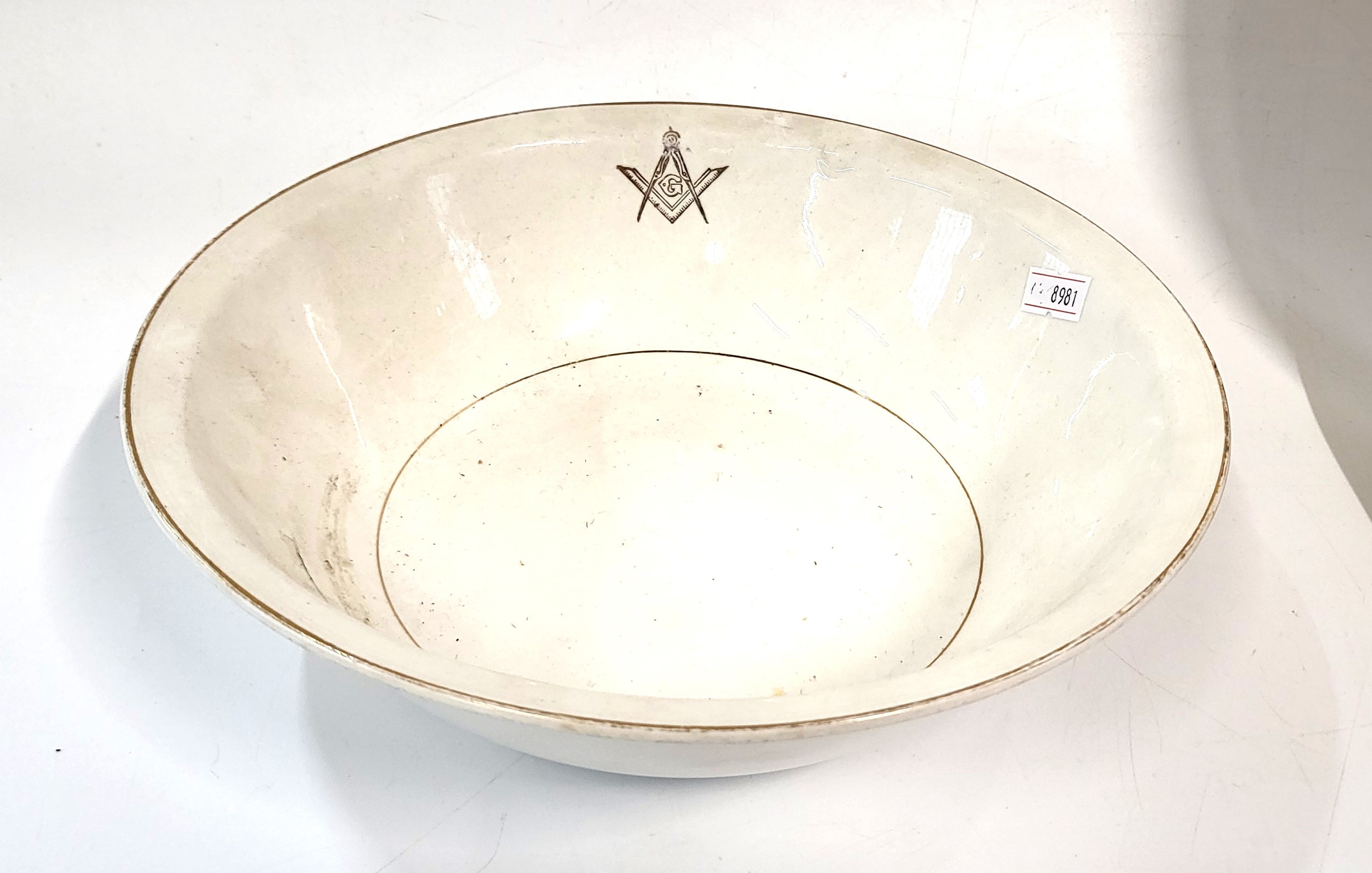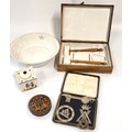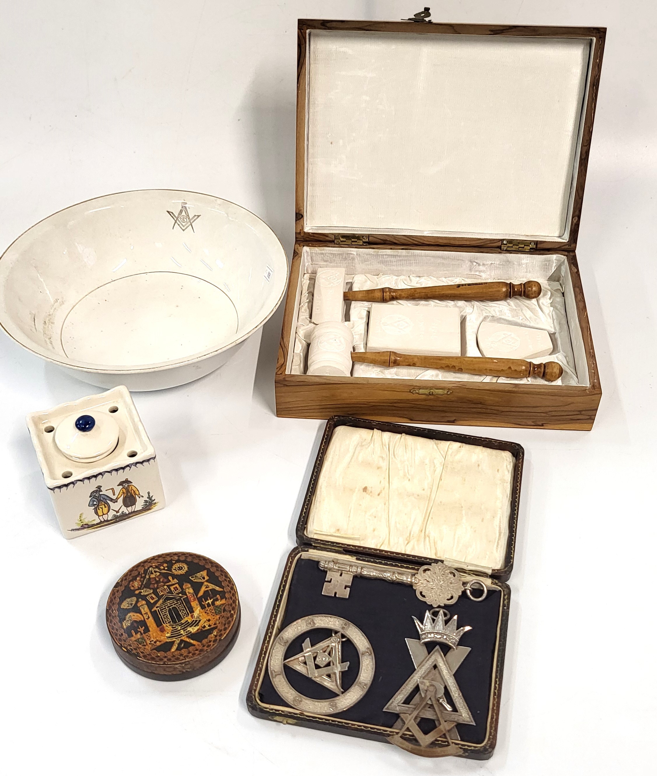 Five Masonic items including gavel and block set, jewels, inkwell, bowl, and lidded pot. (5)