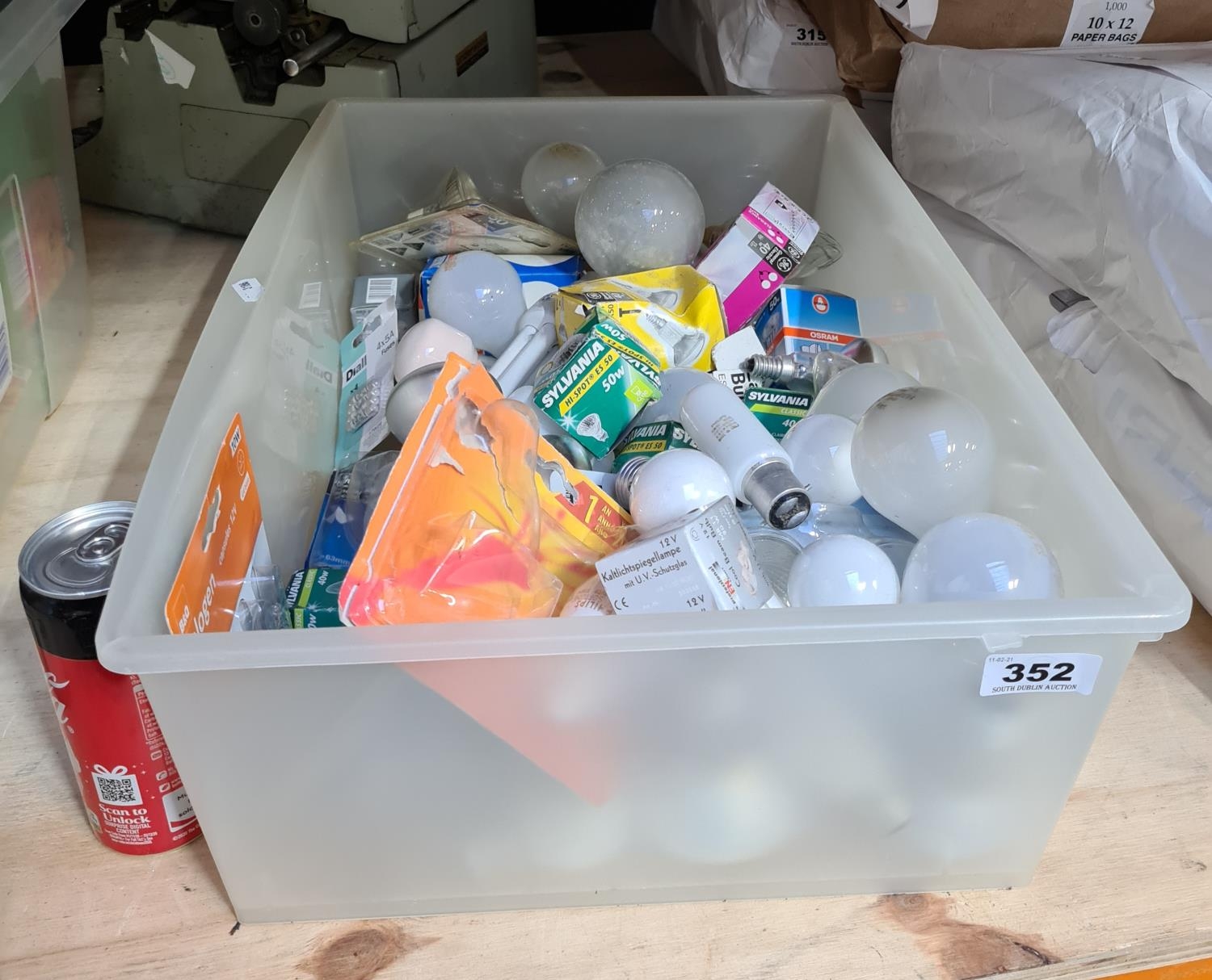 Large box of assorted and mixed bulbs, various sizes and voltages