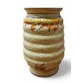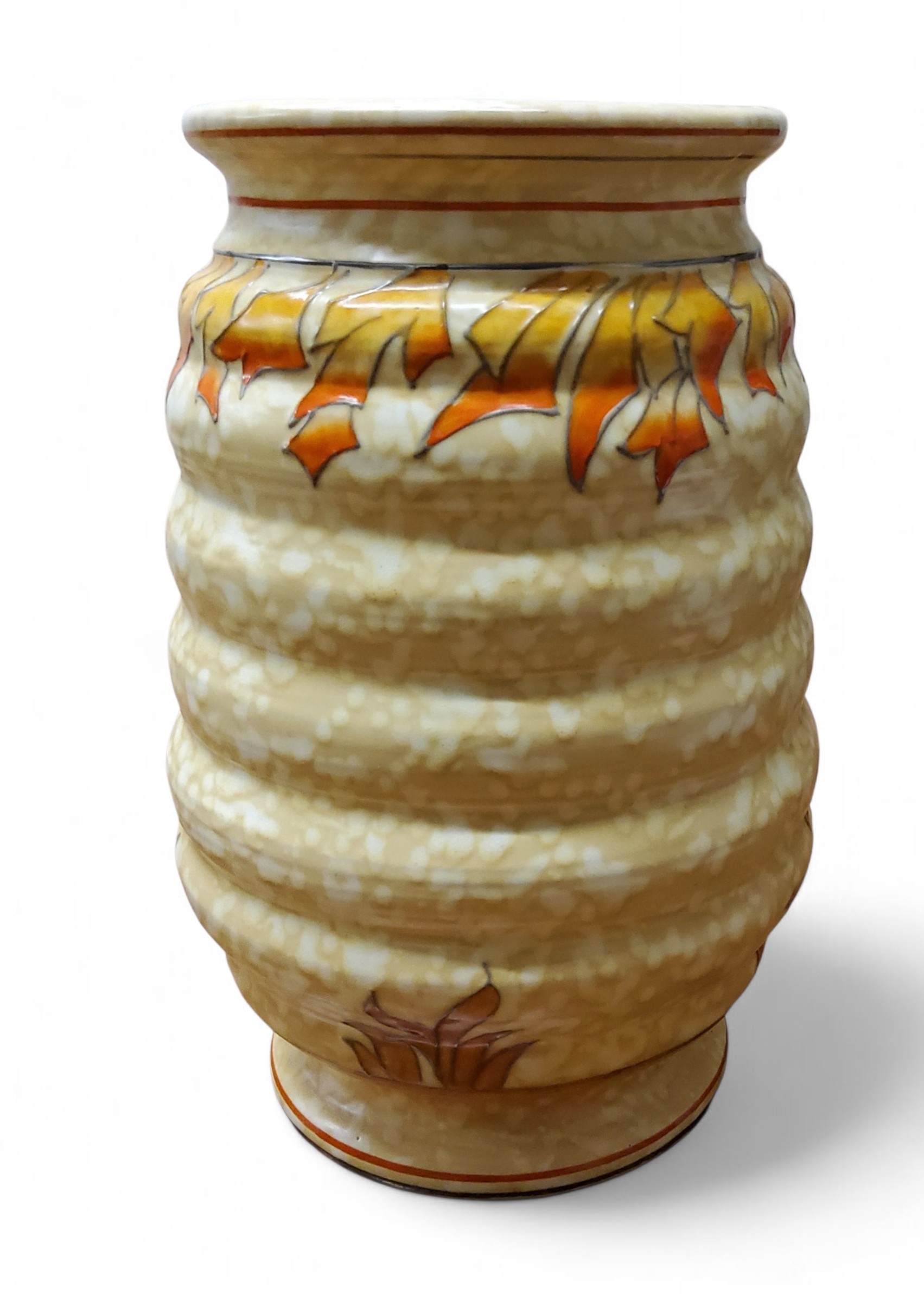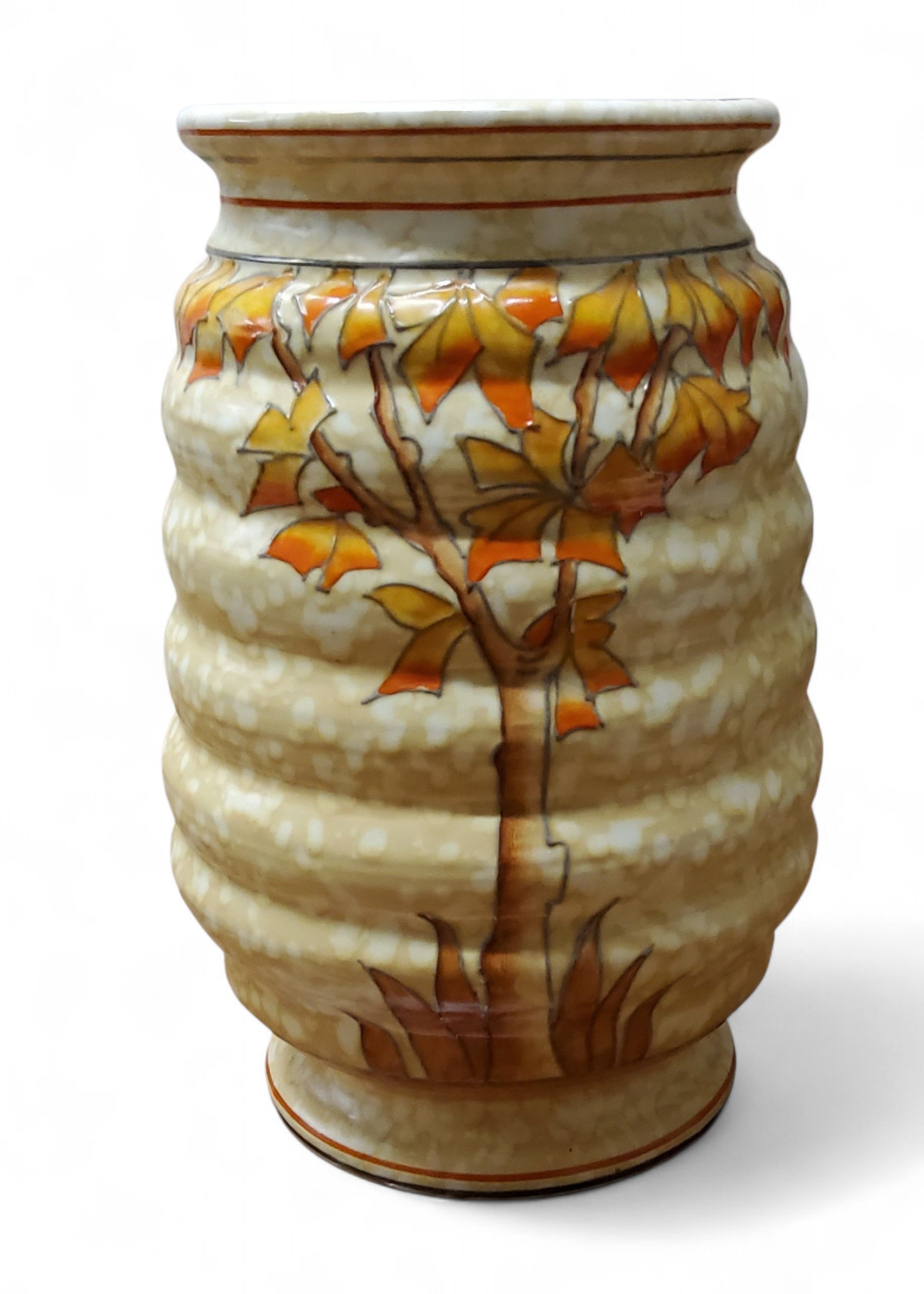 ****Amended Description****A Charlotte Rhead for Crown Ducal Spanish Tree pattern ribbed ovoid vase, tubelined with tree and foliage, in tones of yellow, orange and brown on a mottled cream ground, 32cm high, printed mark, signed, shape no2.02
