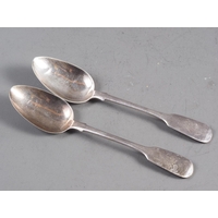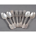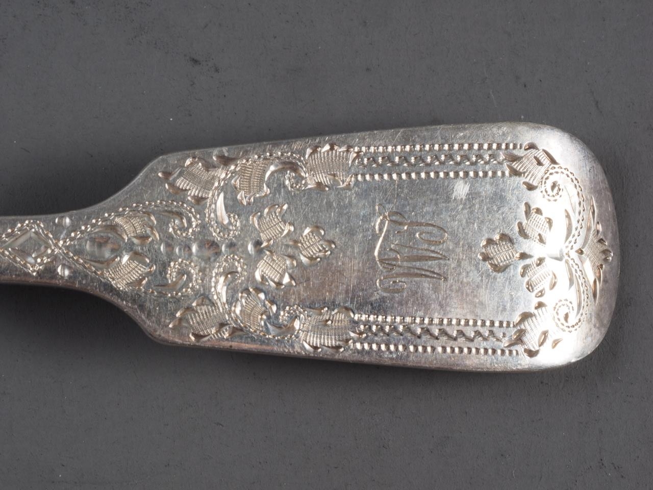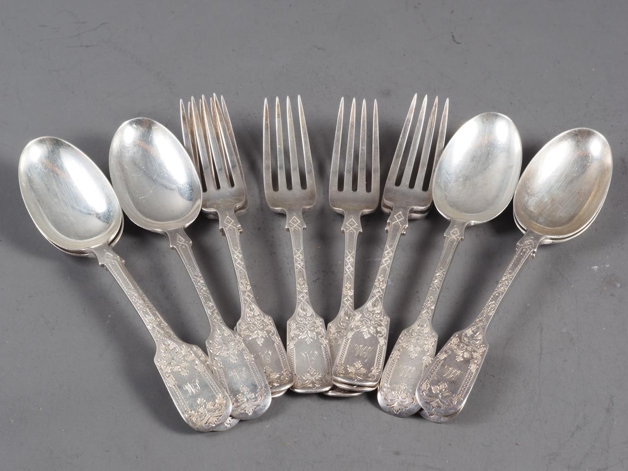 A set of six silver dessert spoons and forks desert with engraved decoration, and monogram, 16.4oz troy approx