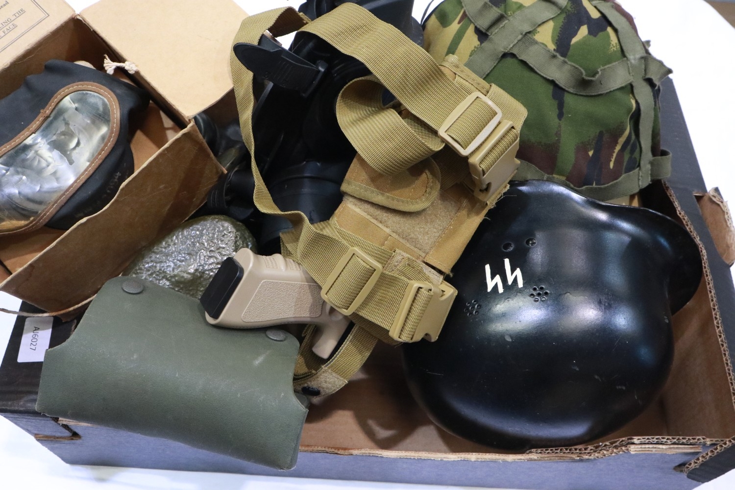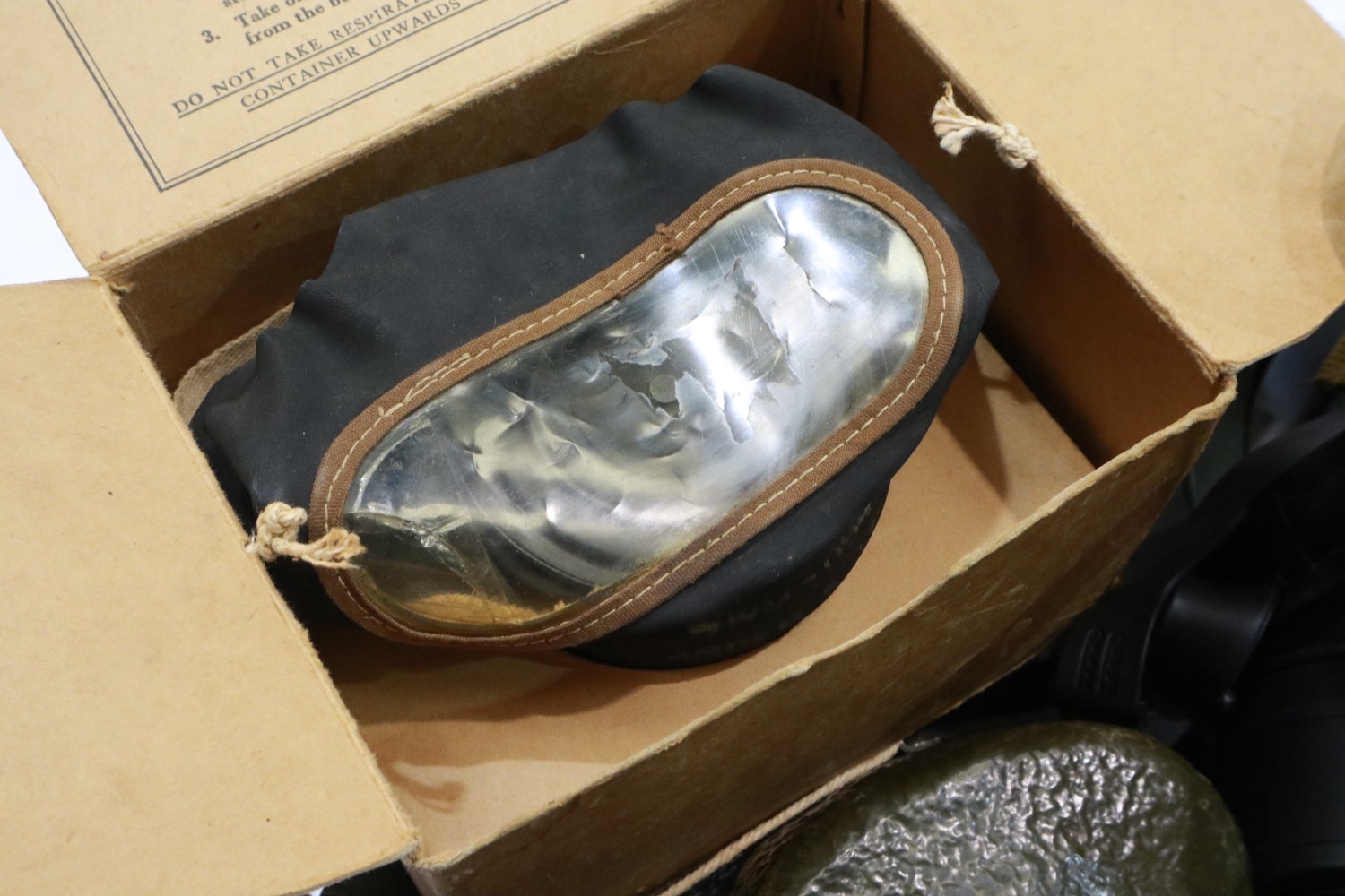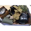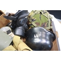 Box of mixed post-war field equipment, helmets, gas masks, flasks etc. Not available for in-house P&P