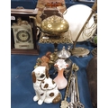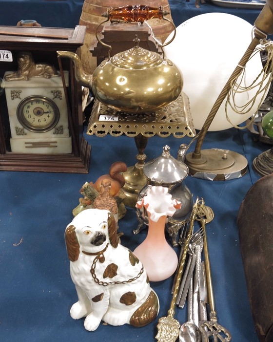 A brass trivet, a brass kettle, plated teapot, a Staffordshire dog, pottery figures, and sundry wares.