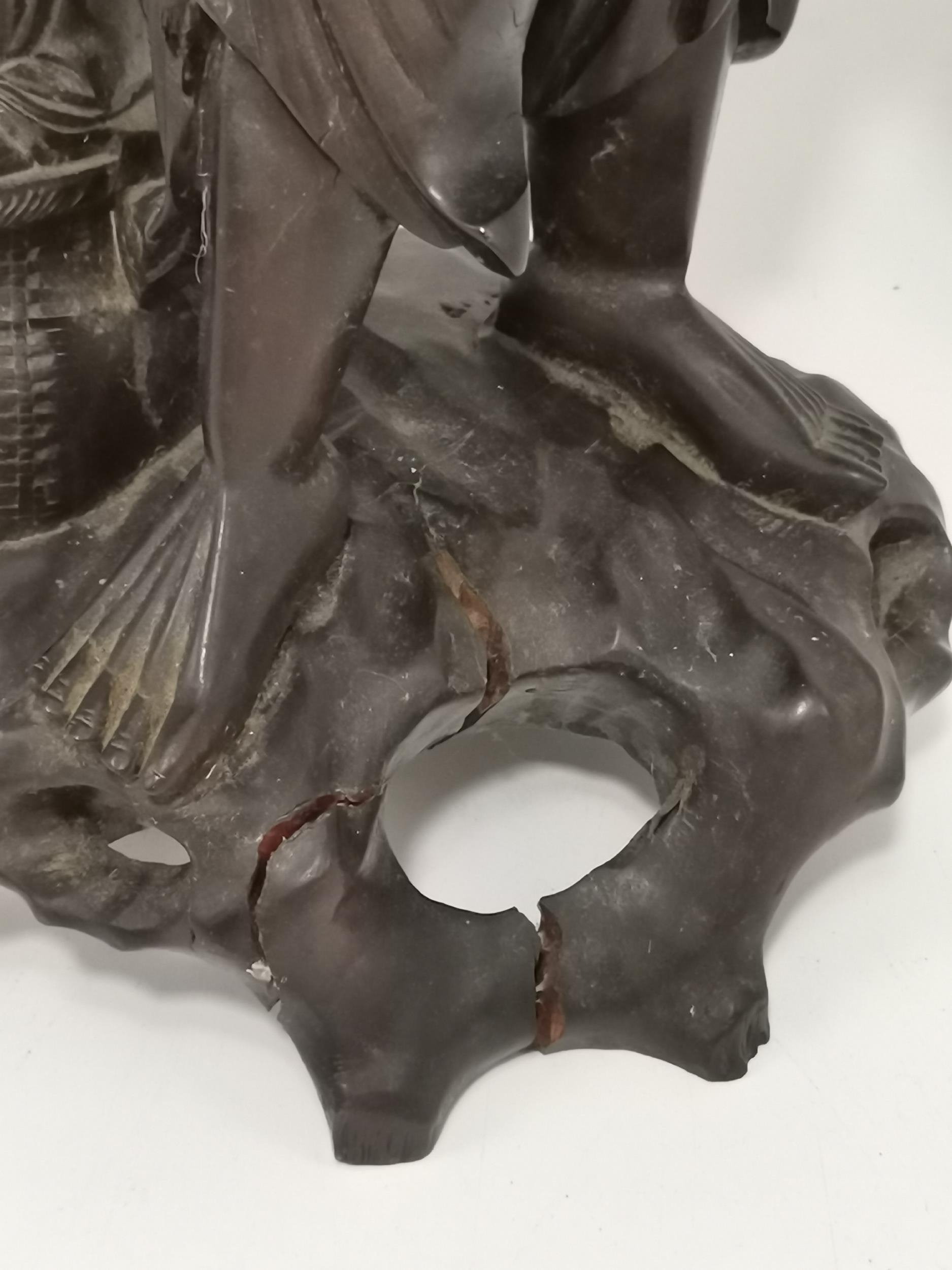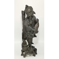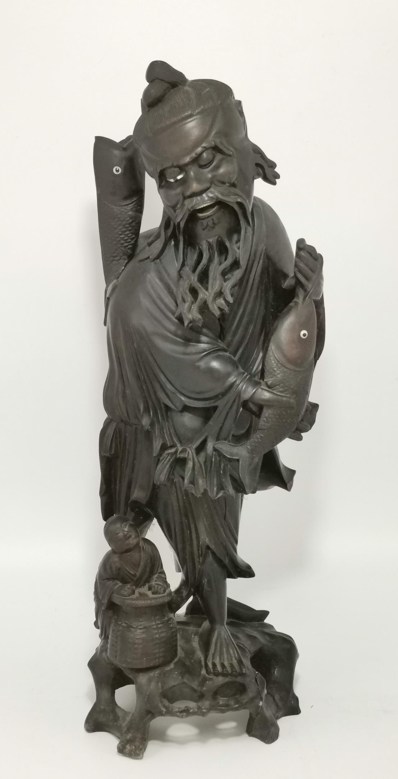 Chinese Root wood carved figure depicting fisherman holding his catch. H56cm