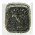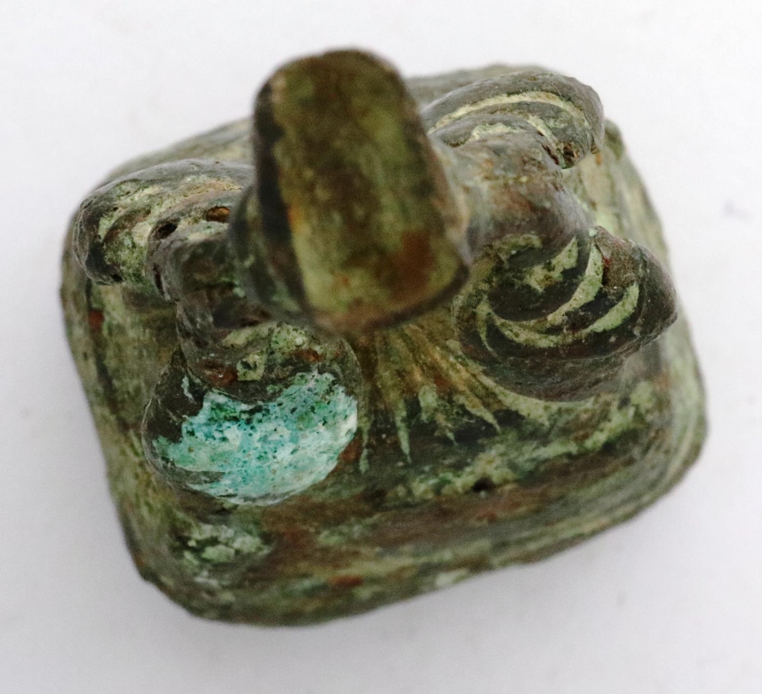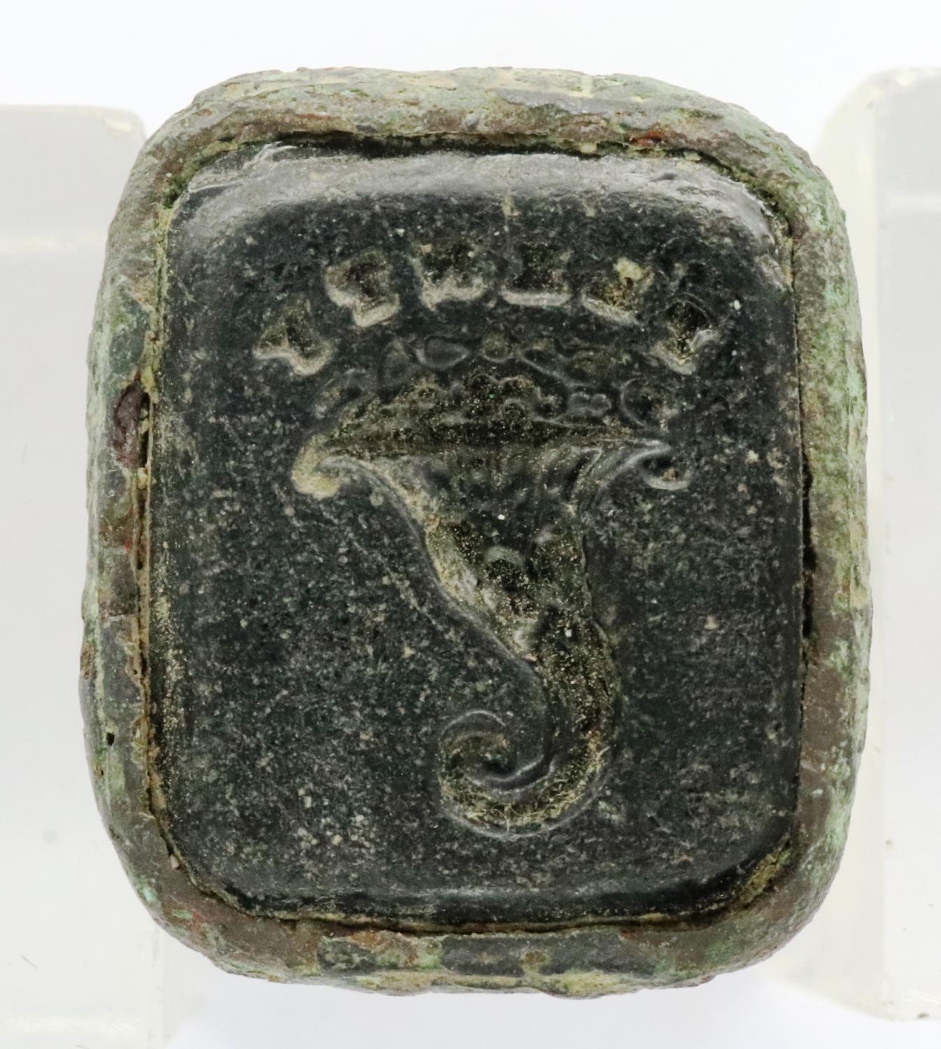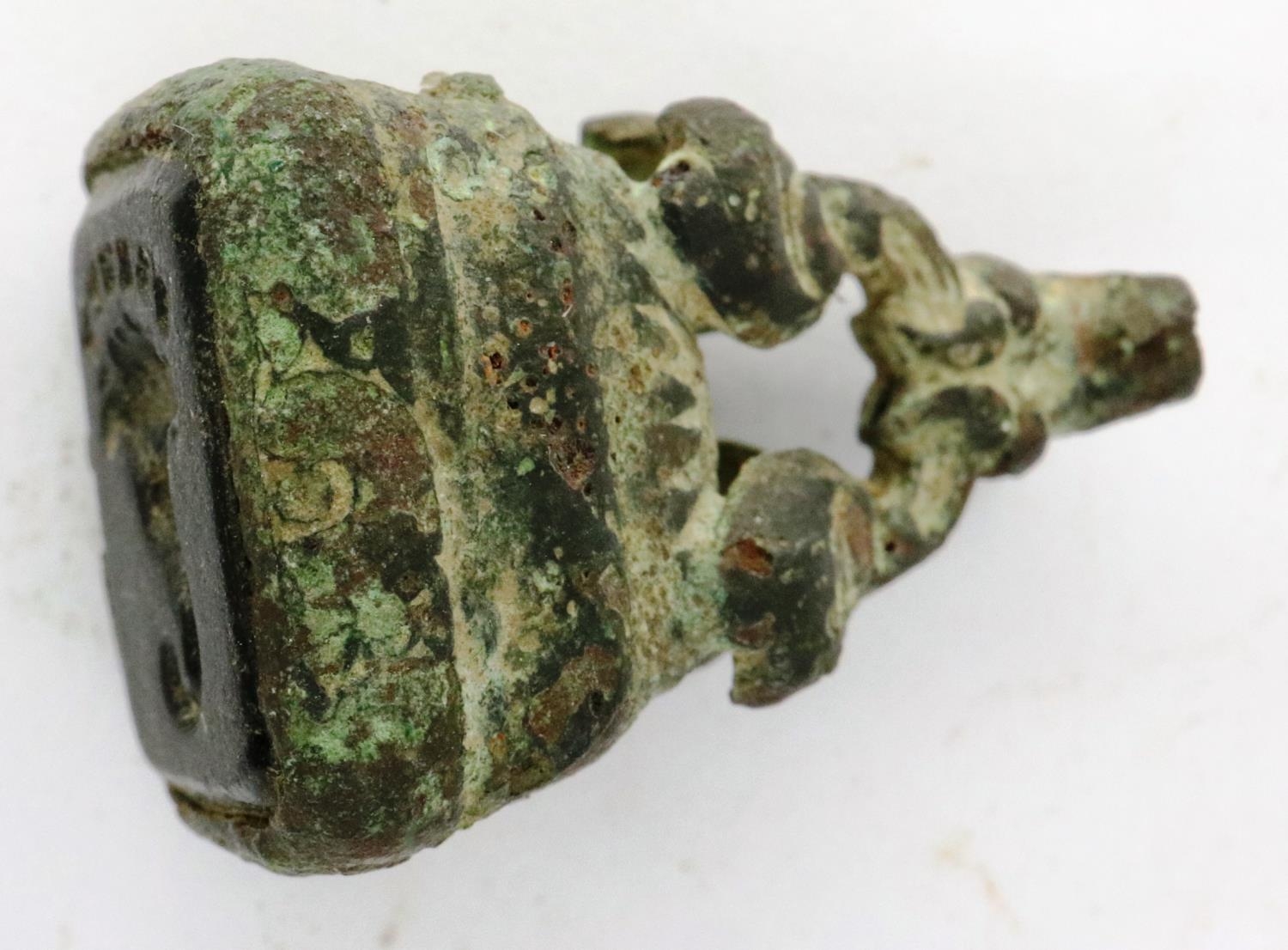 Roman bronze wax house seal, named and with imagery of cornucopia, L: 30 mm. P&P Group 0 (£5+VAT for the first lot and £1+VAT for subsequent lots)