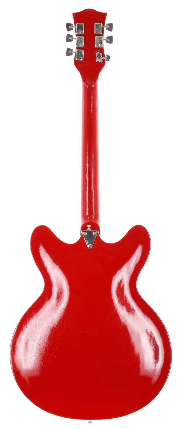 1971 Defil Melodia hollow body electric guitar, made in Poland; Body: red finish, light checking throughout, further minor marks; Neck: light checking, otherwise good; Fretboard: ebony with block inlay; Frets: good; Electrics: untested (unconventional jack); Hardware: generally good, replacement lower E tuner; Weight: 2.91kg; Overall condition: good