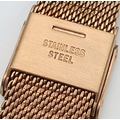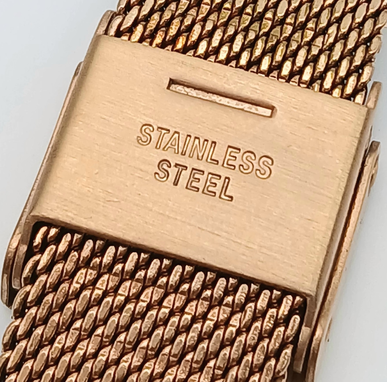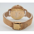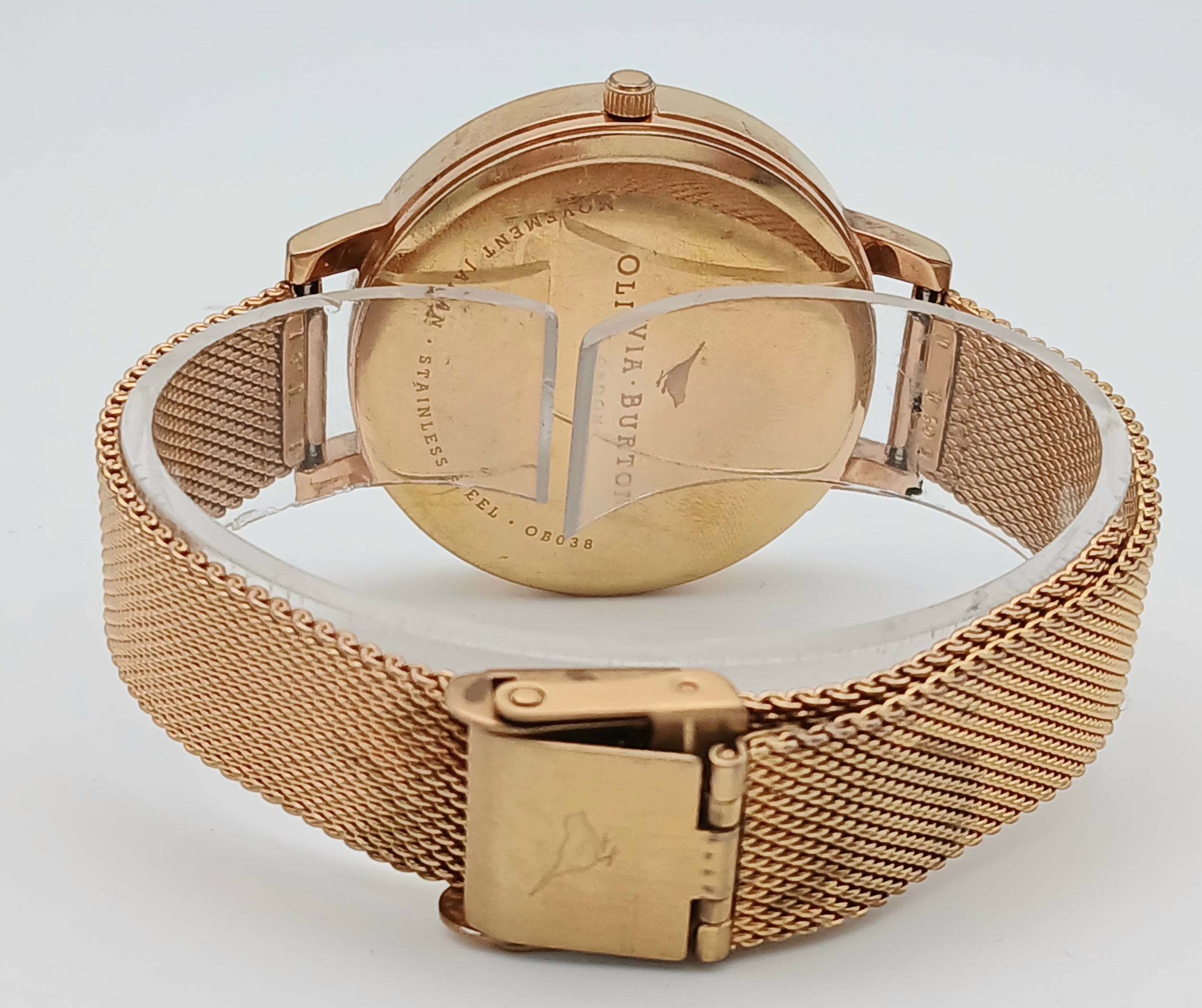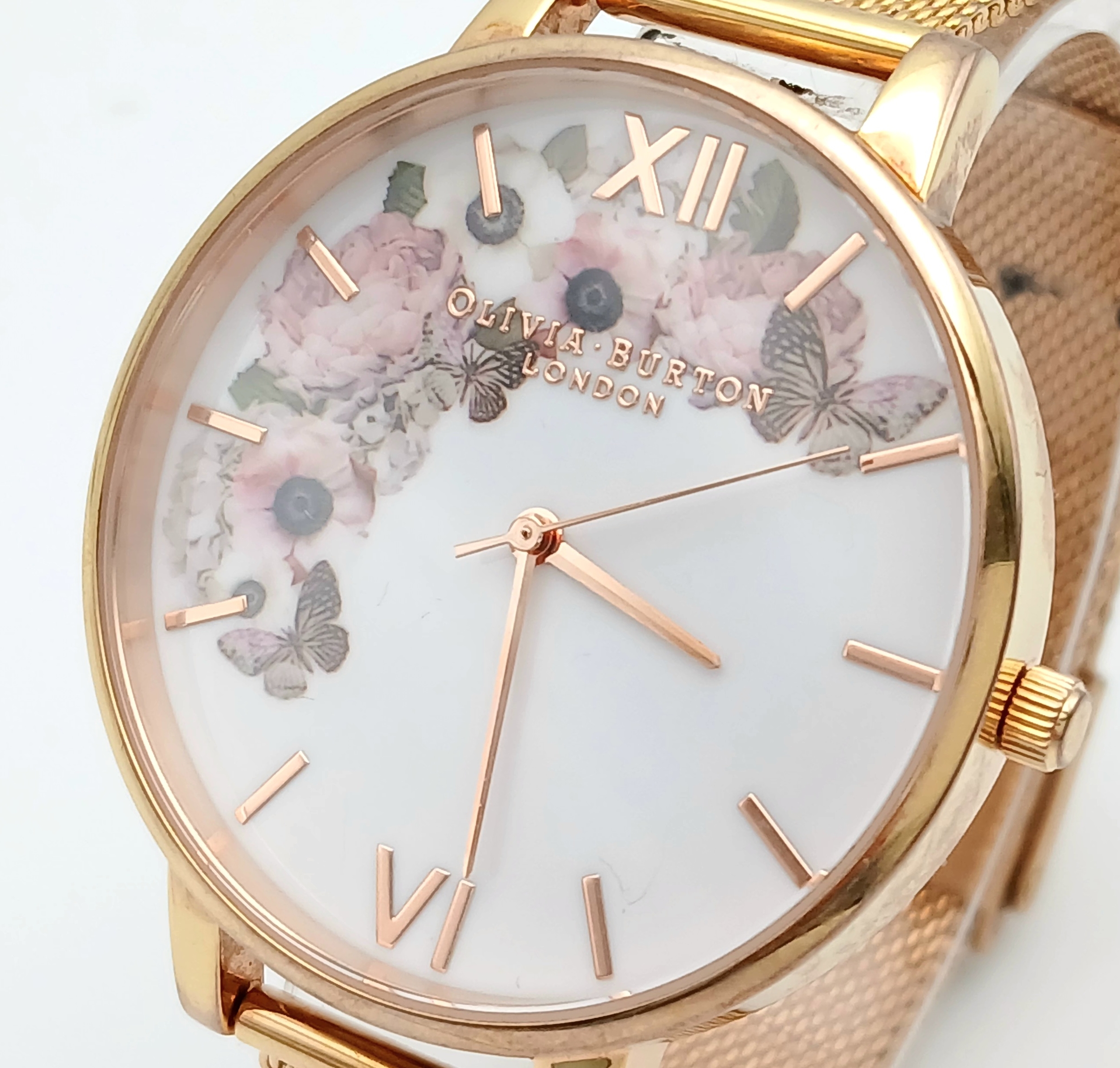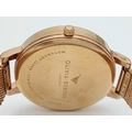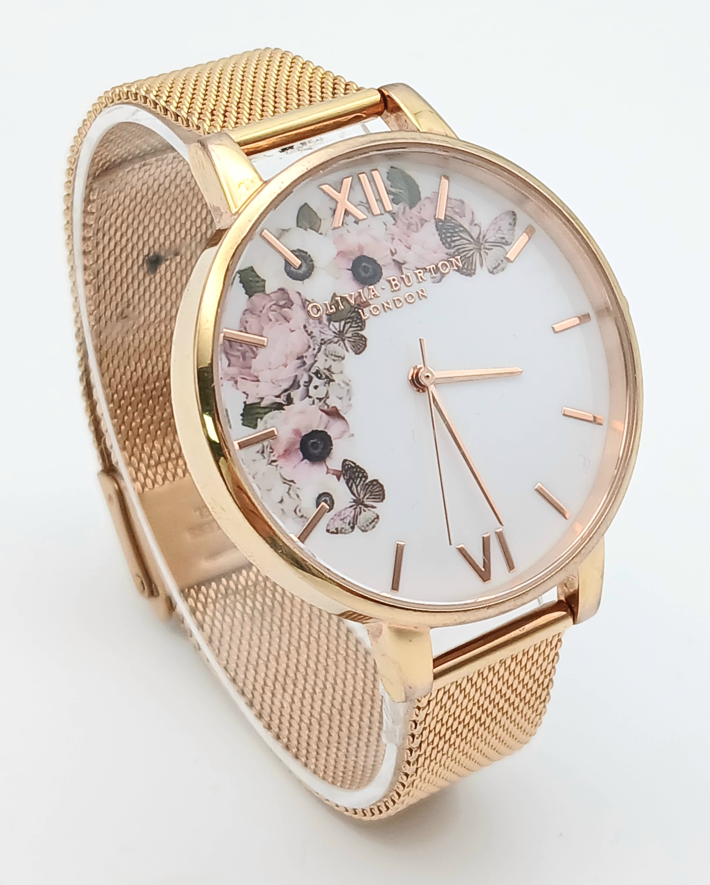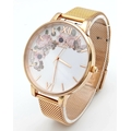 AN OLIVIA BURTON, ROSE GOLD TONE, MESH BRACELET WATCH WITH FLORAL DIAL. IN FULL WORKING ORDER. S/A 1599 - 7