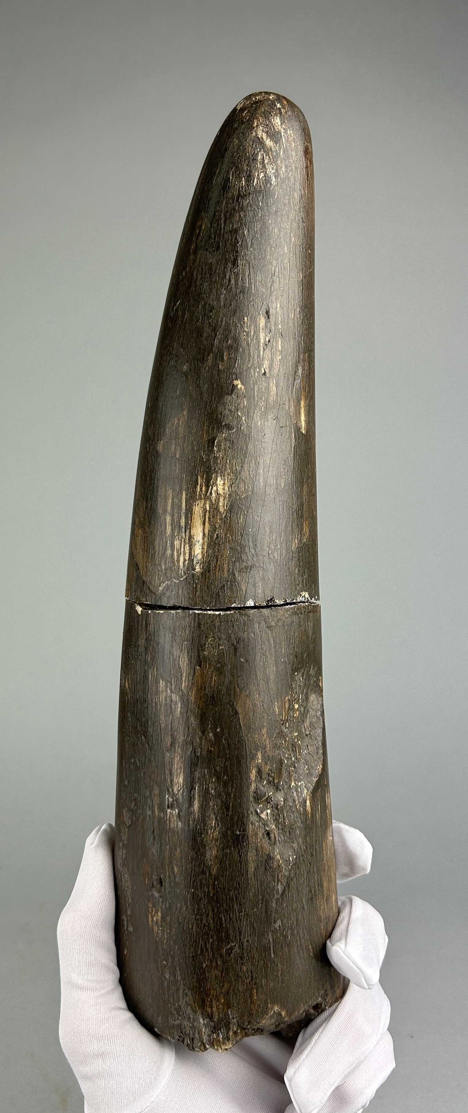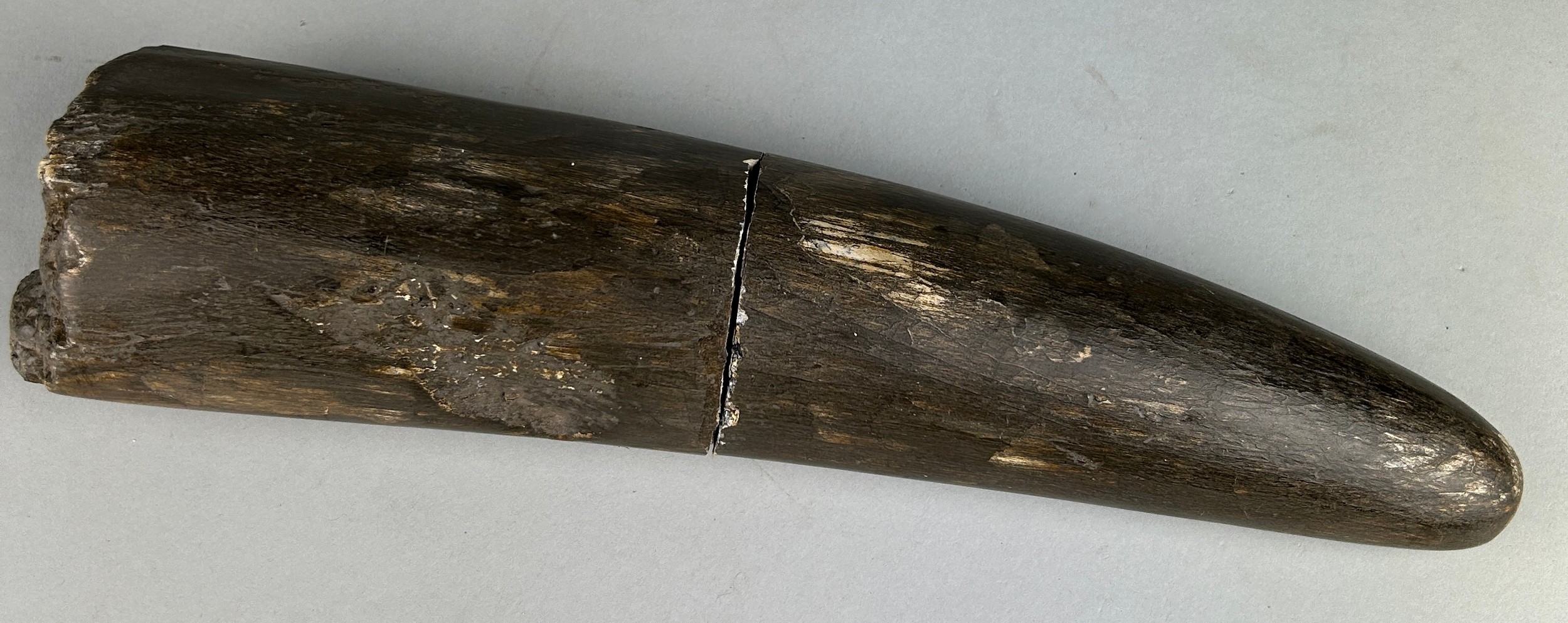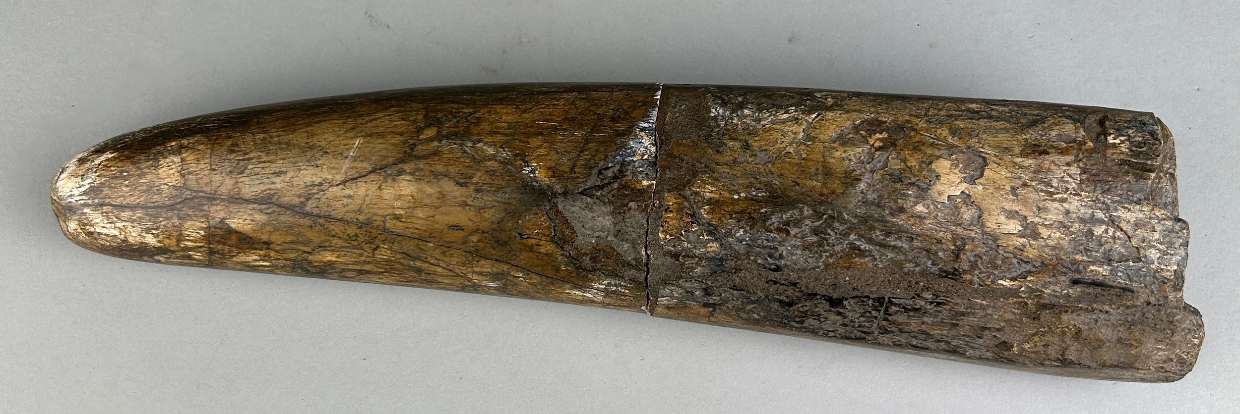 A large and very rare extinct fossil Elephant (Stegodon) tusk, excavated in two parts. It was found in river deposits and subsequently exhibits an attractive patina. Stegodon are one of the largest extinct elephant species in the order Proboscidea, their fossils are found throughout Asia.