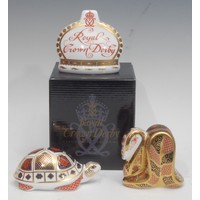 A Royal Crown Derby paperweight, Cromer Crab, exclusive to Royal Doulton, limited availability for 2002, gold stopper, 12cm wide, printed mark in red, certificate, boxed; another, Harbour Seal, exclusive limited edition, 1,738/4,500, gold stopper, 12.5cm long, printed mark, certificate, boxed (2)