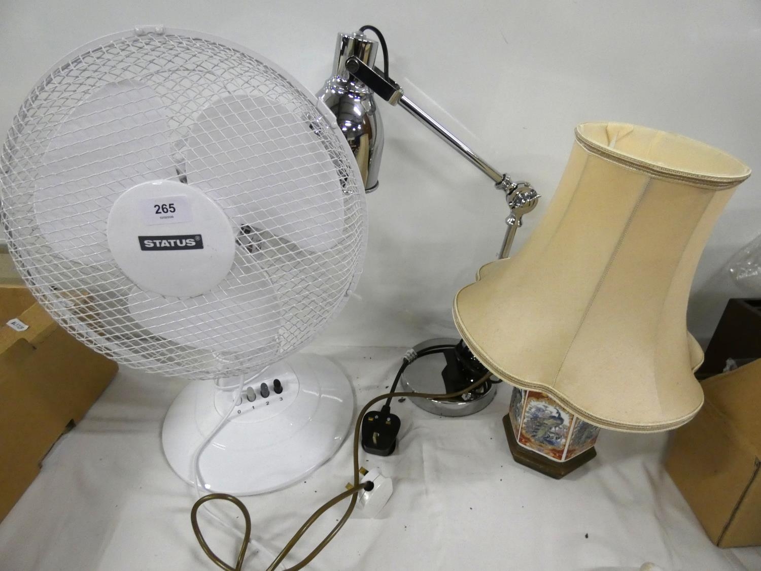 Desk fan and modern angle poise table lamp.