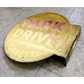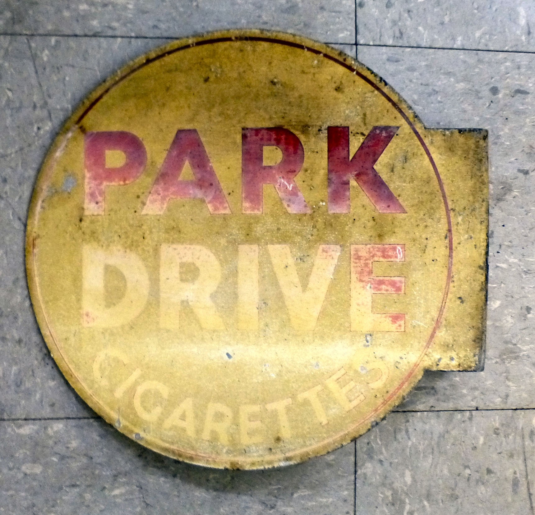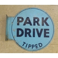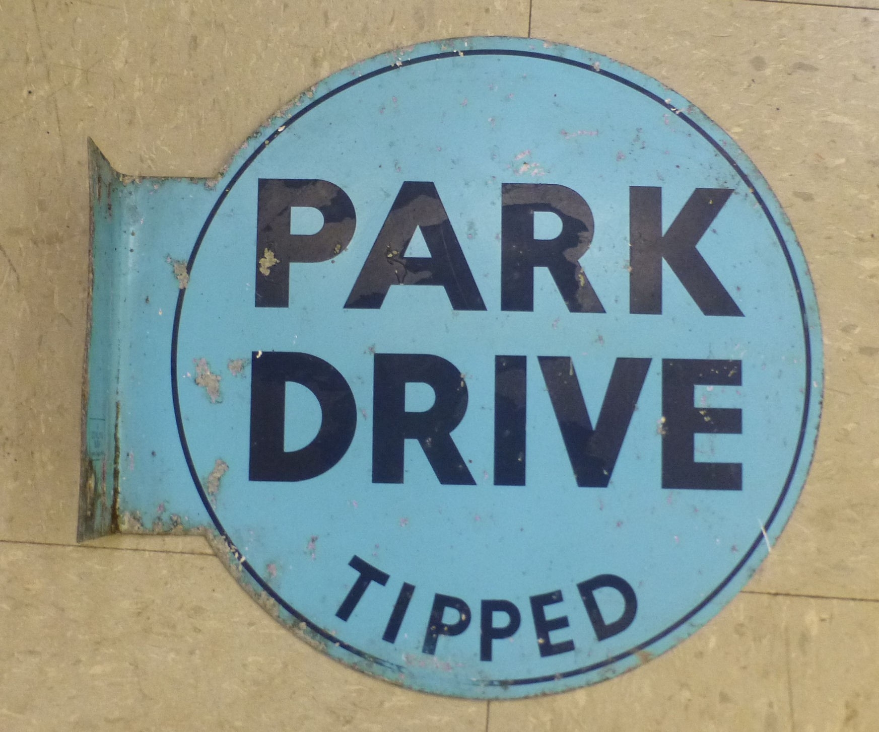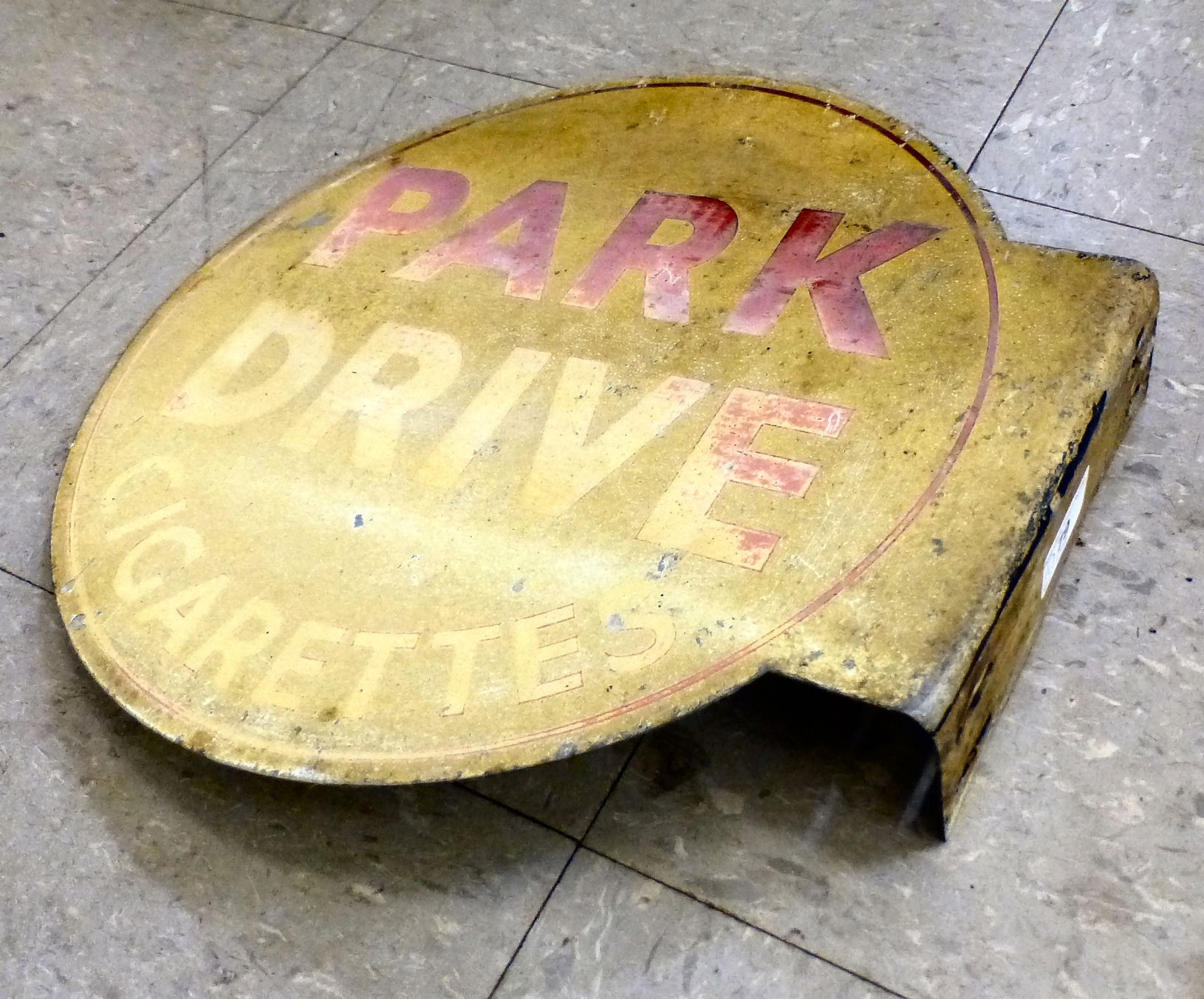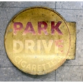 A vintage printed metal two sided sign 'Park Drive Tipped' and 'Park Drive Cigarettes' on the obverse 14"dia