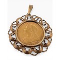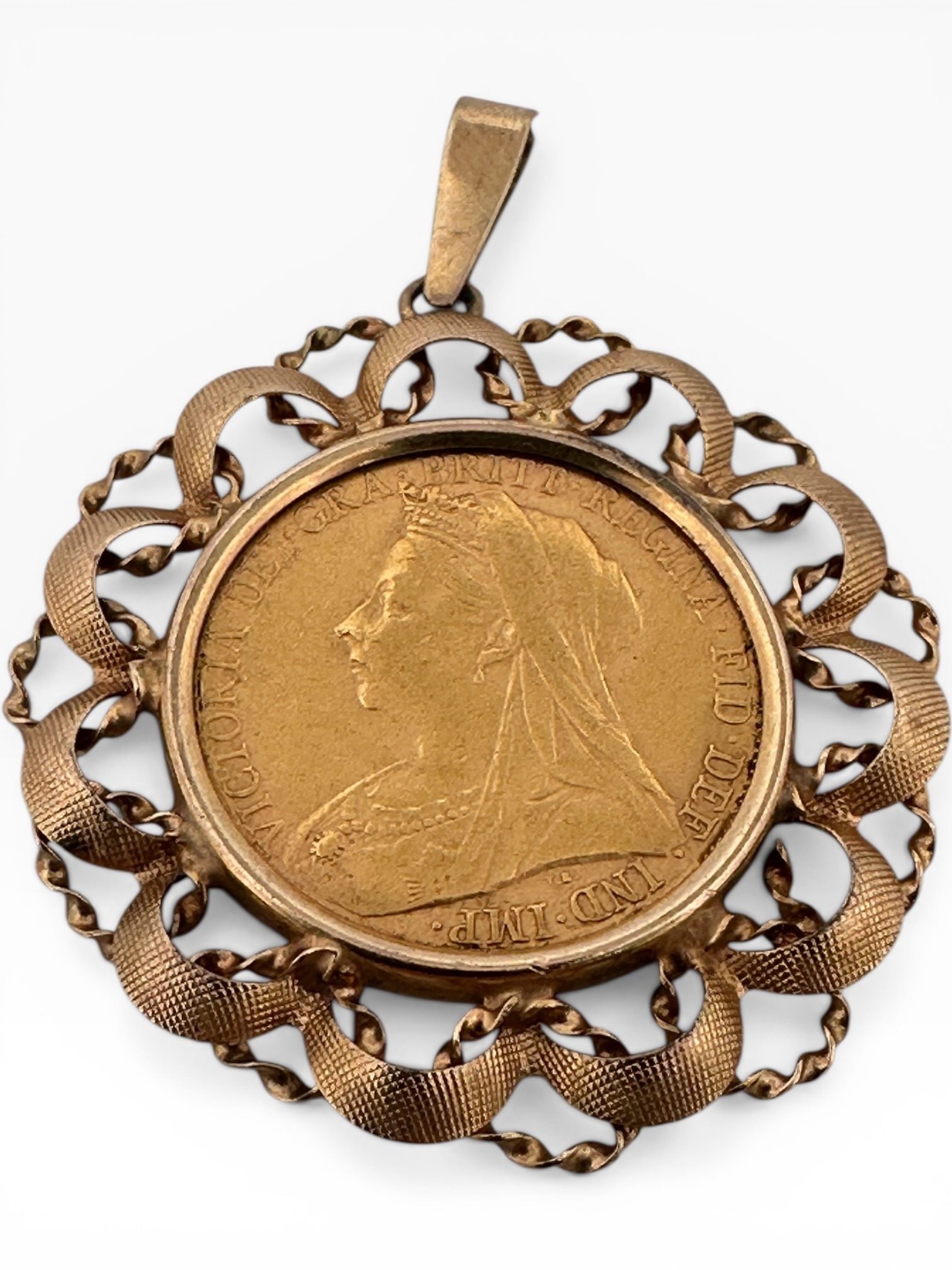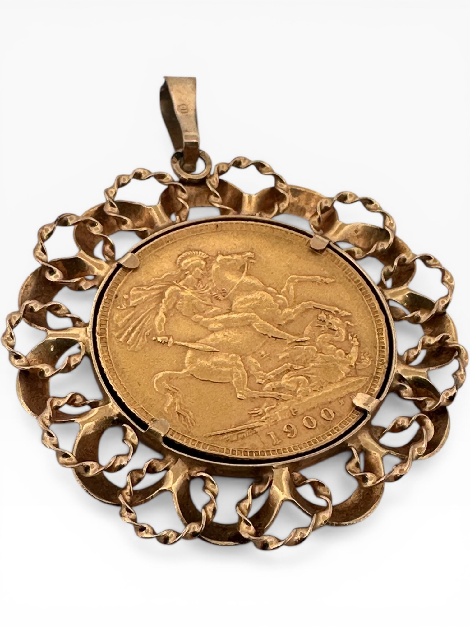 1900 Victoria Full Sovereign in Nine Carat Gold Mount. 10.46g