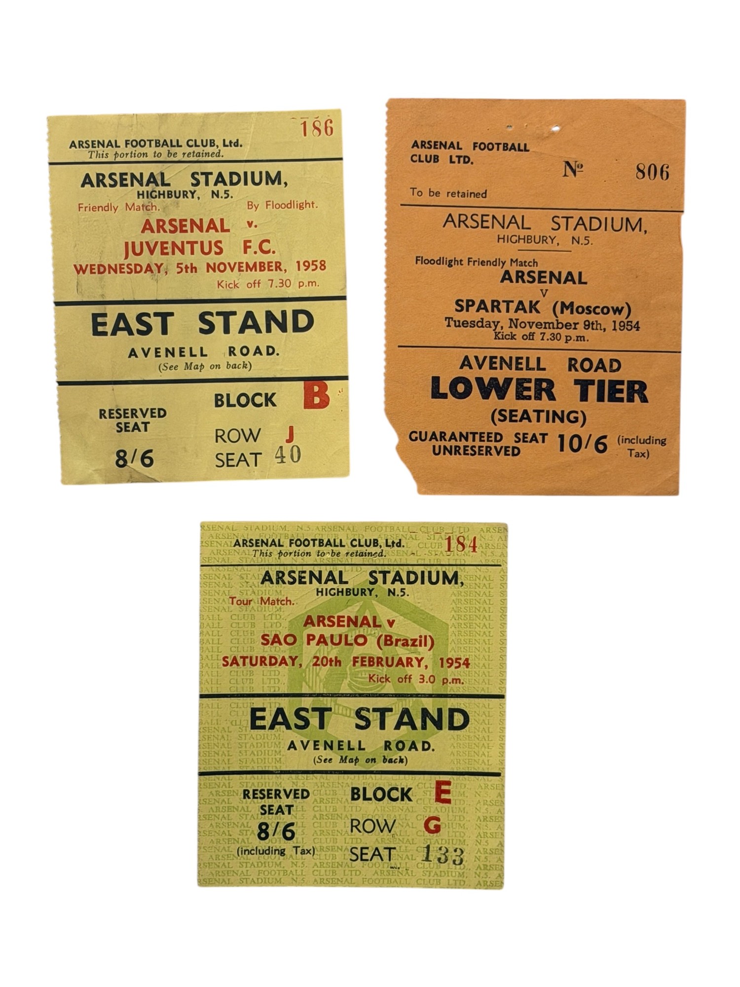 X3 ARSENAL 1950s FRIENDLY FOOTBALL TICKET STUBS, SAO PAULO 20/2/1954, SPARTAK 9/11/1954, JUVENTUS 5/11/1958.
