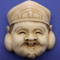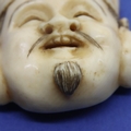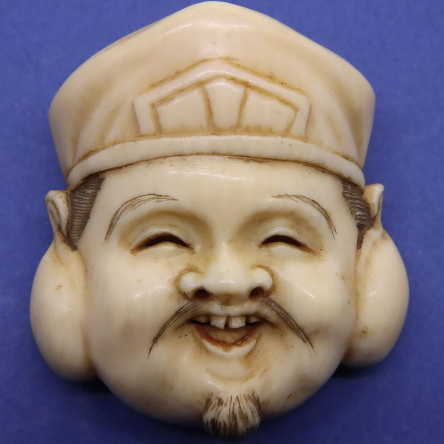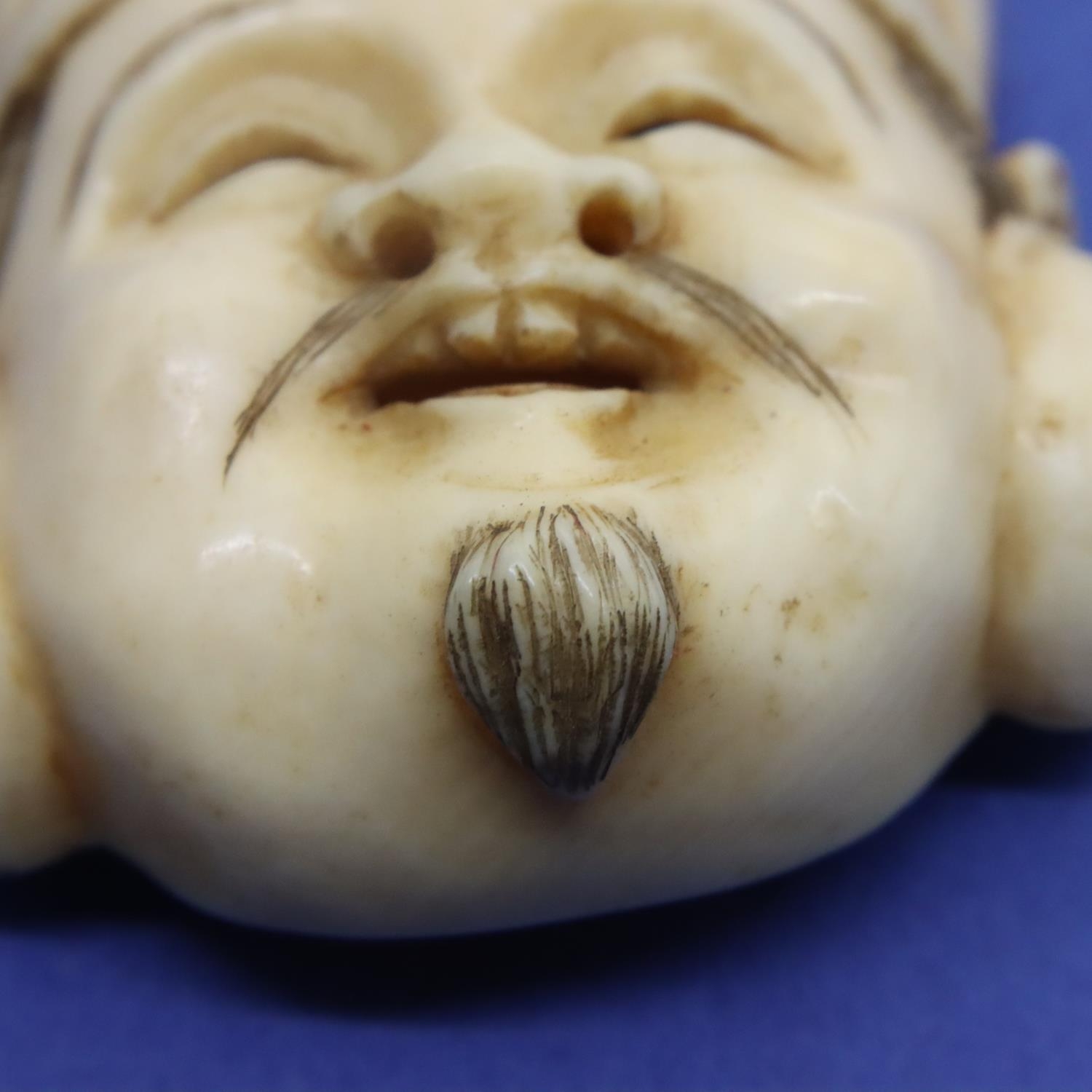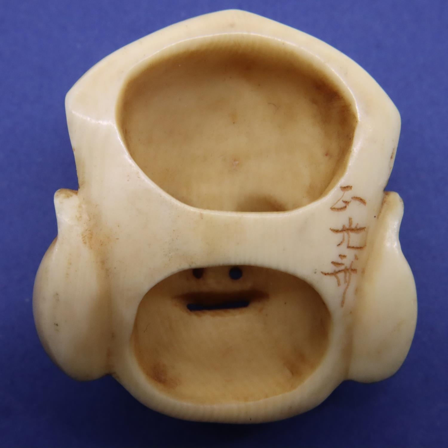 A carved ivory mask with signature verso, H: 42 mm. P&P Group 1 (£14+VAT for the first lot and £1+VAT for subsequent lots)