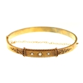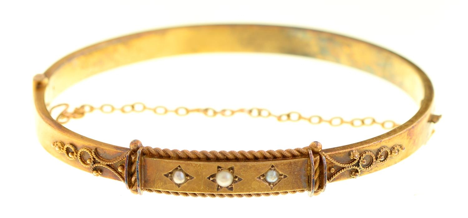 An Edwardian gold bangle, gipsy set with three split pearls, 61mm, unmarked, 9.4g, cased