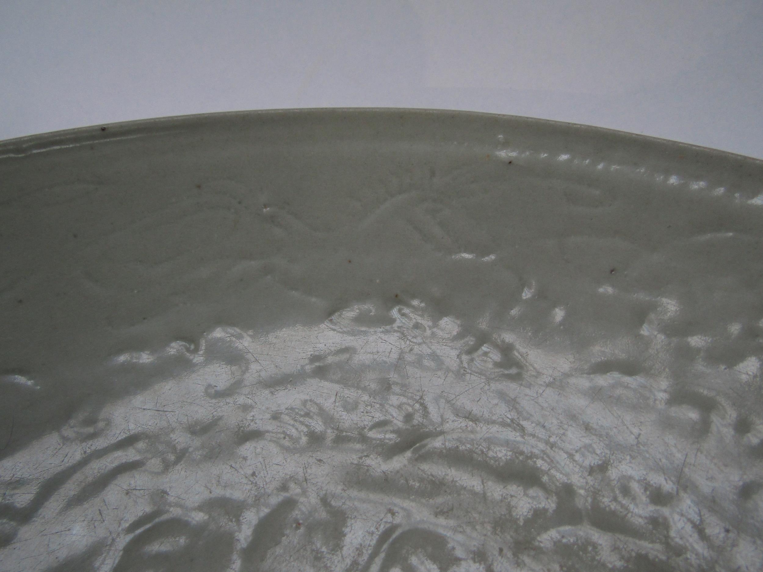 Ming Dynasty (1368-1644) Chinese celadon bowl with incised leaping horse detail, chips to the rim and a hairline crack to the side, 35.5cm diameter top, 8cm deep with 18cm diameter footed base, with a similar tapering vase with concentric ring detail to body, 15cm tall, 12.5cm diameter at the widest point (2) (R) £300